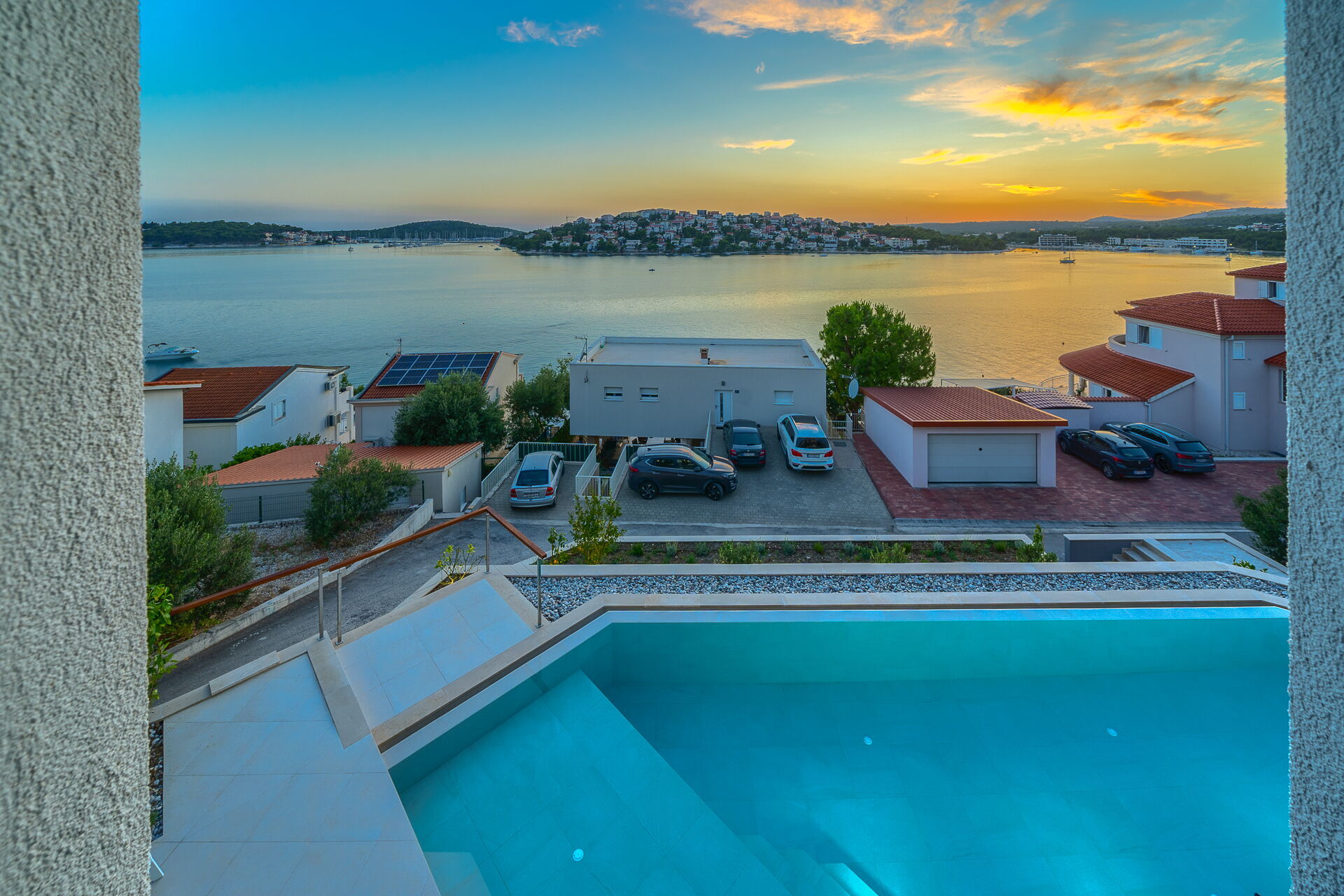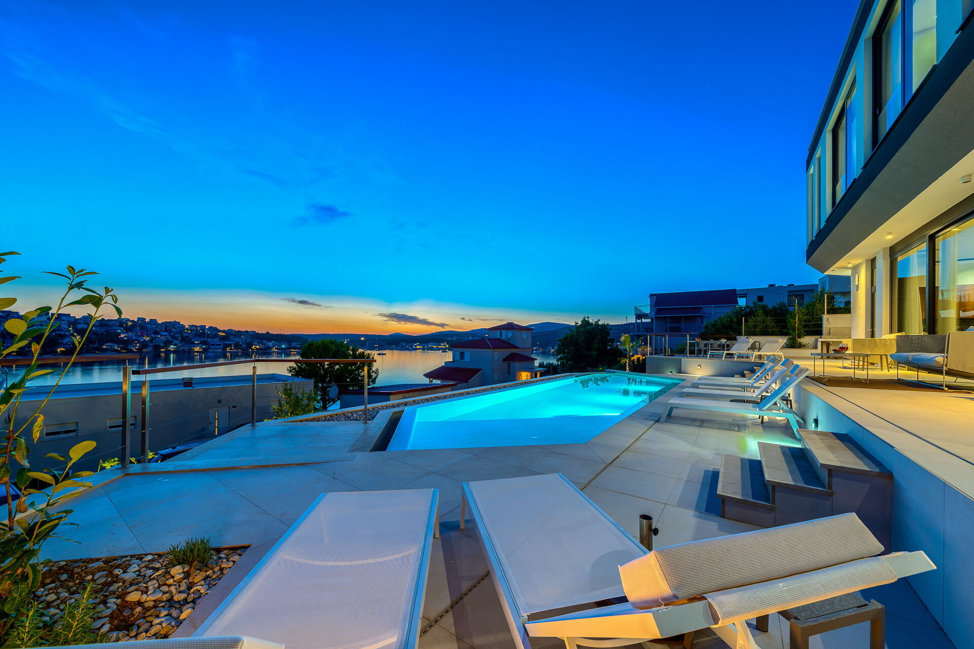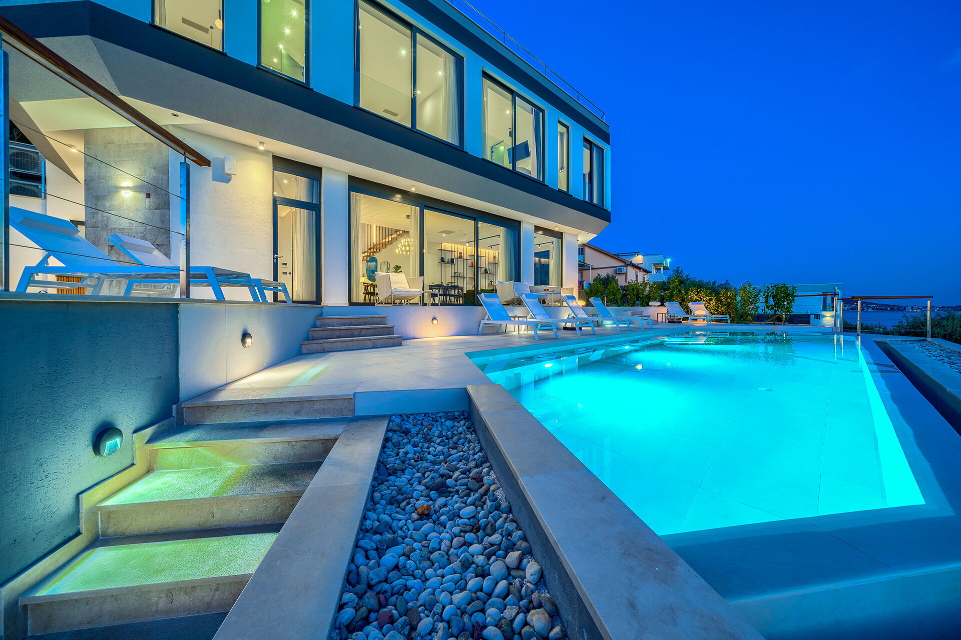 Villa Allina si sviluppa su due piani e al primo piano dispone di una fantastica terrazza solarium dove è stata inserita l’elegante piscina riscaldabile e dove avrete la possibilità di godervi incantevoli tramonti sul mare.