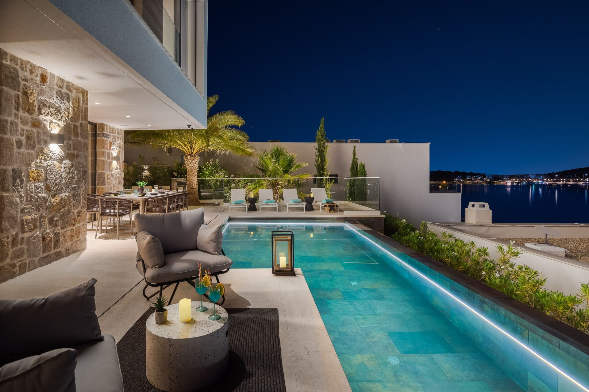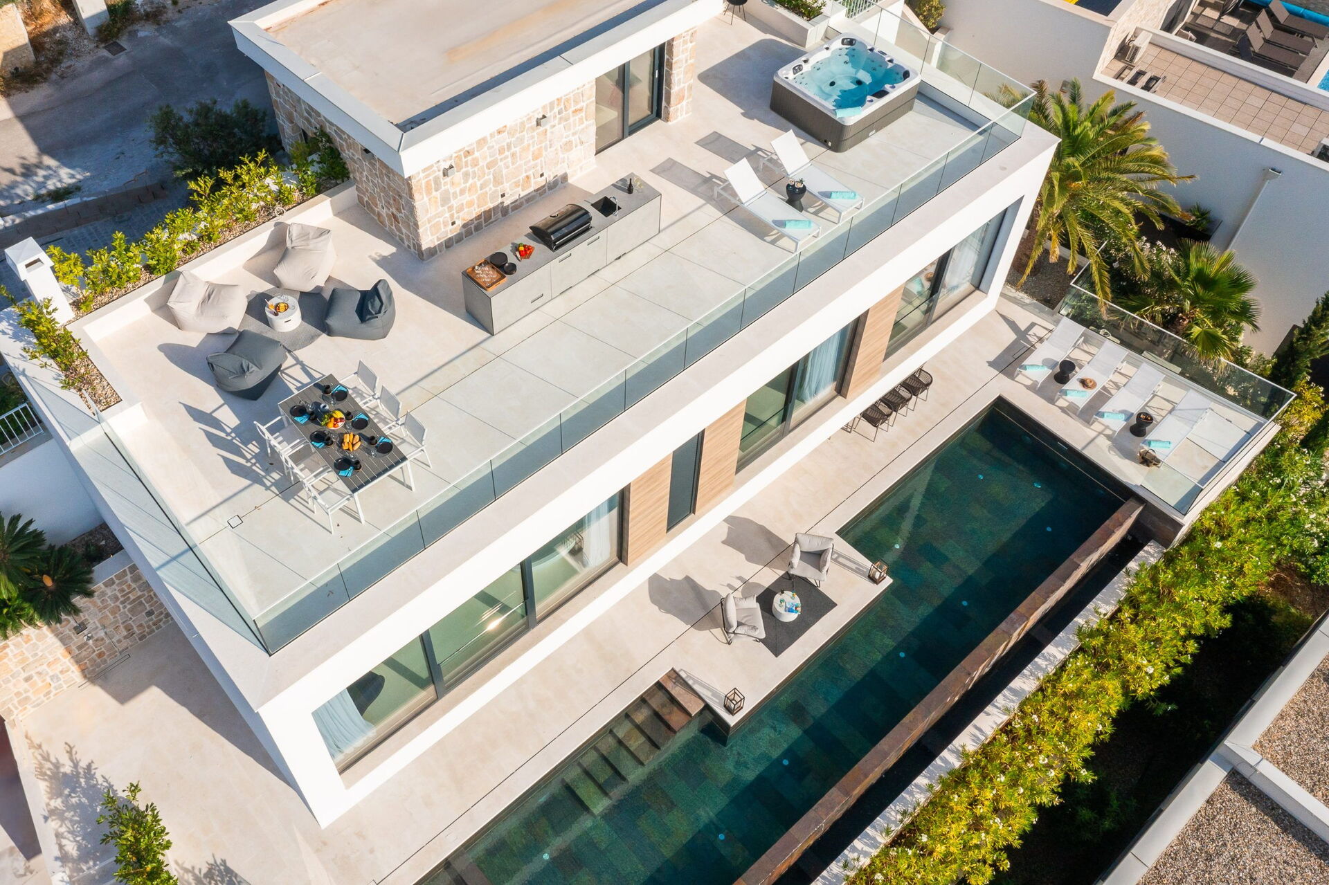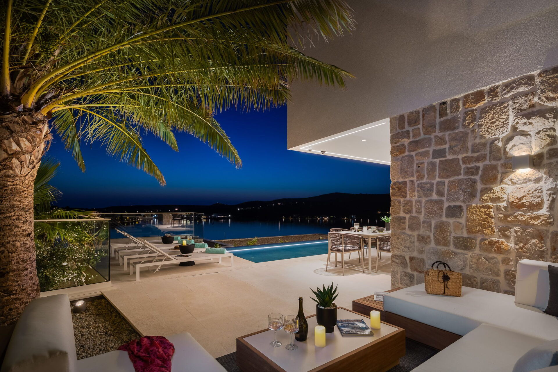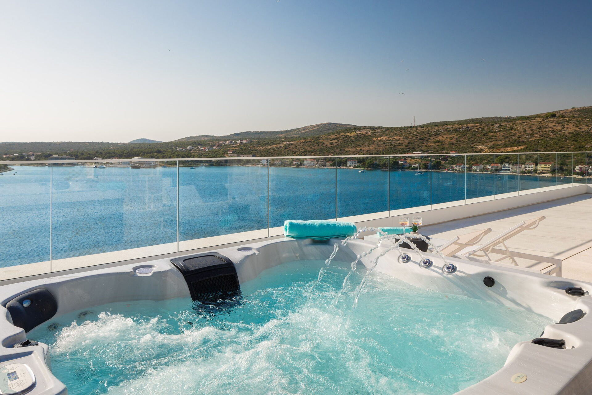 Le panoramiche zone esterne offrono numerose aree comuni e permettono agli ospiti di trascorrere un piacevole soggiorno in famiglia o tra amici, rilassandosi nella terrazza sul tetto attrezzata per mangiare all’aperto con cucina esterna e barbecue e vasca idromassaggio Jacuzzi, o nell’ ampia zona piscina a sfioro riscaldabile con vista mare ideale per trascorrere indimenticabili momenti sotto il sole della Croatia.