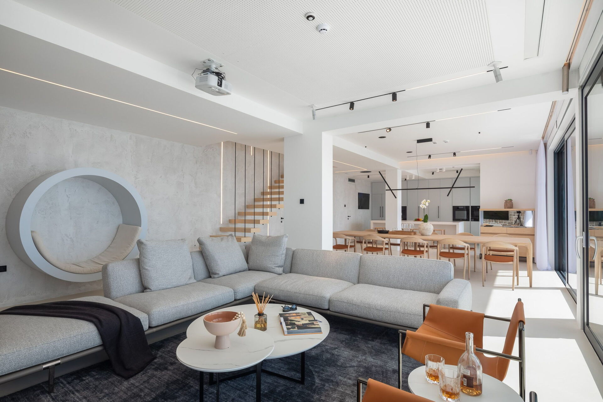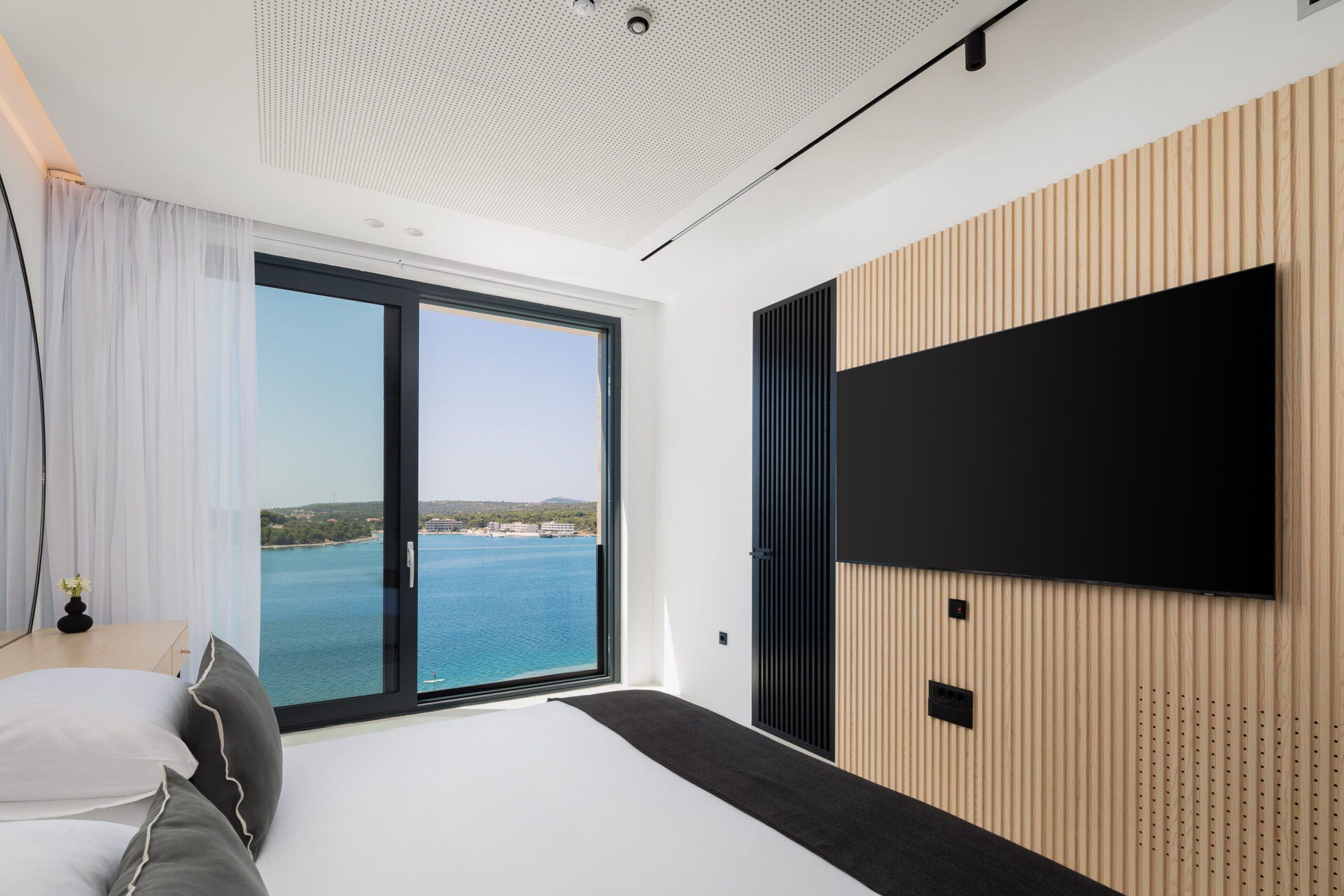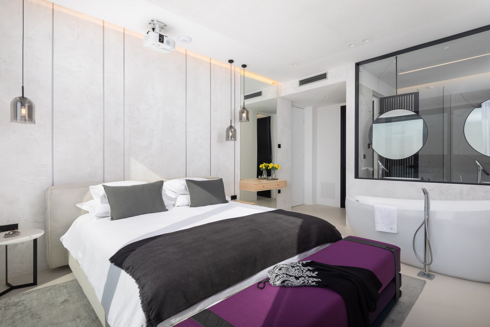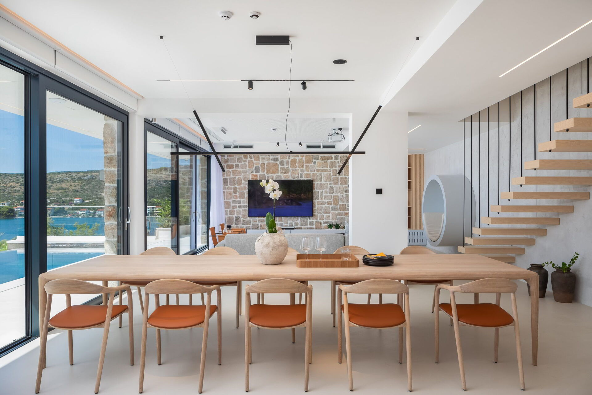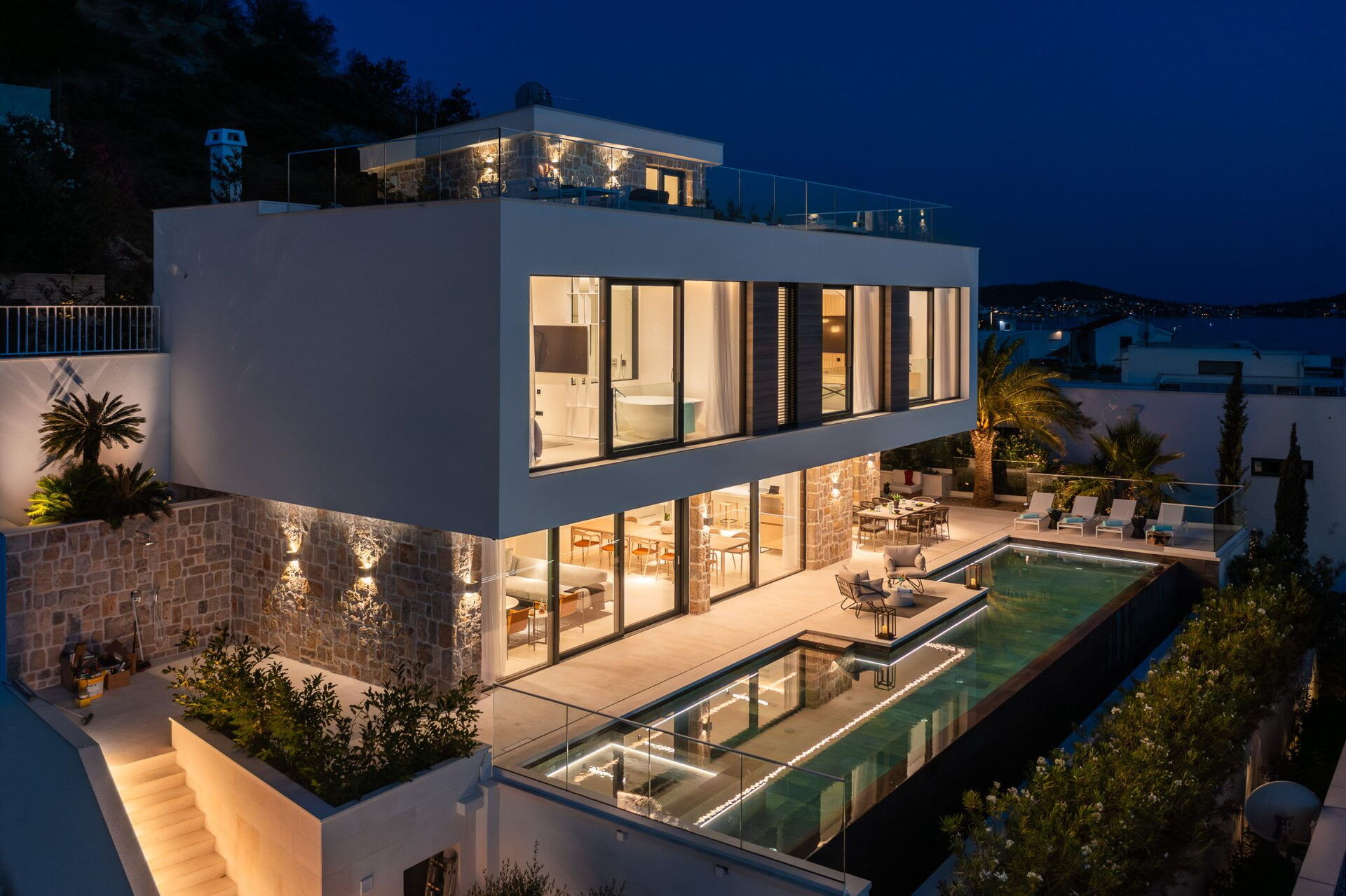 Le panoramiche zone esterne offrono numerose aree comuni e permettono agli ospiti di trascorrere un piacevole soggiorno in famiglia o tra amici, rilassandosi nella terrazza sul tetto attrezzata per mangiare all’aperto con cucina esterna e barbecue e vasca idromassaggio Jacuzzi, o nell’ ampia zona piscina a sfioro riscaldabile con vista mare ideale per trascorrere indimenticabili momenti sotto il sole della Croatia.