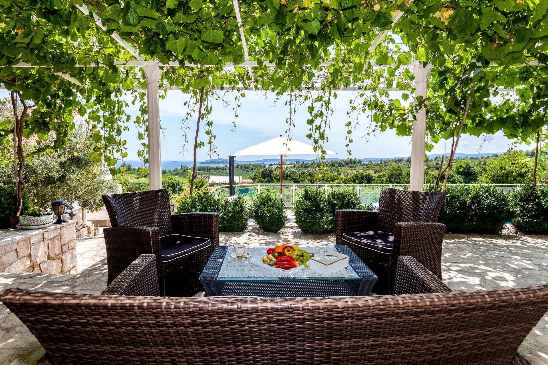 La posizione collinare e panoramica offre a tutti coloro che soggiornano presso Villa Azurit una incredibile vista sul mare, che dista poco meno di un chilometro, sia dalla bella piscina, che dalla Jacuzzi “homemade” incastonata tra le pietre, sia dalle zone relax che dai pergolati attrezzati per mangiare all’aperto.