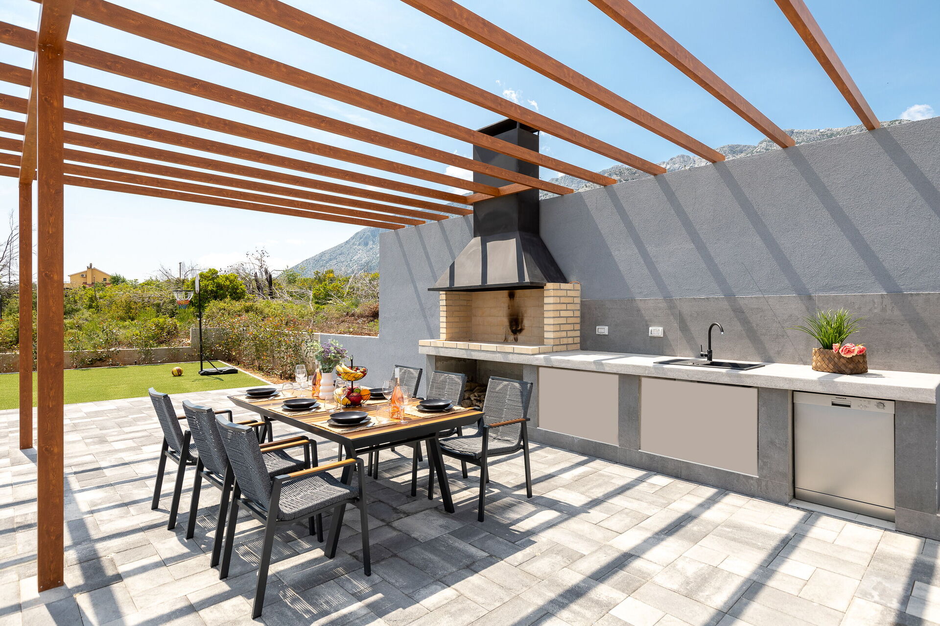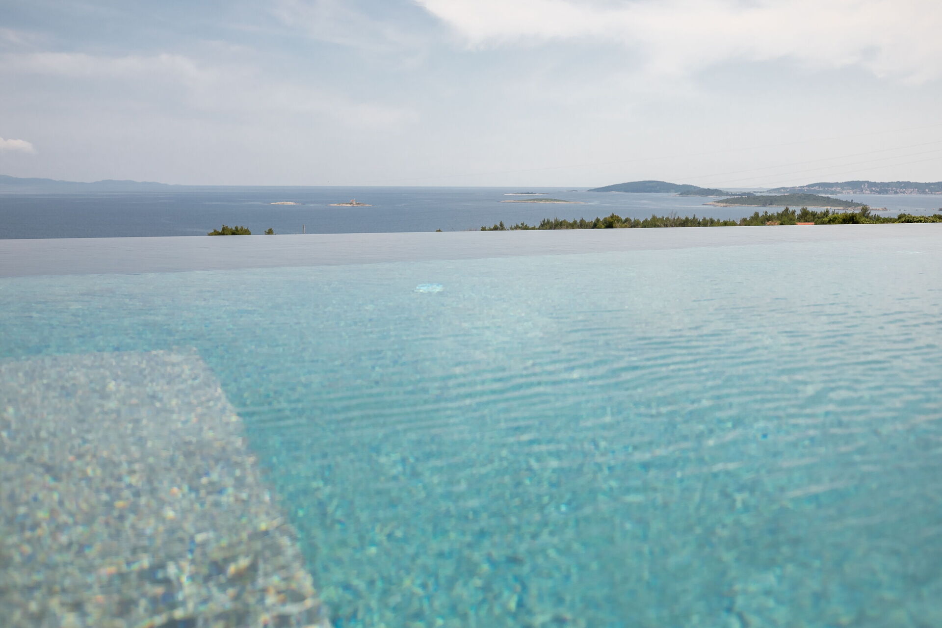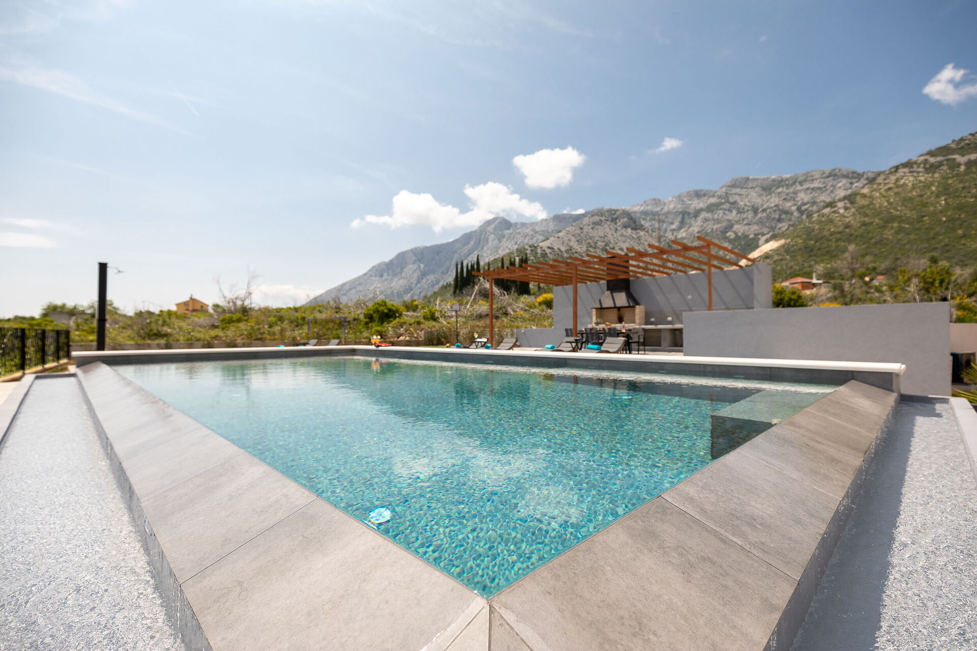 La stessa vista mozzafiato si ha anche dalla zona piscina composta da una elegante piscina a sfioro e da un secondo pergolato, il quale ospita una moderna cucina esterna con barbecue e lavastoviglie ed una ulteriore con zona pranzo. L’intera area è su un ampio patio pavimentato.