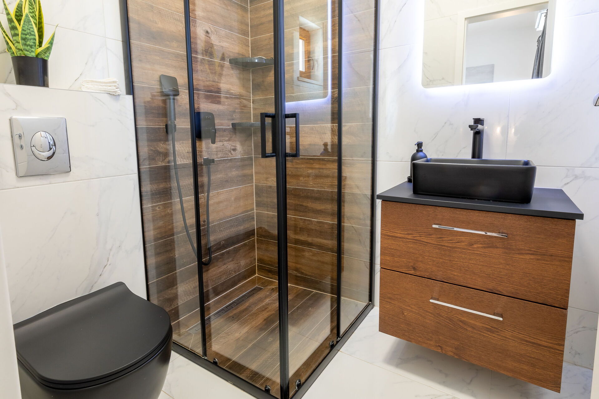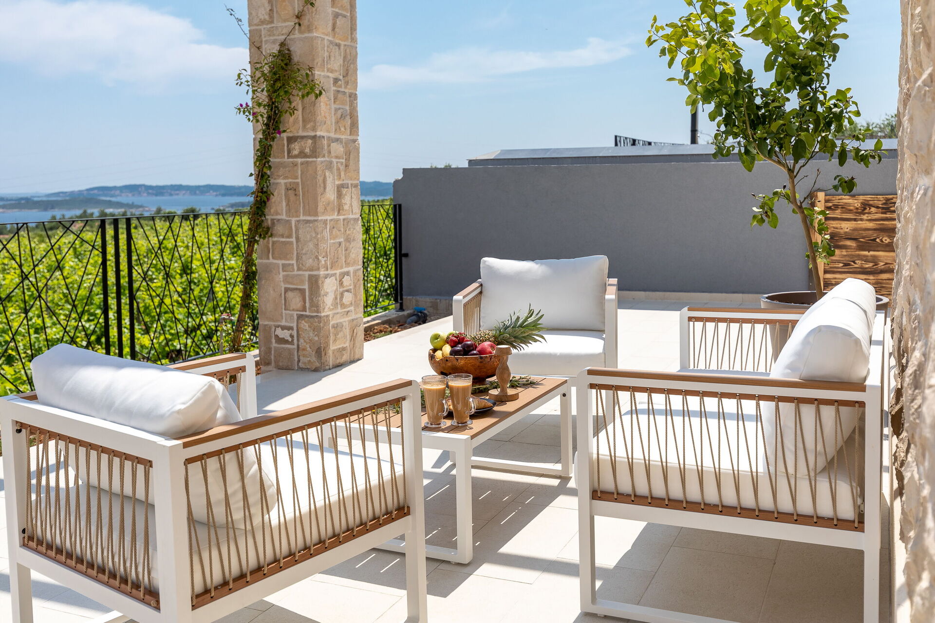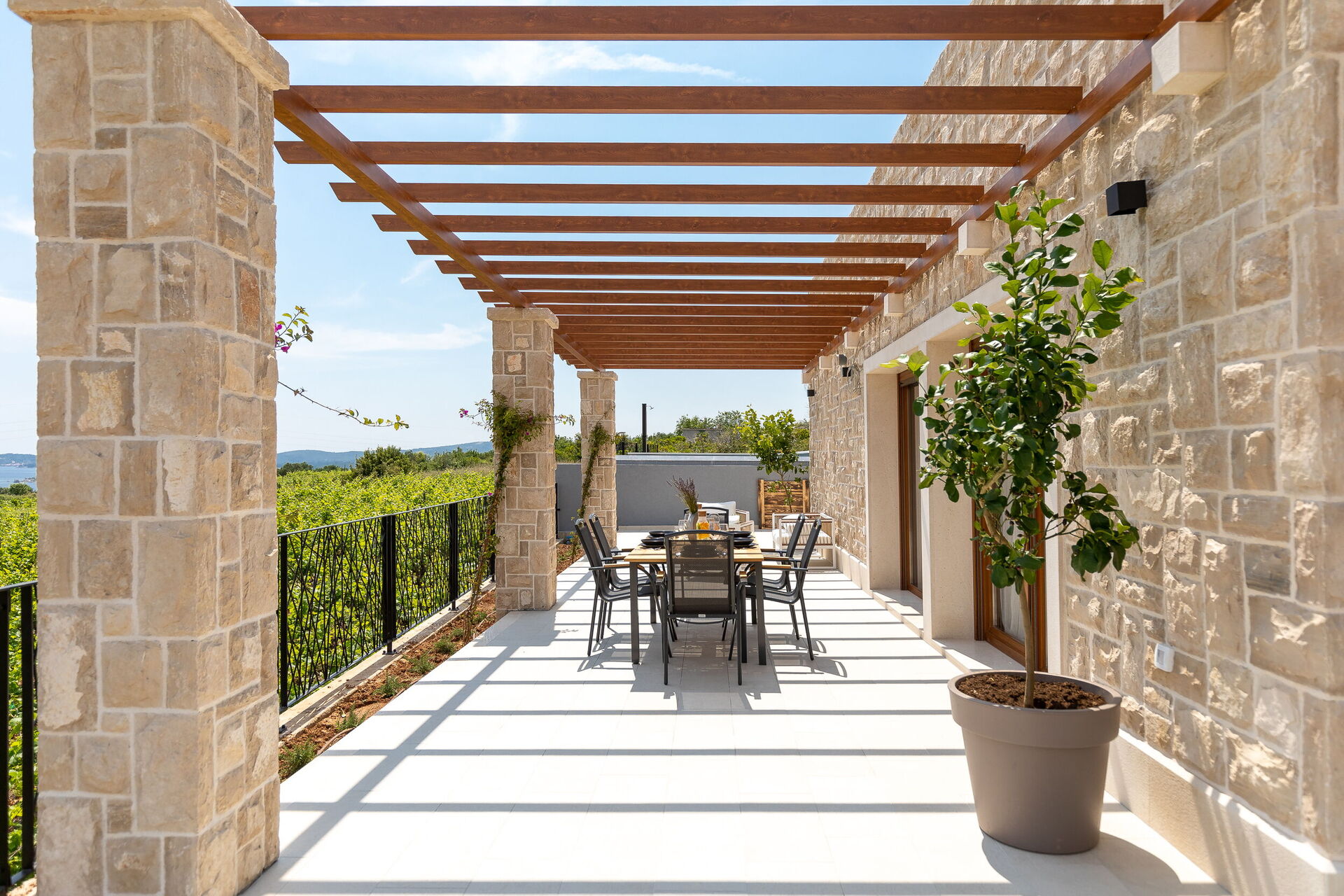 La stessa vista mozzafiato si ha anche dalla zona piscina composta da una elegante piscina a sfioro e da un secondo pergolato, il quale ospita una moderna cucina esterna con barbecue e lavastoviglie ed una ulteriore con zona pranzo. L’intera area è su un ampio patio pavimentato.
