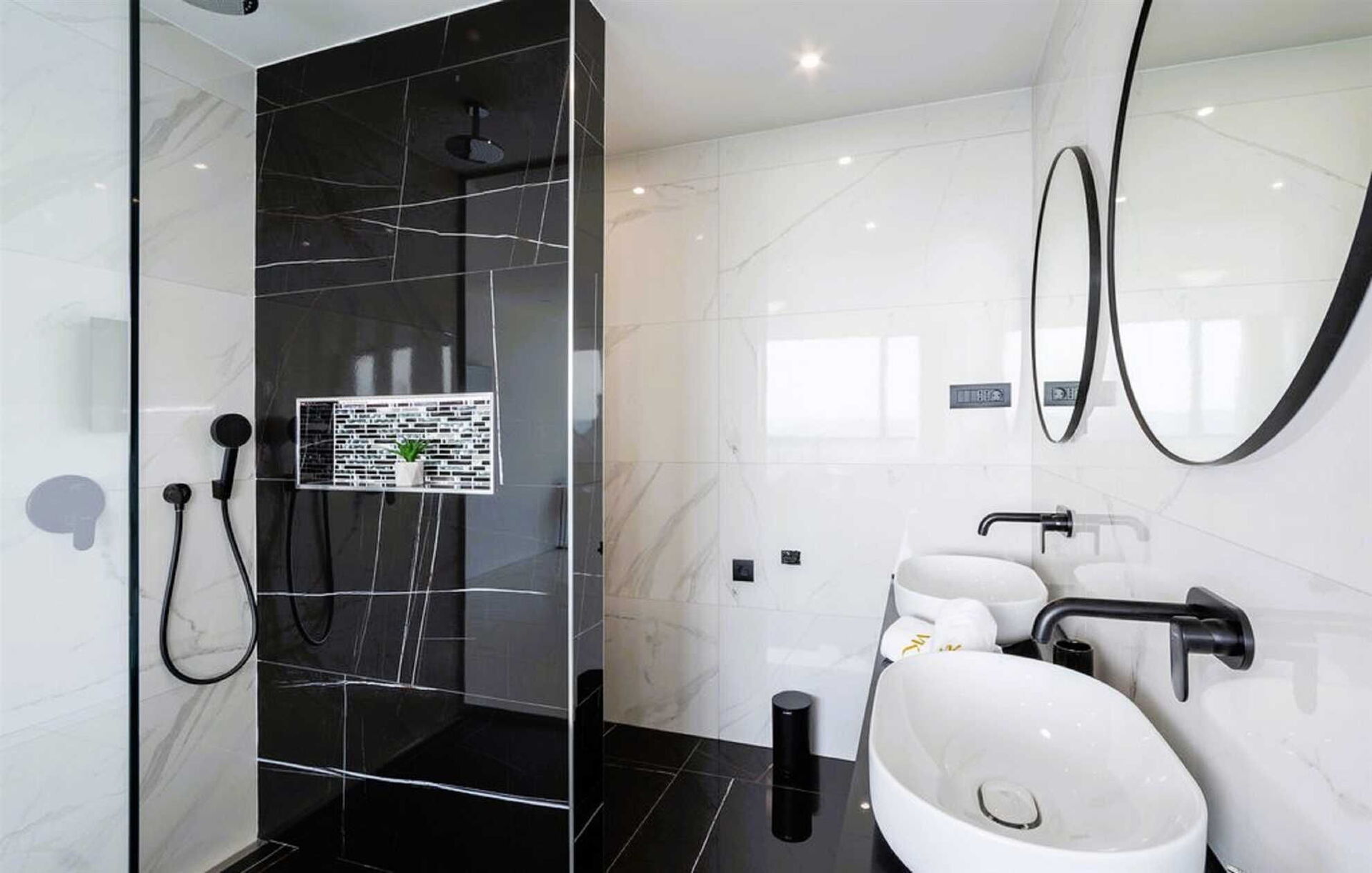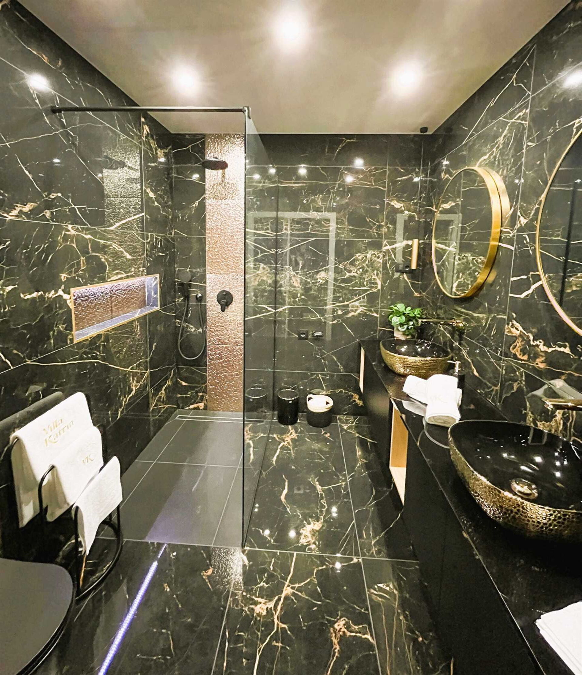 Primo piano: 3 camere matrimoniali con accesso al balcone, 3 bagni con doccia, camera matrimoniale con bagno privato con doccia e vasca da bagno in camera.