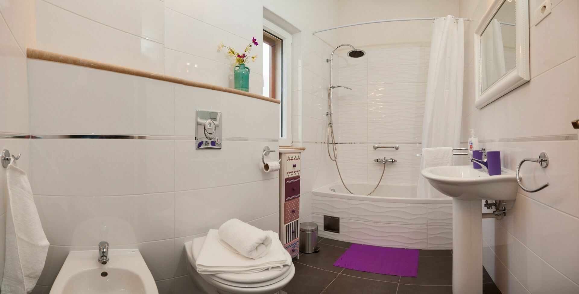 Soggiorno con zona pranzo e cucina, 2 camere entrambe con letto matrimoniale e bagno privato con doccia, camera con 2 letti singoli e bagno privato con vasca.