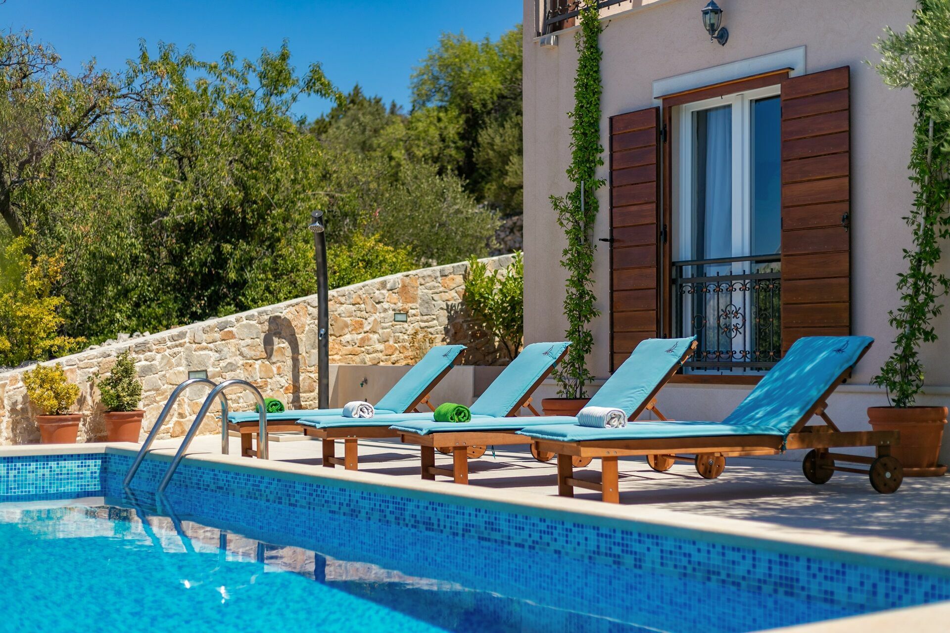 Questa splendida villa è circondata da un bel giardino, disposto su più livelli, che ospita anche una piscina riservata all'uso degli ospiti con lettini e ombrelloni: è il luogo ideale per rilassarsi insieme ad amici e familiari.
