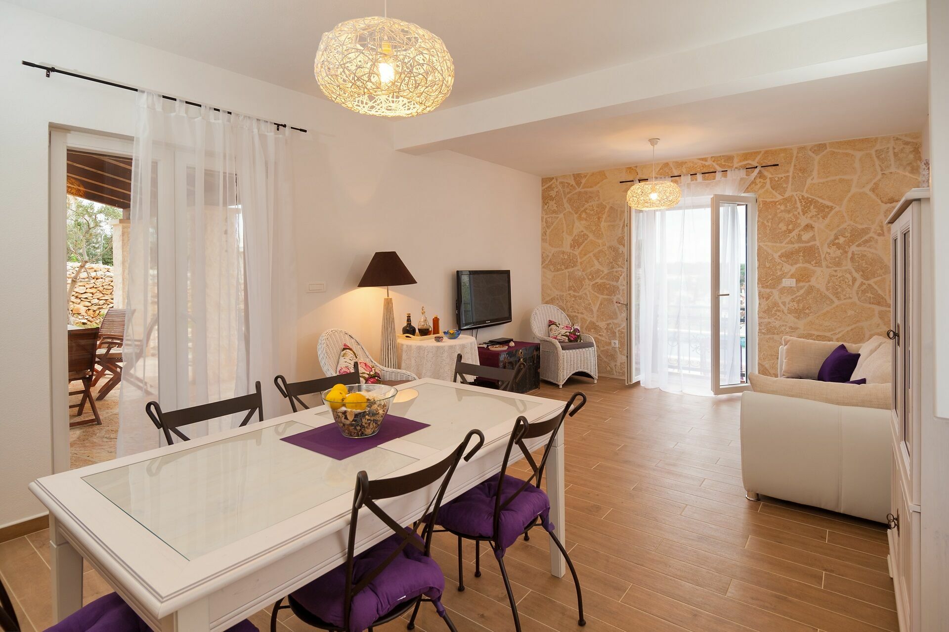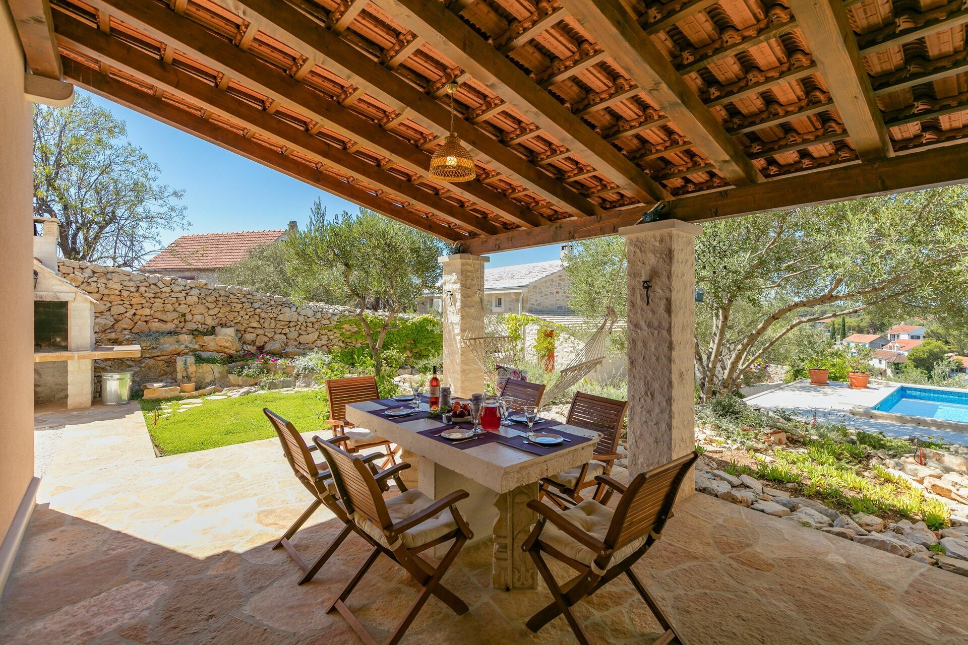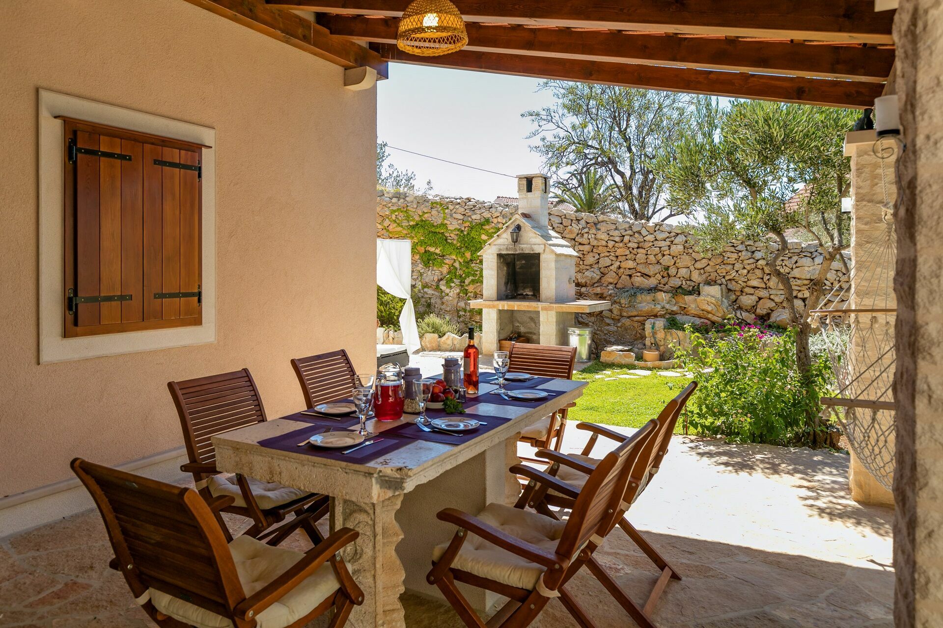 Un'area pranzo esterna posta sotto il porticato della casa vi permetterà di organizzare i vostri pasti all'aperto e di godervi una vista panoramica mozzafiato sulla baia di Milna.