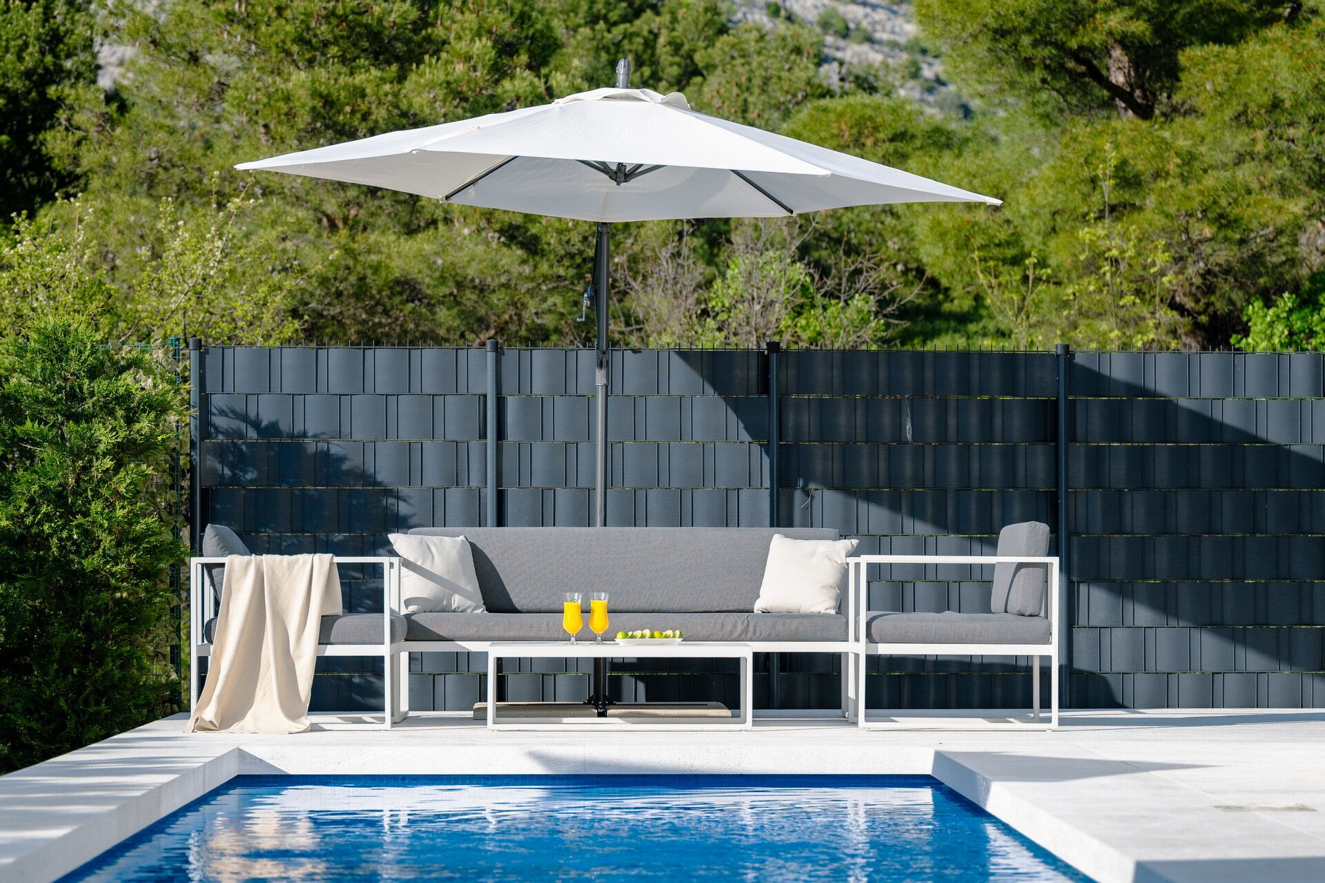 L’architettura innovativa della struttura si riflette anche all’esterno con la particolare posizione e forma della piscina (riscaldabile su richiesta e con un prezzo a consumo), della jacuzzi (anch’essa riscaldabile, ma senza costi extra) e del barbecue; offrendo anche un’ampia veranda coperta con zona pranzo e zona relax.