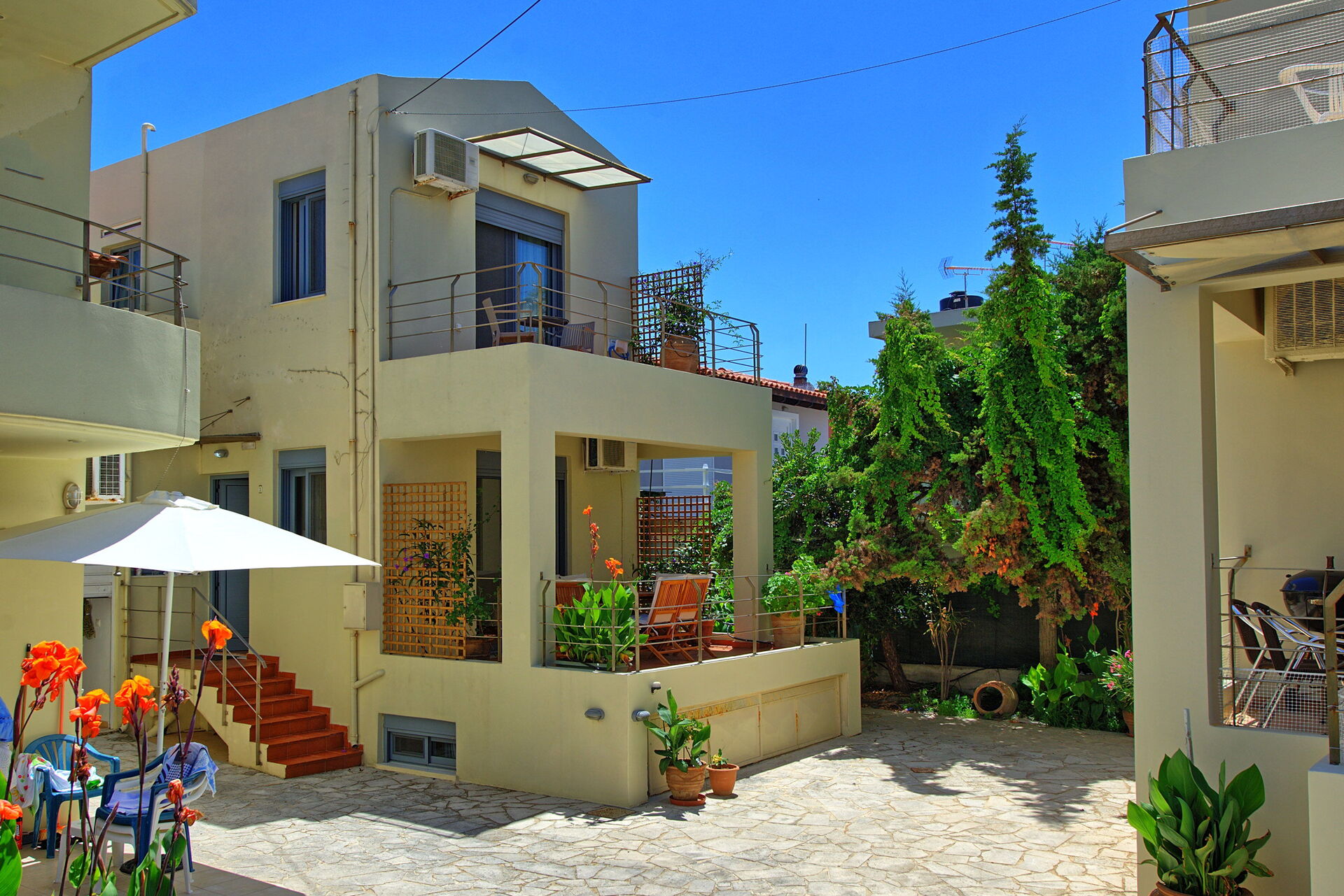 An ideal villa in the centre of Almyrida, steps from the beach. This was an ideal home for our family vacation. The basement room was great for my teenage sons whilst the upstairs bedrooms had bright views from their balconies.