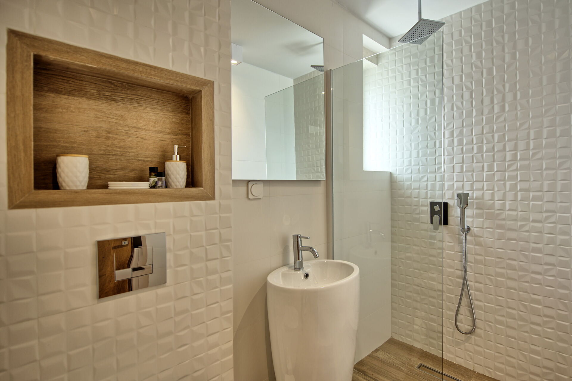 Primo piano: camera matrimoniale (aria condizionata) con accesso a balcone, camera con letto alla francese, bagno con doccia.