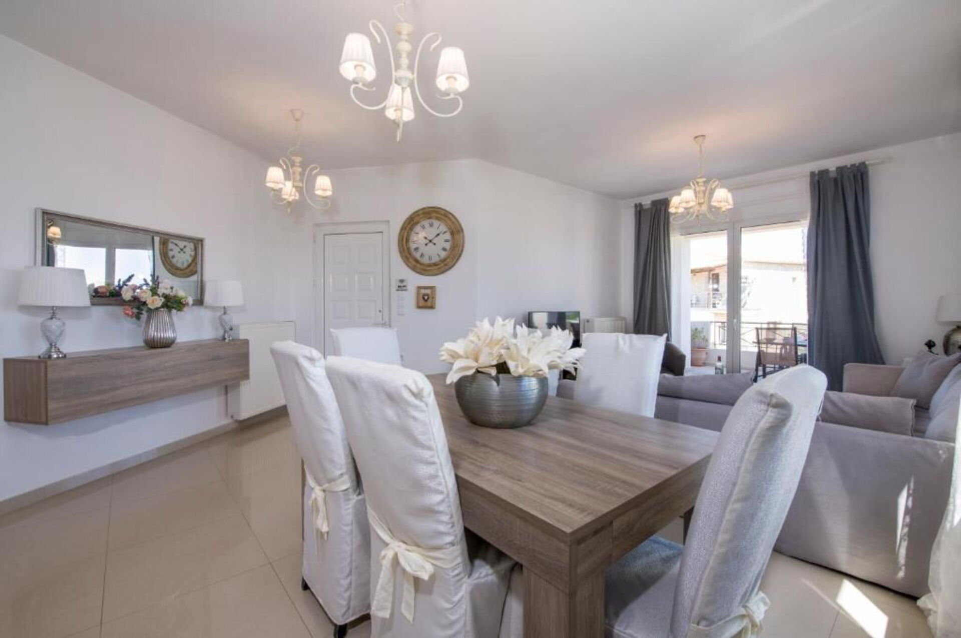 Dal luminoso soggiorno si accede ad una terrazza attrezzata con tavolo e sedie per mangiare all’aria aperta.