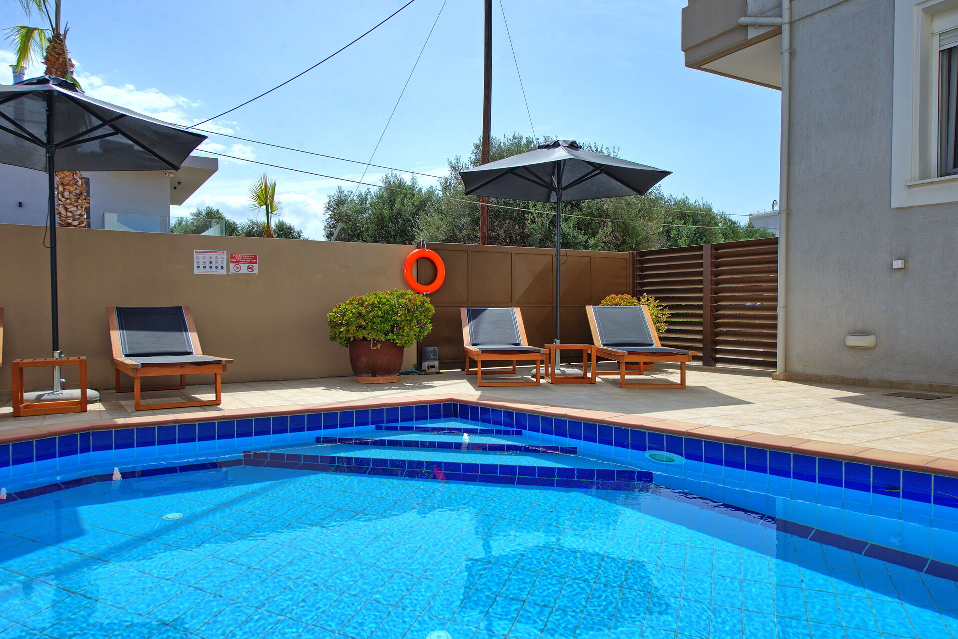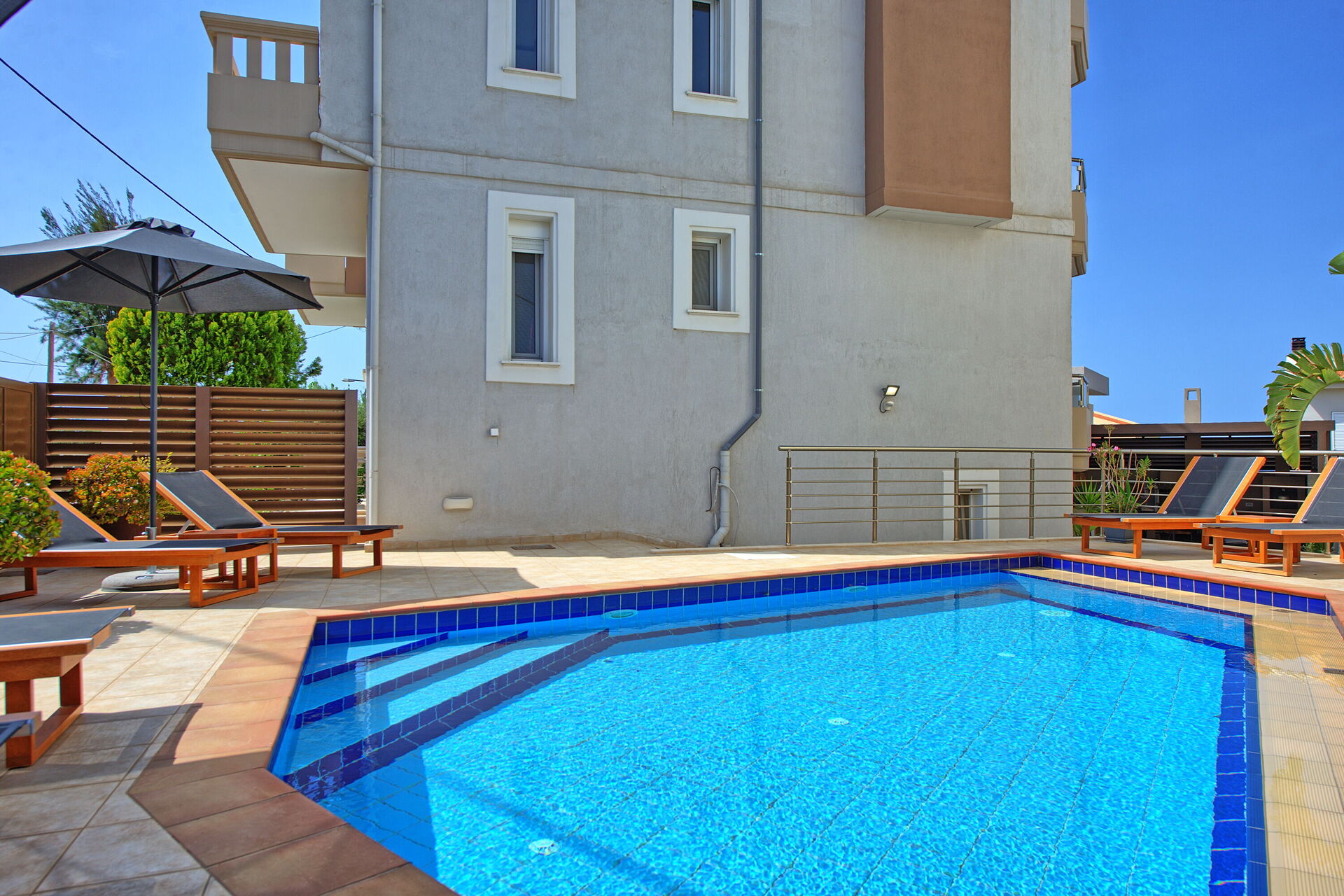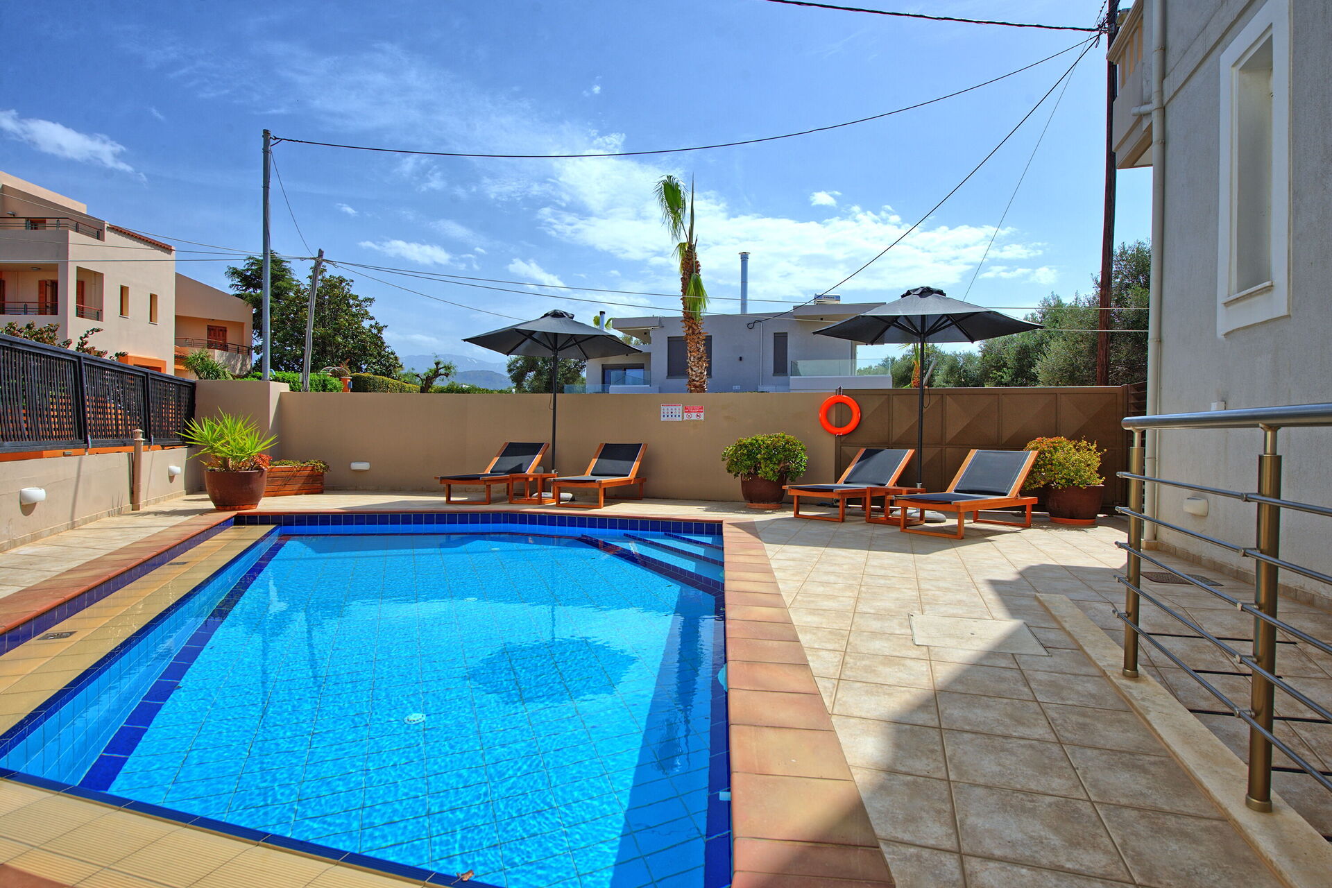 The pool looks great, sunbeds are there, and there is also a barbecue with a terrace that looks cool.