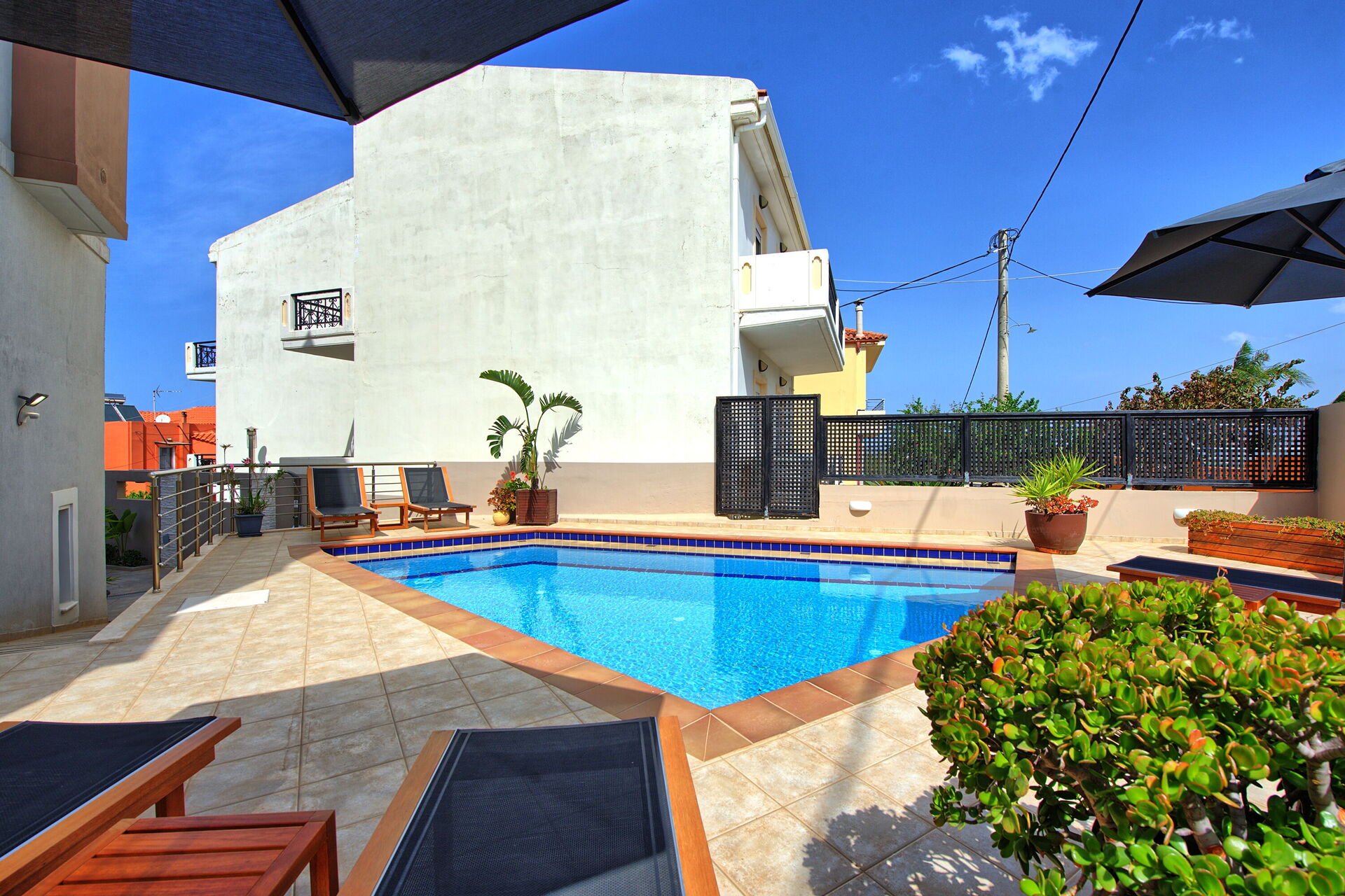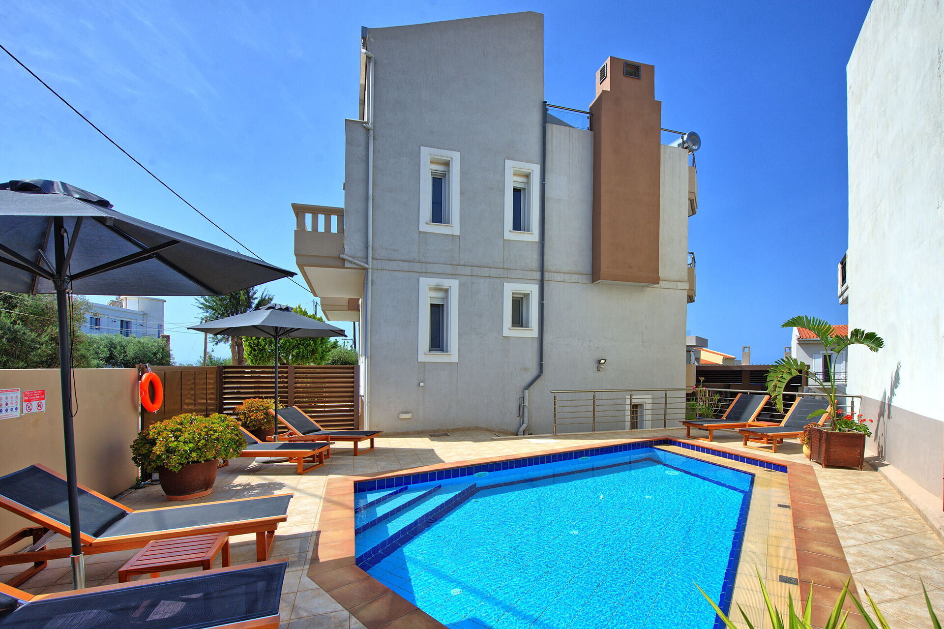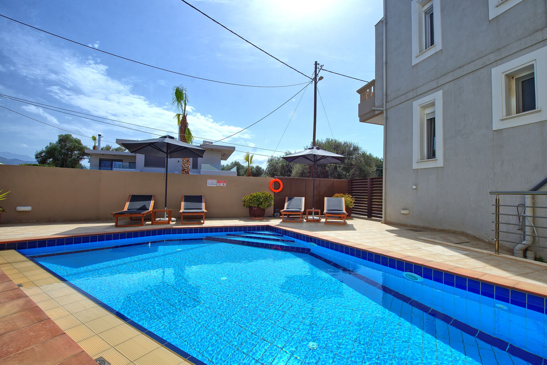 The pool looks great, sunbeds are there, and there is also a barbecue with a terrace that looks cool.