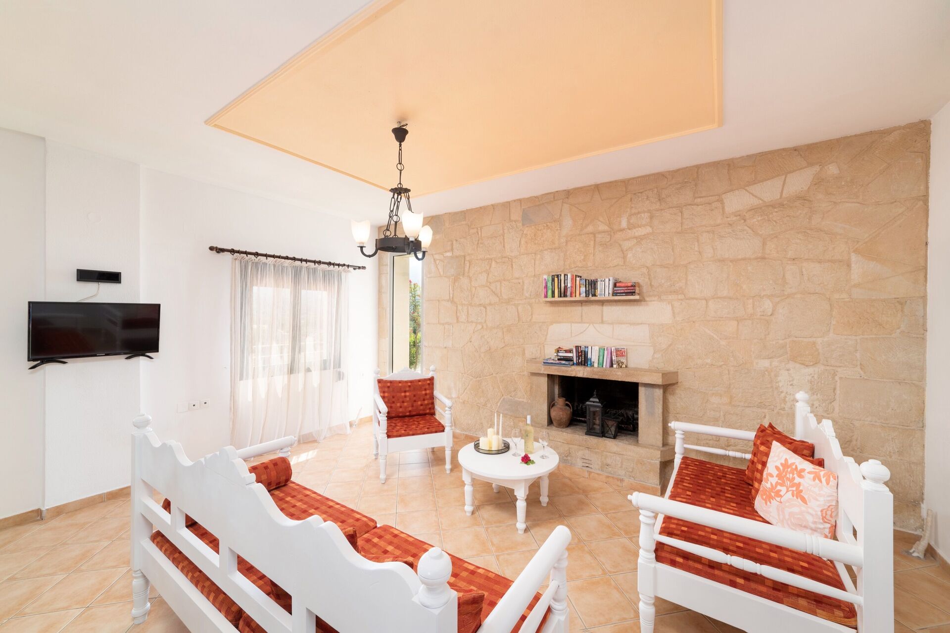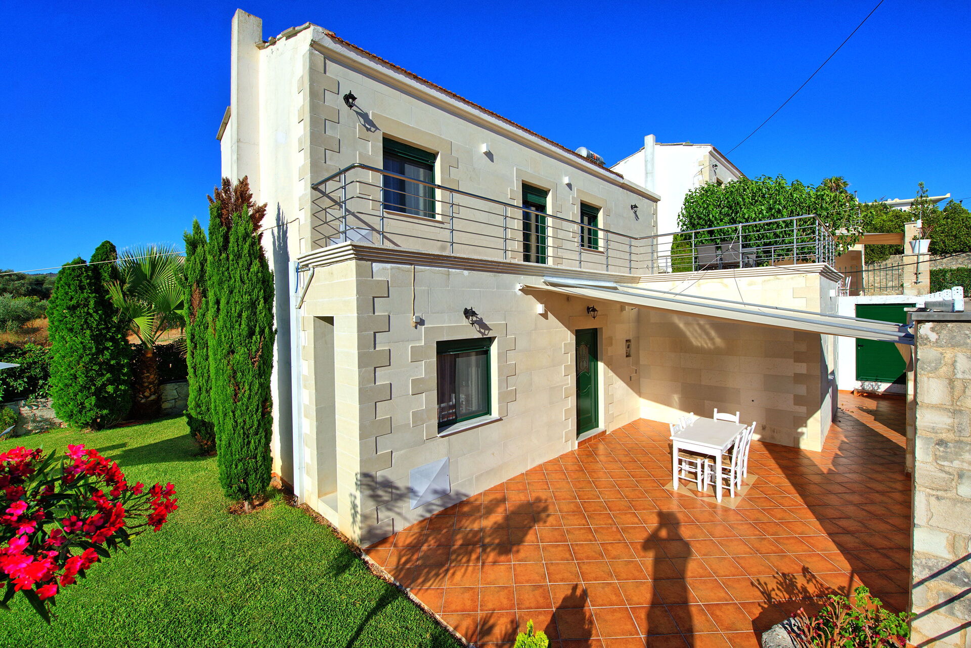 La villa è molto confortevole e ideale per una vacanza in famiglia o tra amici. Internamente si sviluppa su due piani e gli interni sono climatizzati ed arredati con gusto e stile facendo uso di pietre locali e tradizionali elementi Cretesi.