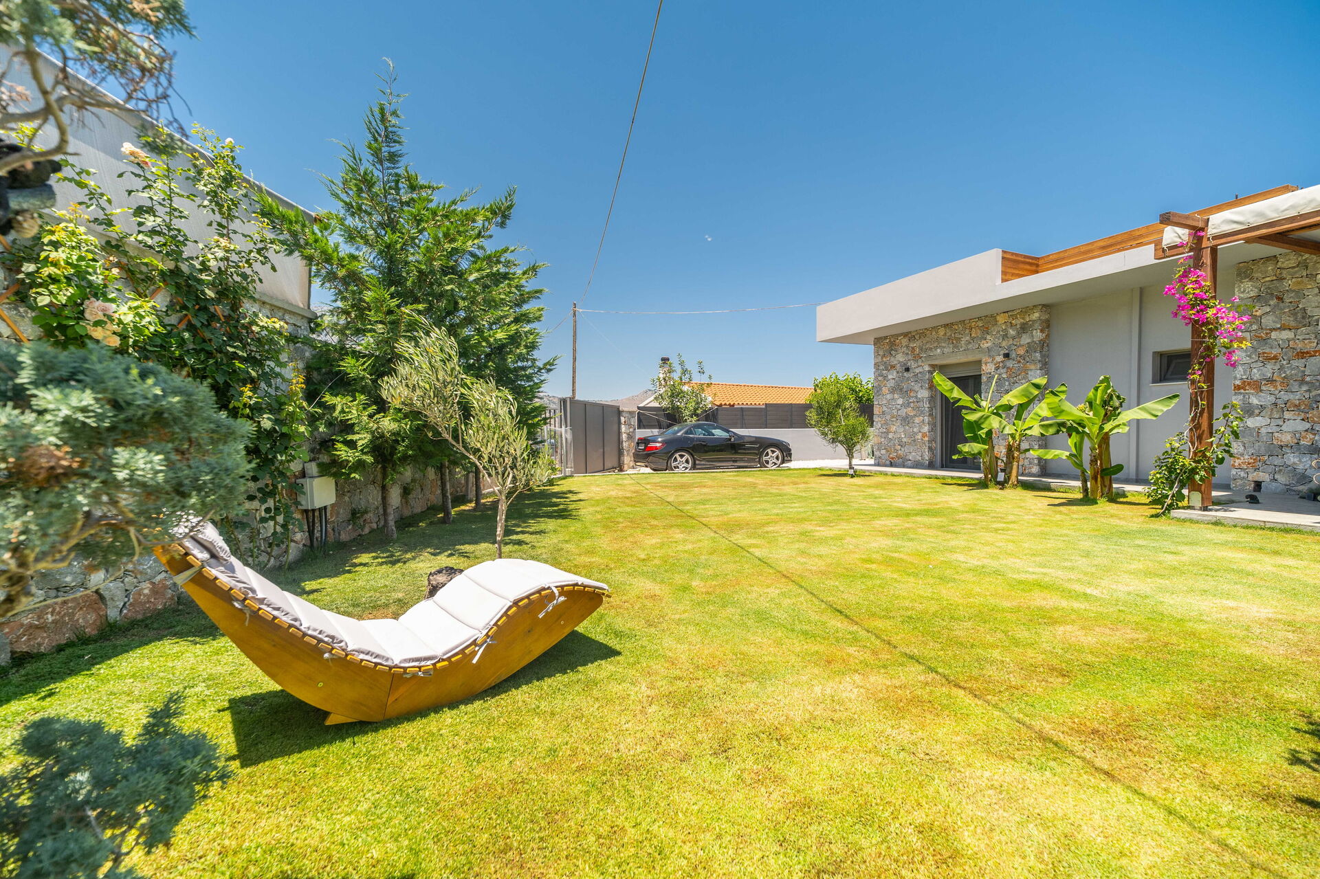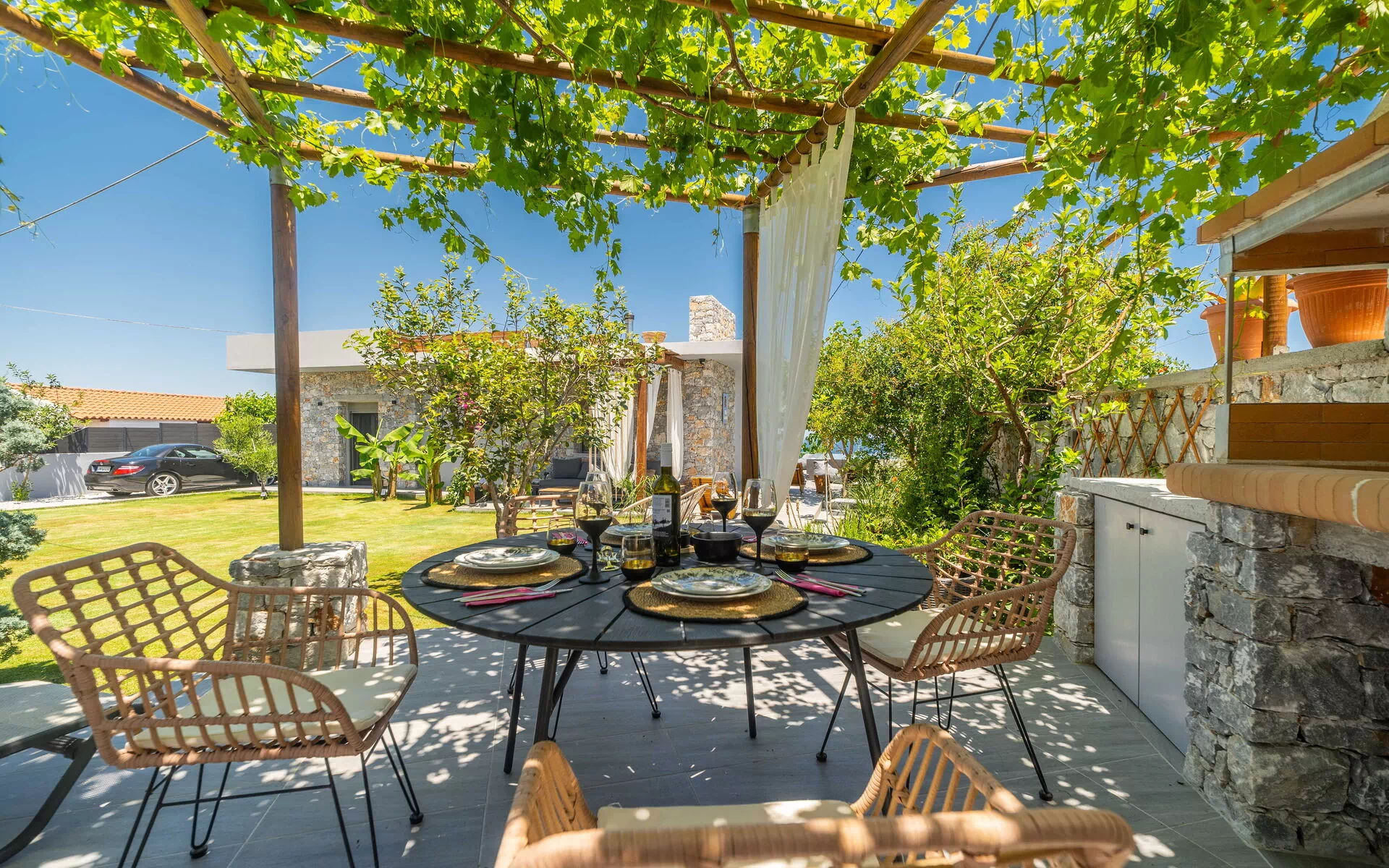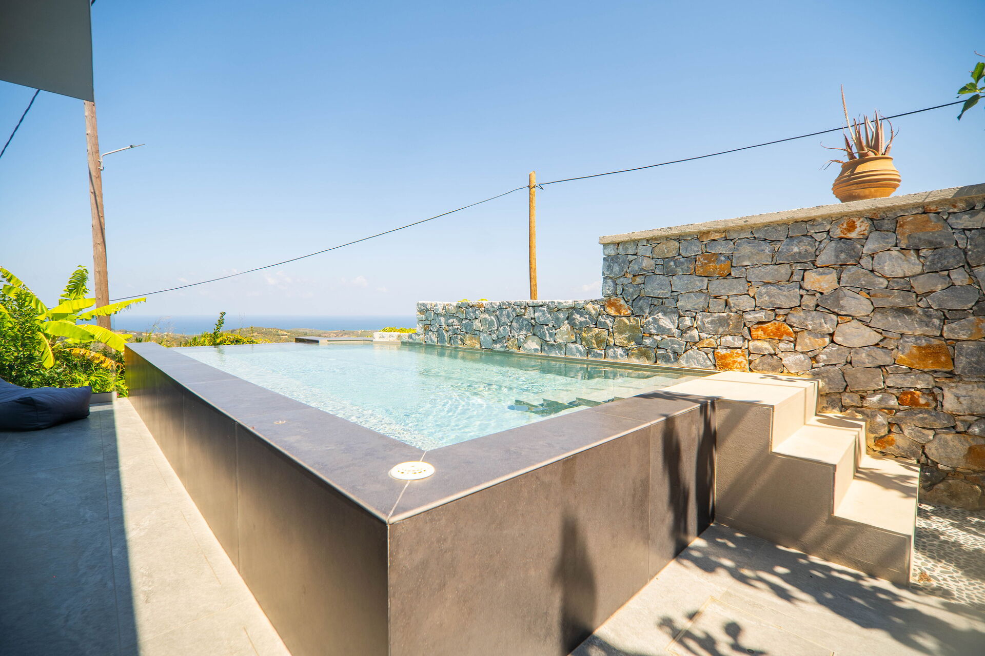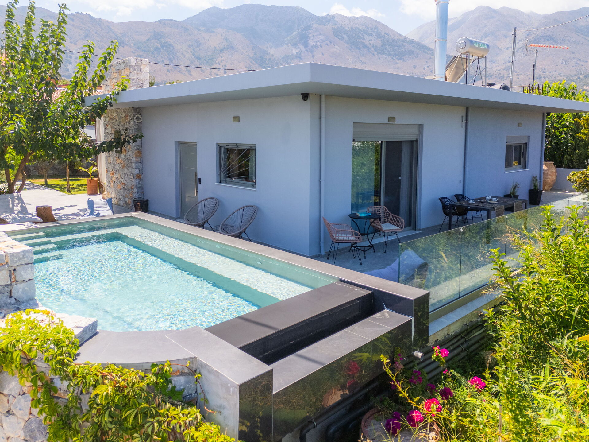 Esternamente Villa Katrina offre un giardino con una zona attrezzata con barbecue e tavolo per mangiare all’aperto e una piscina privata con angolo idromassaggio (riscaldabile su richiesta) dove potersi rinfrescare nelle soleggiate giornate estive; una splendida vista panoramica sul paesaggio circostante che spazia fino al mare e su fantastici tramonti completa il quadro della proprietà.