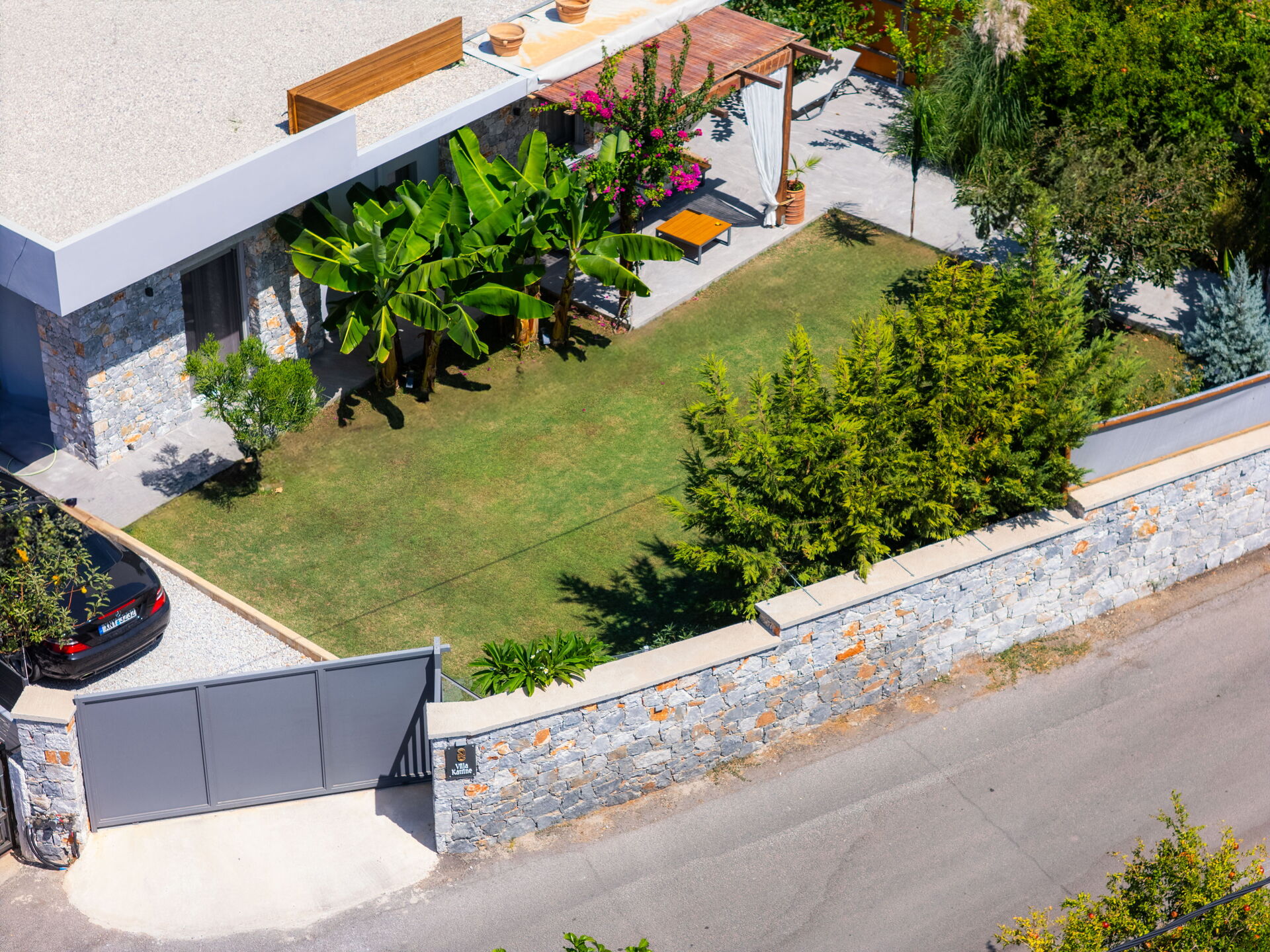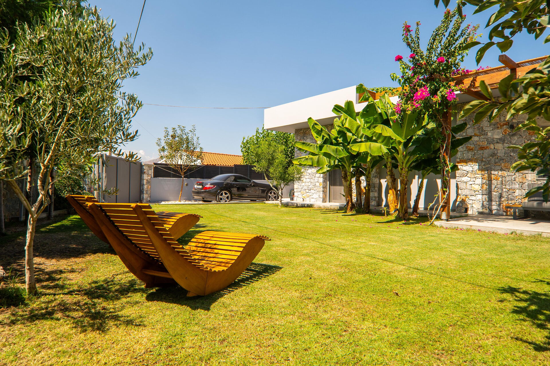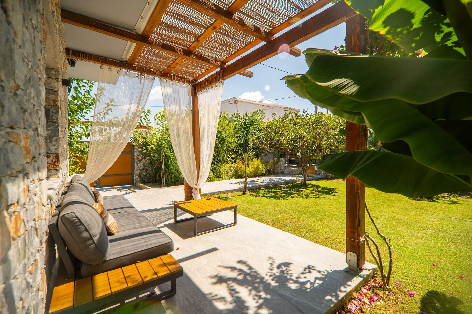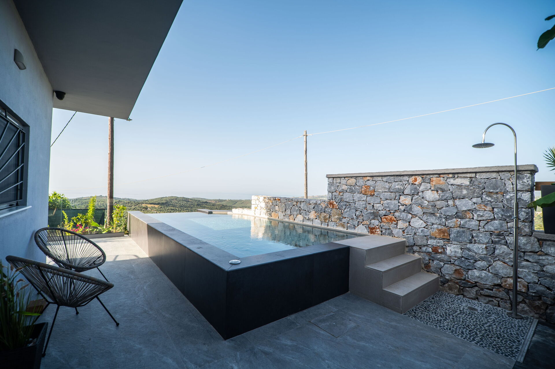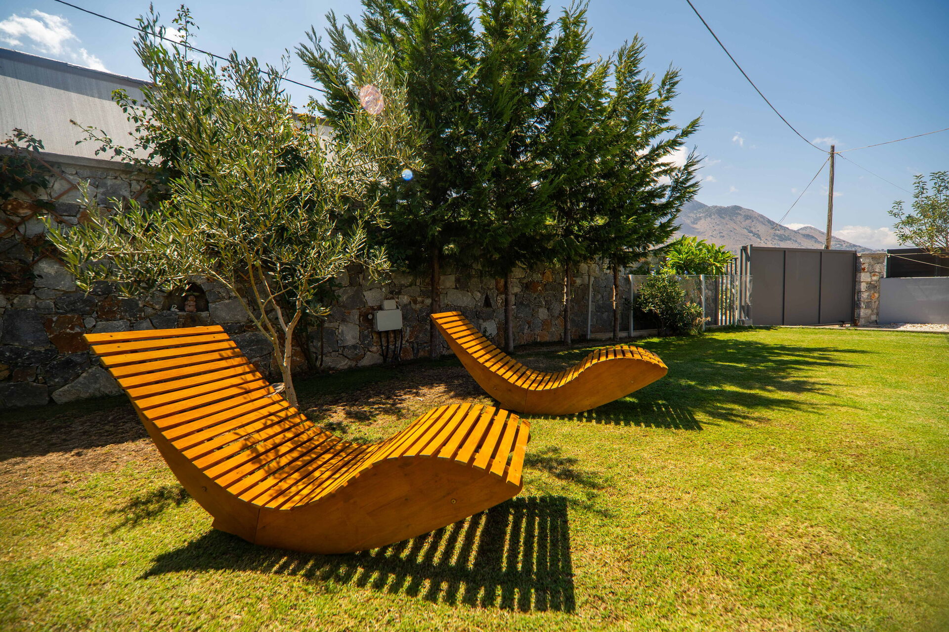 Esternamente Villa Katrina offre un giardino con una zona attrezzata con barbecue e tavolo per mangiare all’aperto e una piscina privata con angolo idromassaggio (riscaldabile su richiesta) dove potersi rinfrescare nelle soleggiate giornate estive; una splendida vista panoramica sul paesaggio circostante che spazia fino al mare e su fantastici tramonti completa il quadro della proprietà.