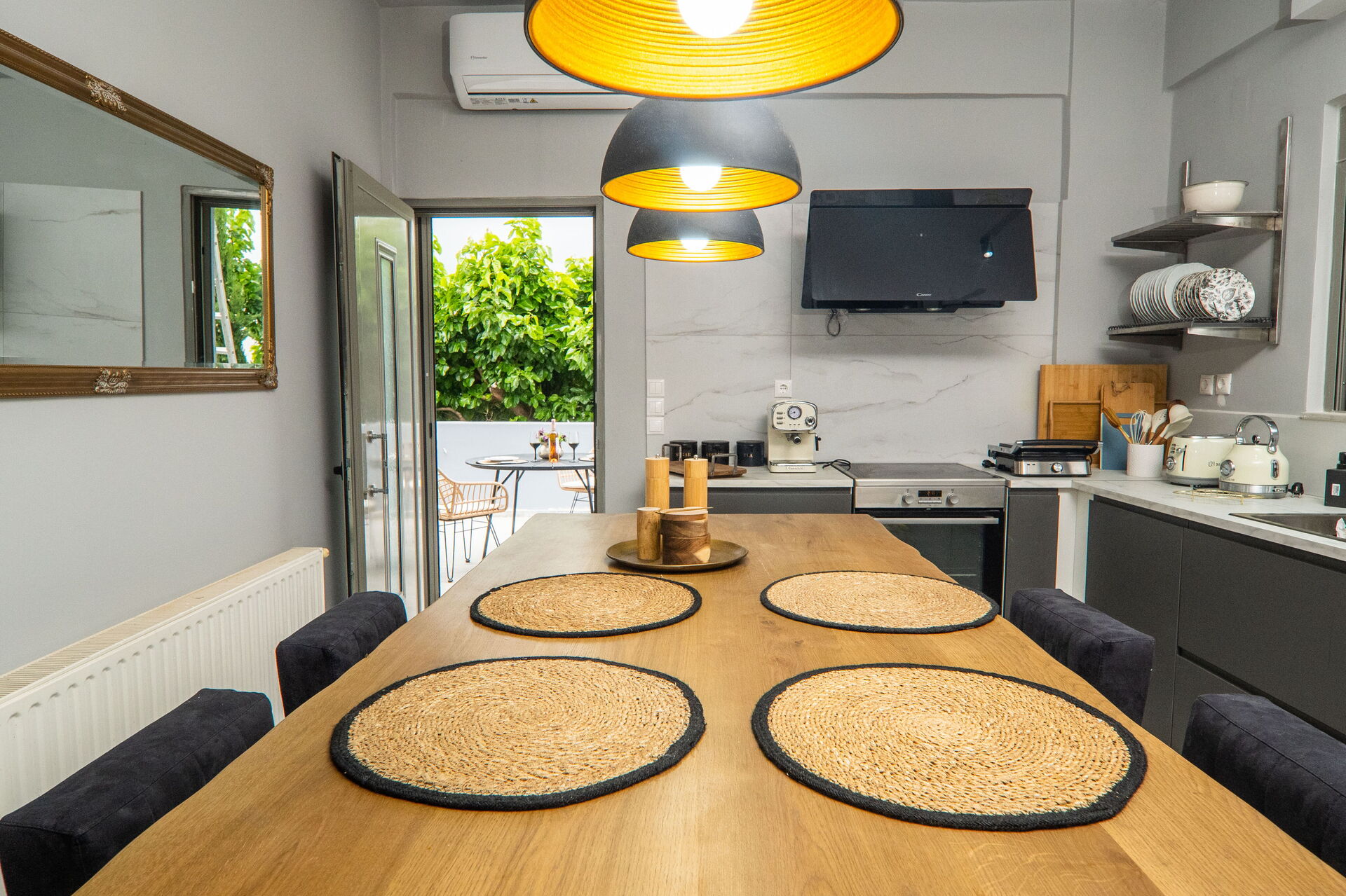 - patio attrezzato con tavolo e sedie per mangiare all'aria aperta