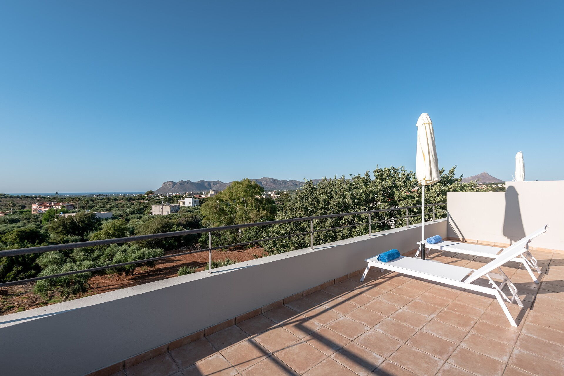 Iris dispone di varie zone all’aria aperta: all’ingresso della villa si trova un tavolo con sedie al coperto, al primo piano vi è un’ampia terrazza con ulteriore zona pranzo ed infine una incantevole terrazza sul tetto con solarium (accessibile dalla stanza all’ultimo piano). La vista mozzafiato dal tetto, sul panorama circostante e sul mare, arricchirà le vostre giornate.