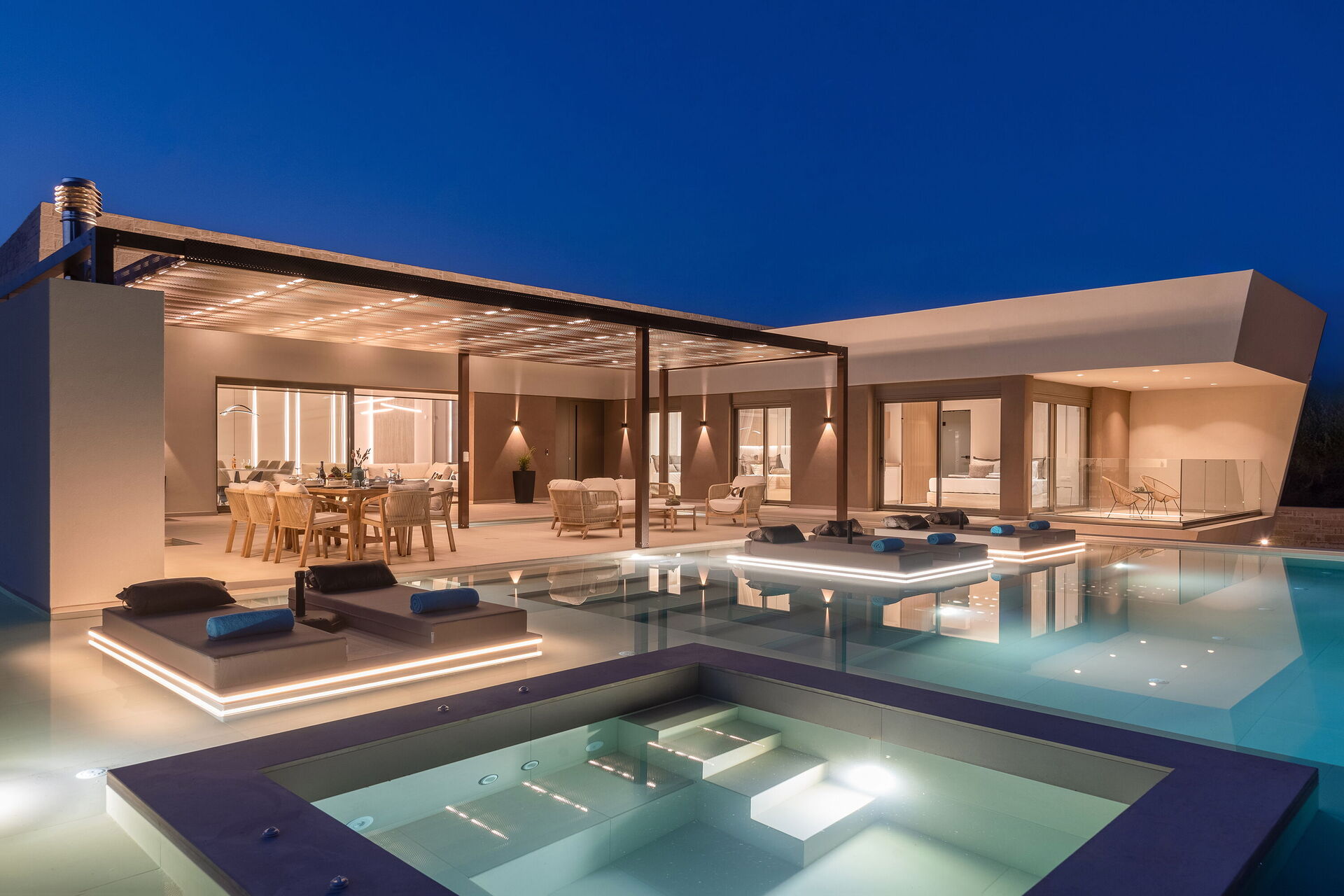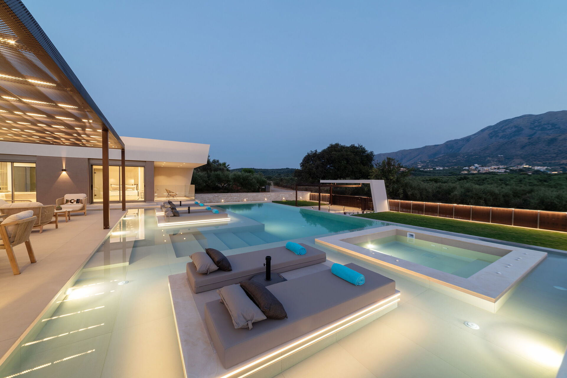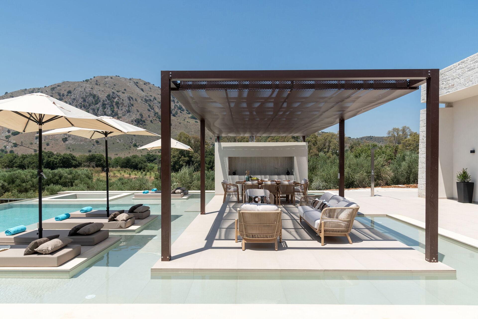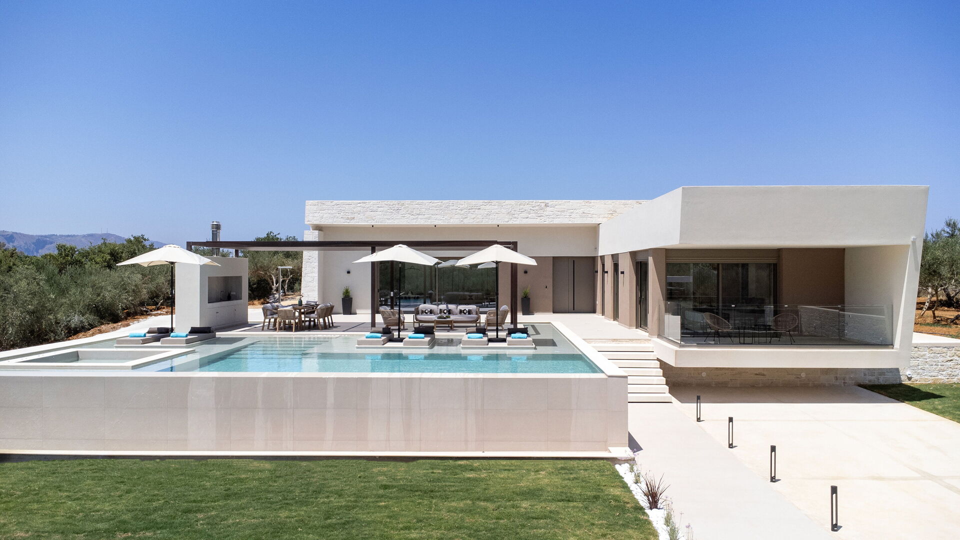 Design e comodità caratterizzano questa luminosissima villa di lusso: una grande cura è stata data alla scelta degli arredi e alla distribuzione degli spazi. Sia internamente che esternamente tutto è stato pensato per offrire ai propri ospiti il massimo della comodità. Grazie alle sue 4 camere può comodamente ospitare fino a 7/8 persone e all'esterno una grande zona attrezzata per cucinare e mangiare all'aria aperta vi permetterà di godervi le belle giornate di sole dell'isola di Creta. Per non parlare della bellissima piscina (con zona idromassaggio: questa zona è riscaldabile su richiesta) riservata all'uso esclusivo degli ospiti che regalerà refrigerio e divertimento per tutti.