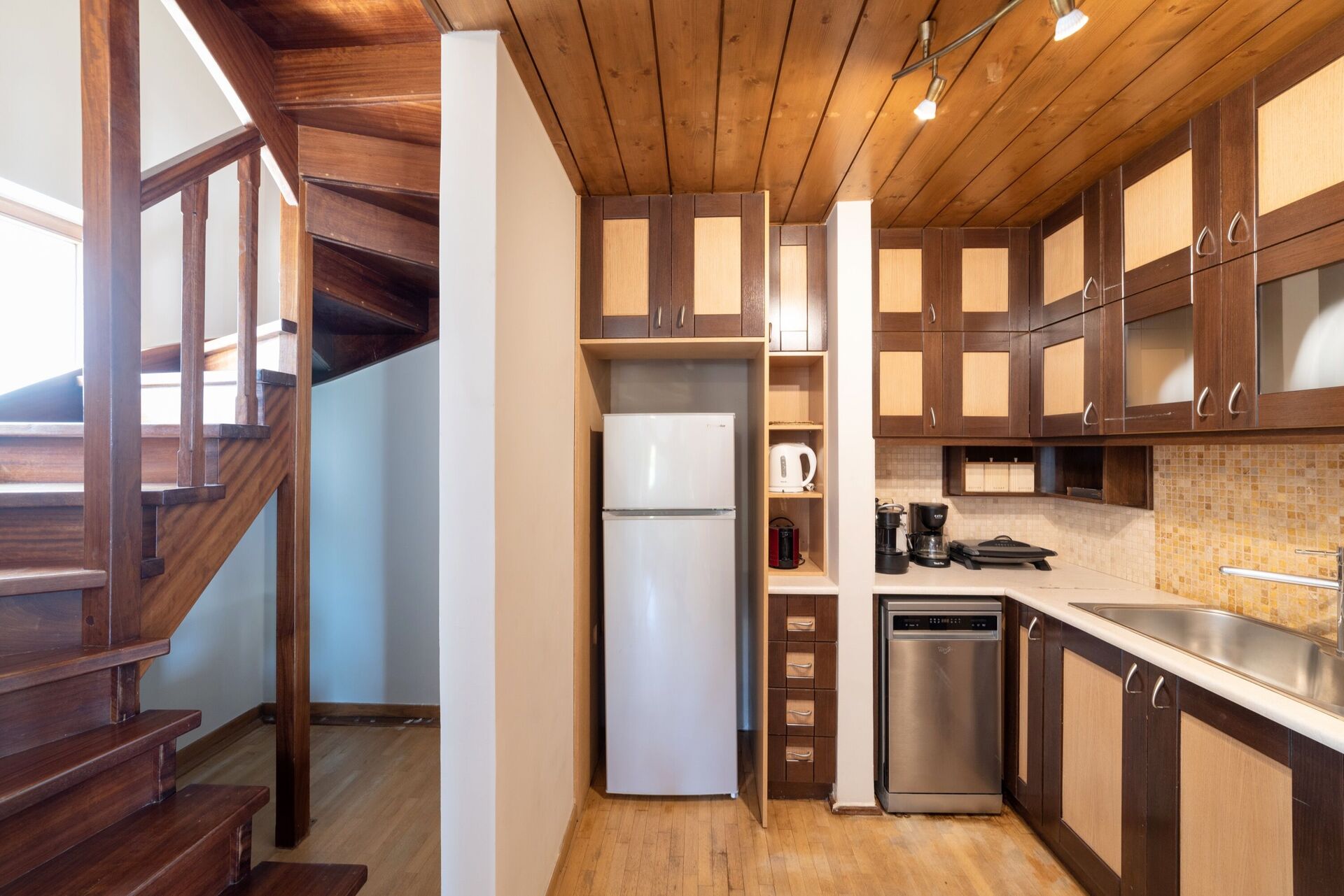 Piano terreno:: soggiorno (TV, DVD) con camino e angolo cottura (forno, lavastoviglie, macchina da caffè espresso), bagno con doccia.