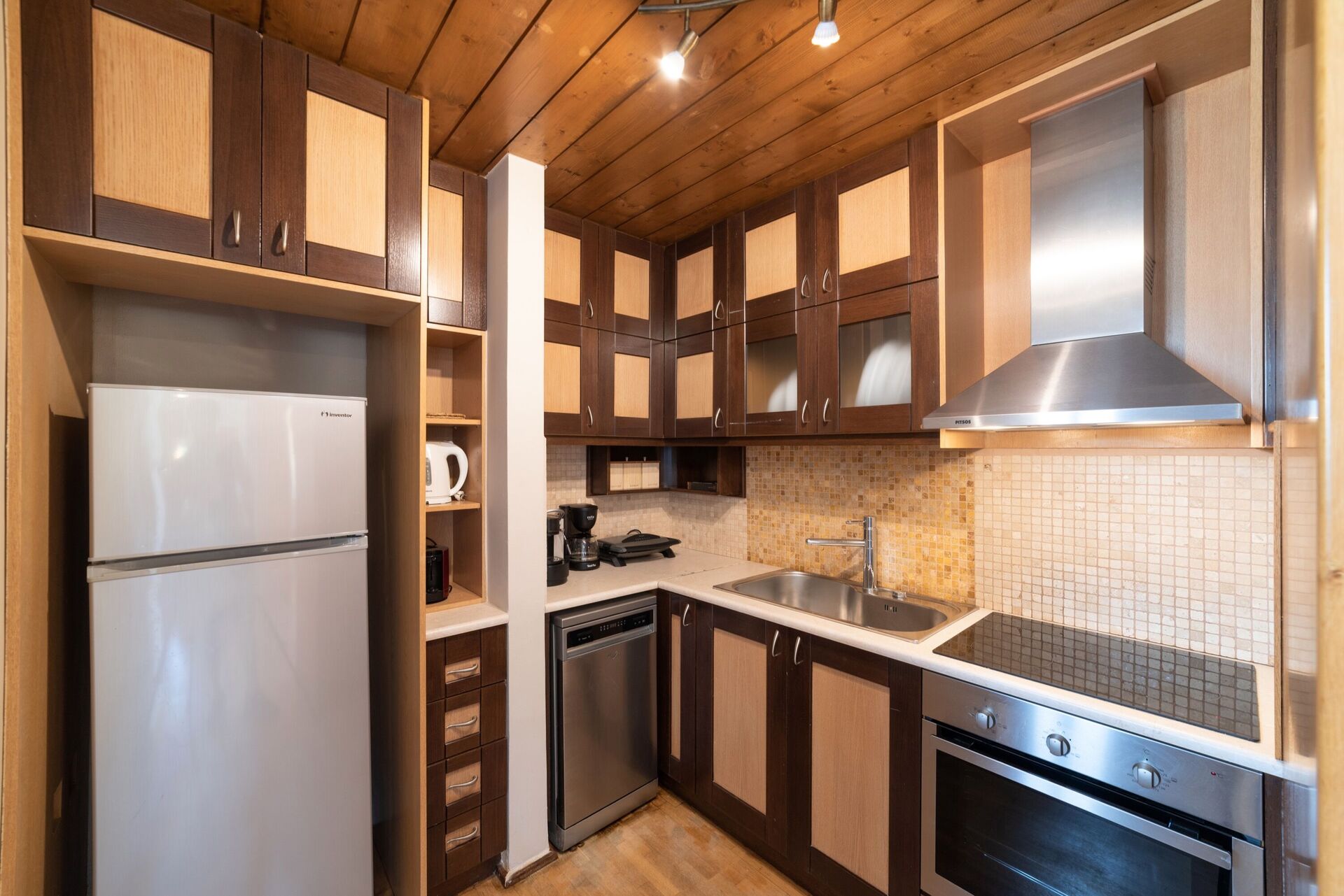 Die Küche ist zweckmäßig und mit den in der Beschreibung aufgezählten Geräten ausgestattet; wenig Arbeitsfläche; die Möbel sind rustikal und weisen starke Gebrauchsspuren auf; wenig Kochgeschirr