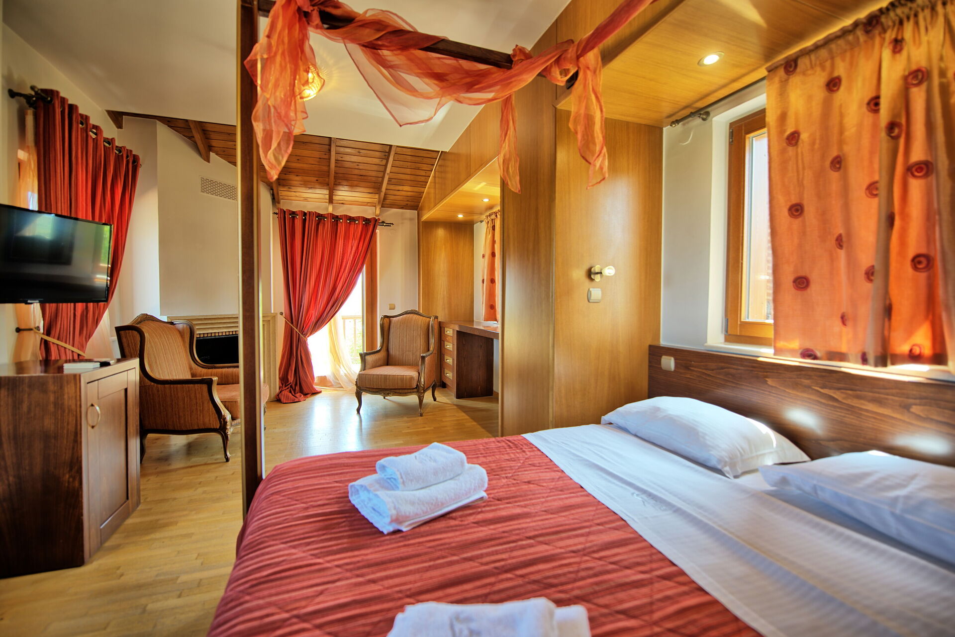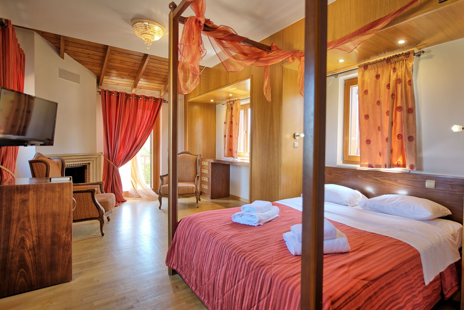 Primo piano: camera con letto matrimoniale king size (a baldacchino), bagno con vasca idromassaggio.