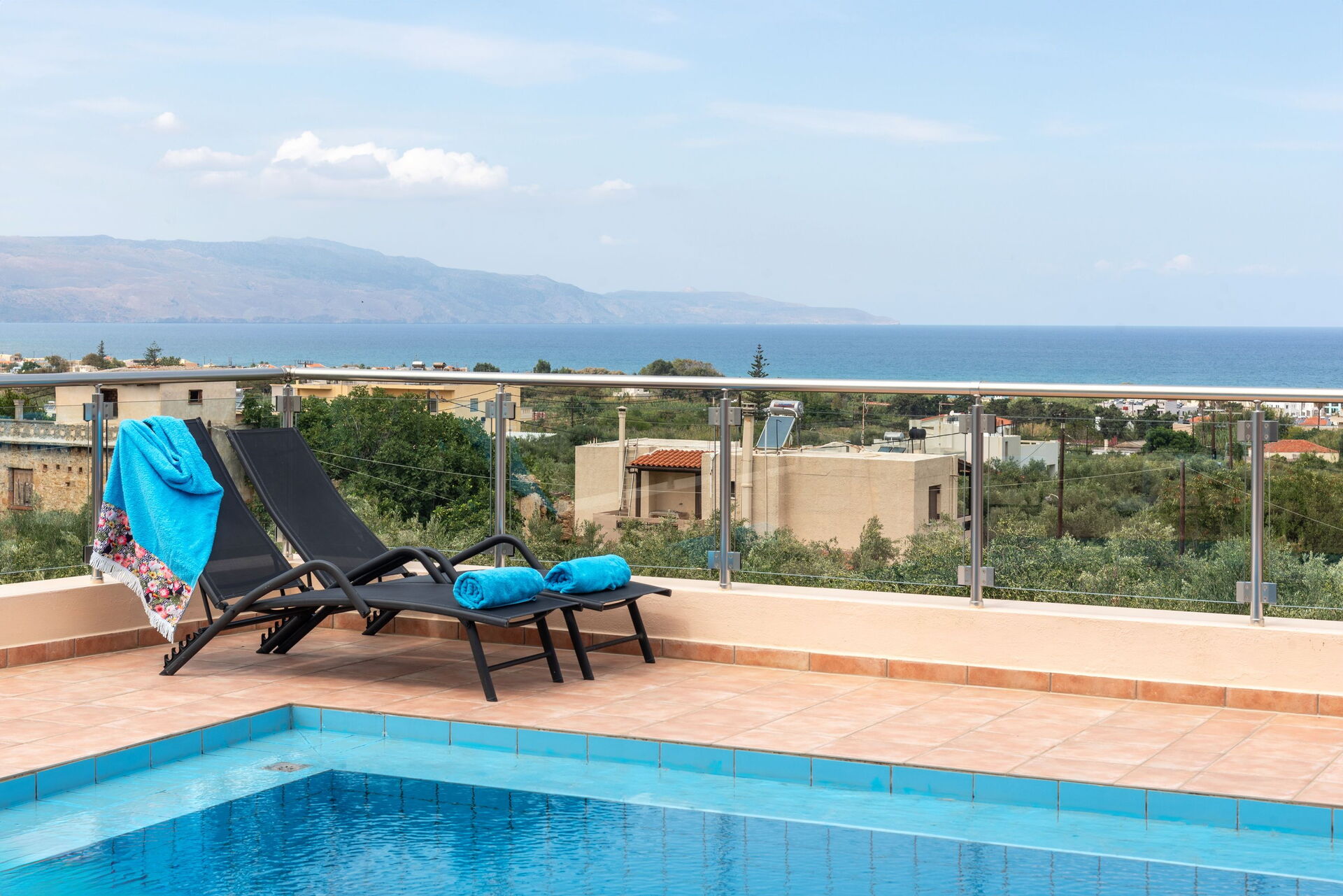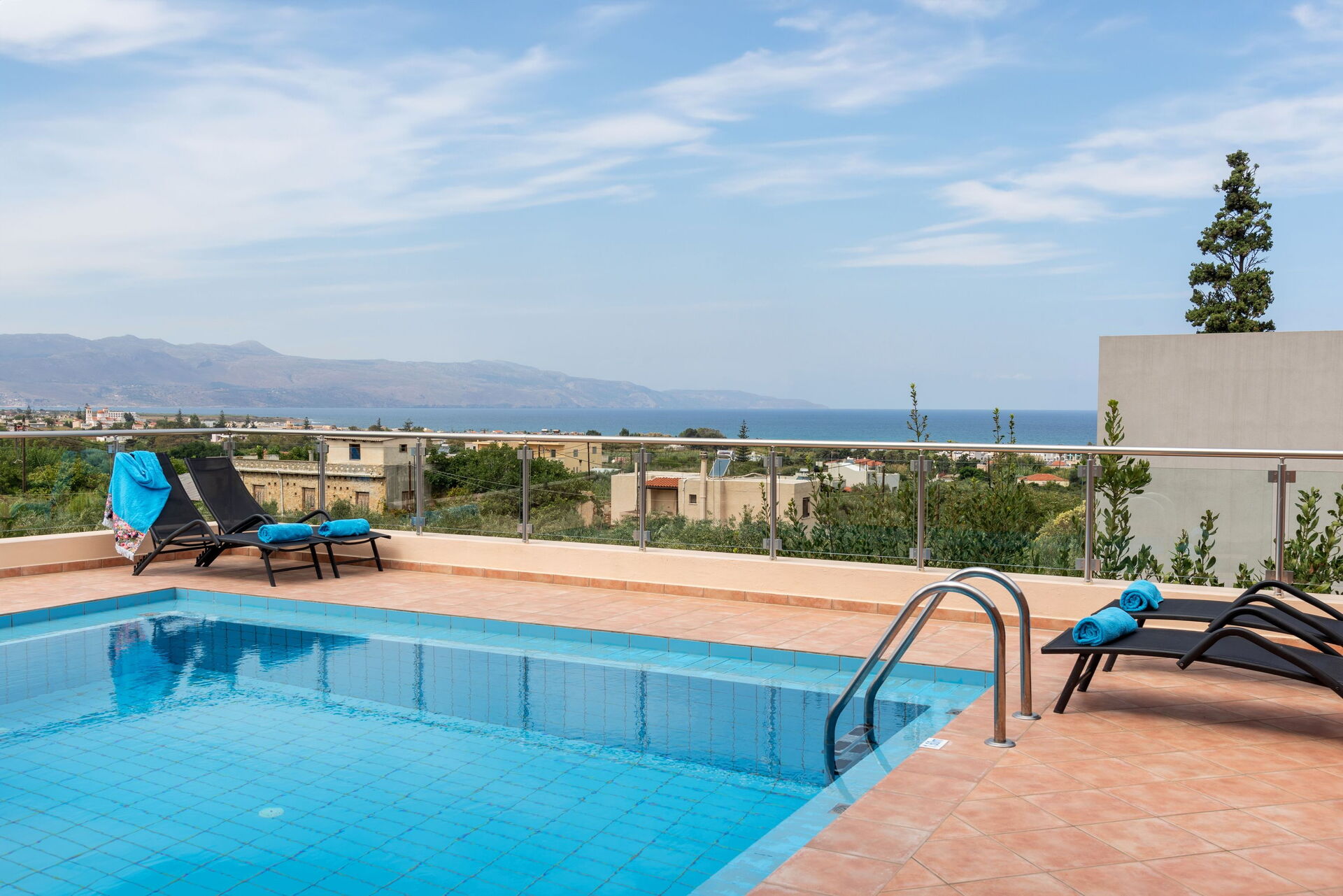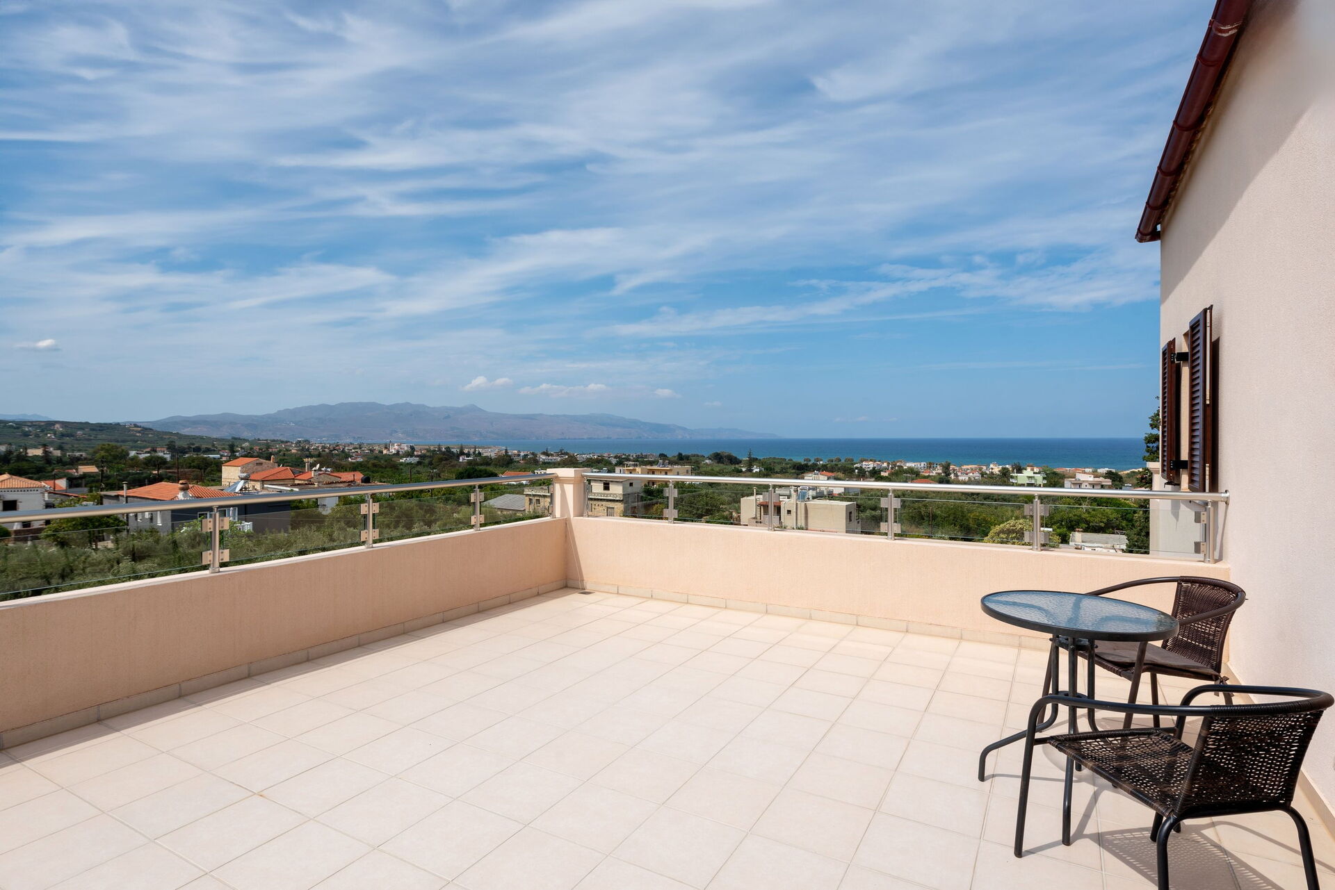Die Villa liegt wenige Kilometer von Chania in den Westen, gut zu erreichen. Im Ort gibt es einen Supermarkt, eine Bäckerei, eigentlich alles, was man im Urlaub braucht. Das Haus ist von einer Mauer umgeben, das Auto parkt im Innenhof. Insgesamt ein tolles Ambiente. Im inneren der Villa fehlt es an nichts. es gibt vier Schlafzimmer, zwei Badezimmer, ein Wohnzimmer und eine Küche mit Esstisch. Also Platz ist genügend vorhanden. Die Küche ist perfekt ausgestattet, Geschirr, Geräte, alles tiptop. Das TV ist so programmiert, dass es auch viele deutschsprachige Sender gab, dazu Netflix und Amzon Video. Was will man mehr. Am Haus gibt es eine riesige Terasse mit Pool, alles sehr sauber und aufgeräumt. Zusätzlich kann haben alle Schlafzimmer die Möglichkeit auf einen Balkon zu gehen. Von der Terasse sieht man auf das Meer, perfekt.