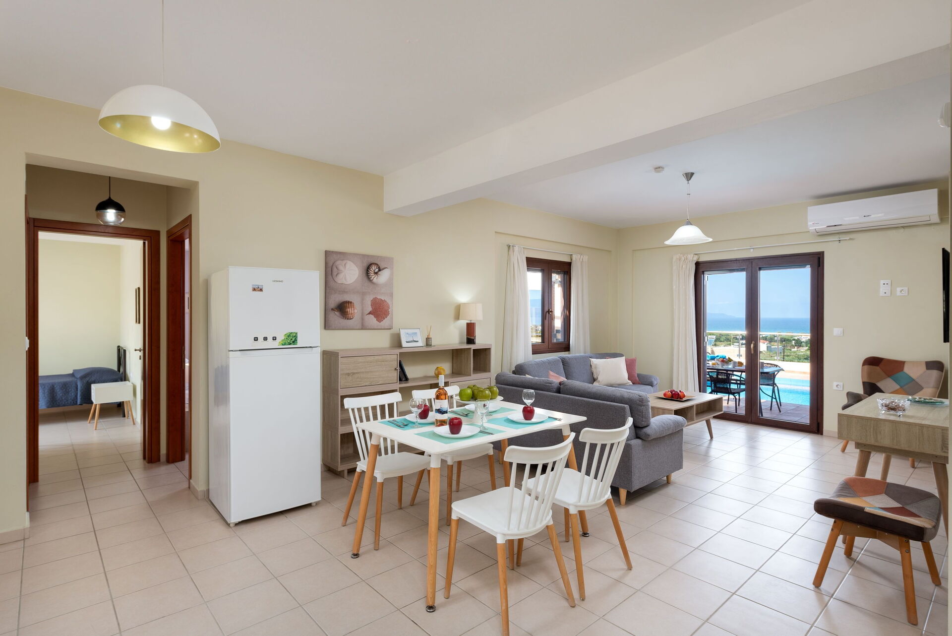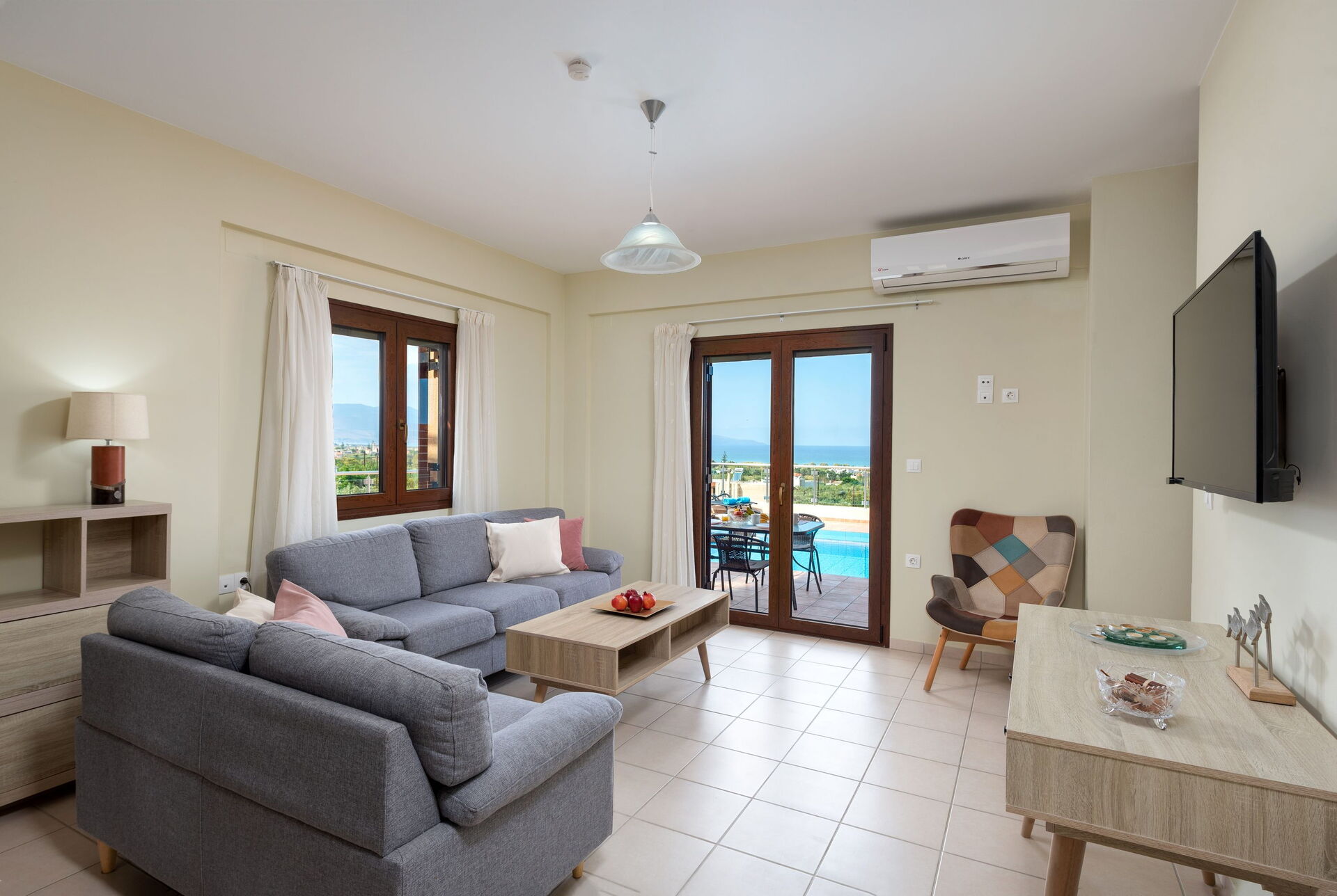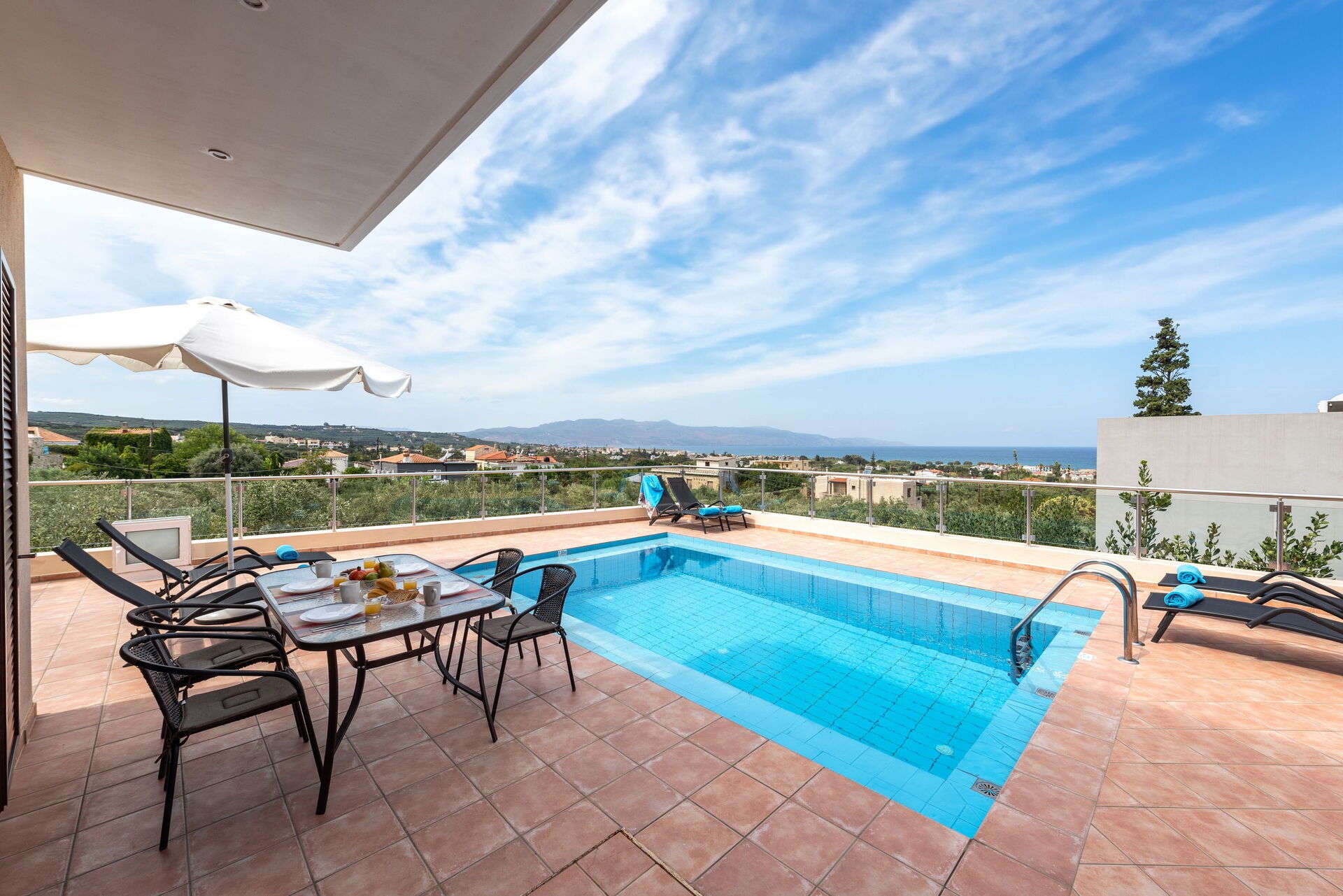Die Villa liegt wenige Kilometer von Chania in den Westen, gut zu erreichen. Im Ort gibt es einen Supermarkt, eine Bäckerei, eigentlich alles, was man im Urlaub braucht. Das Haus ist von einer Mauer umgeben, das Auto parkt im Innenhof. Insgesamt ein tolles Ambiente. Im inneren der Villa fehlt es an nichts. es gibt vier Schlafzimmer, zwei Badezimmer, ein Wohnzimmer und eine Küche mit Esstisch. Also Platz ist genügend vorhanden. Die Küche ist perfekt ausgestattet, Geschirr, Geräte, alles tiptop. Das TV ist so programmiert, dass es auch viele deutschsprachige Sender gab, dazu Netflix und Amzon Video. Was will man mehr. Am Haus gibt es eine riesige Terasse mit Pool, alles sehr sauber und aufgeräumt. Zusätzlich kann haben alle Schlafzimmer die Möglichkeit auf einen Balkon zu gehen. Von der Terasse sieht man auf das Meer, perfekt.