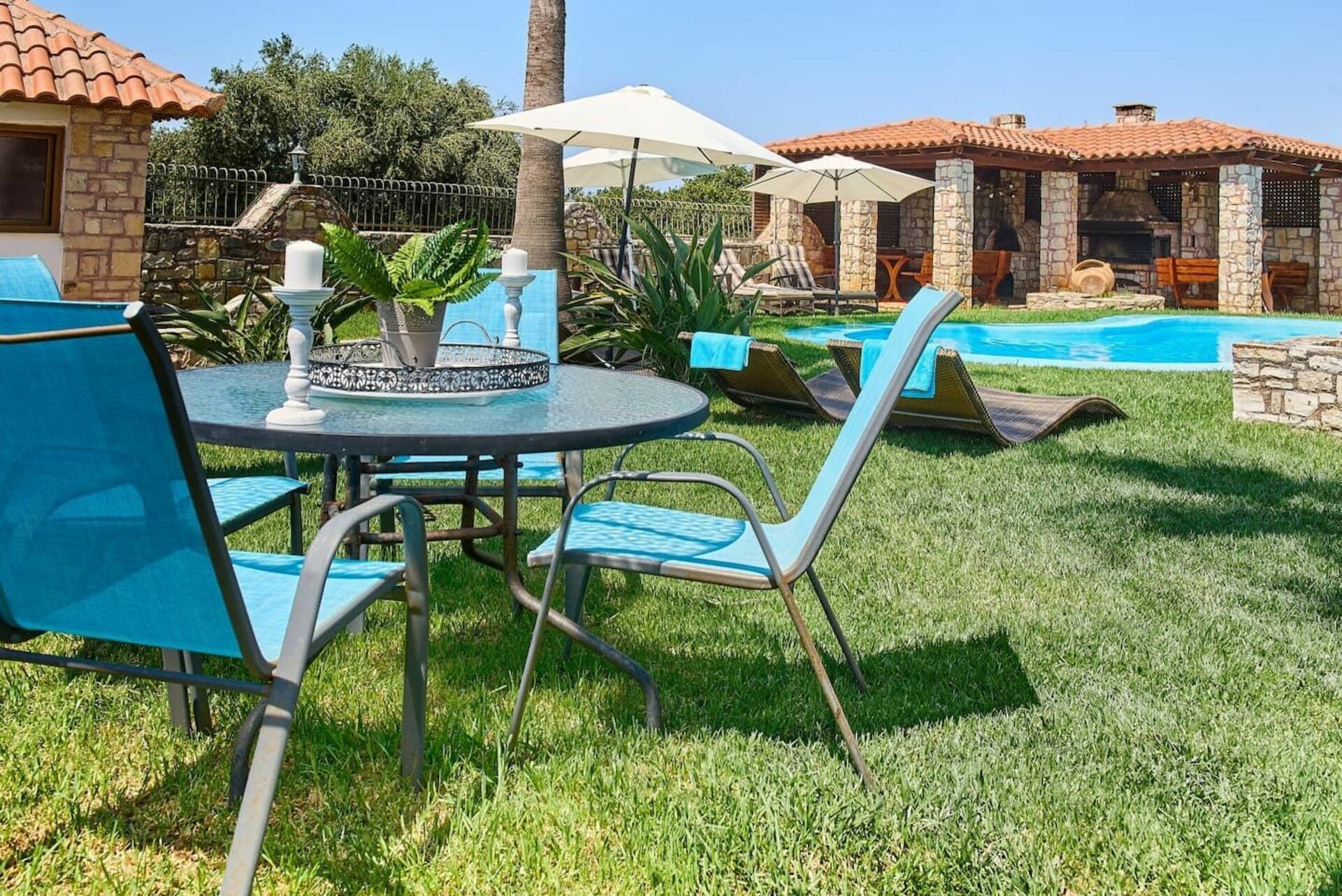 Very nice and calm area, big garden, great terrasse and barbecue area. Even with 10 people you can find easy an area to relax or have fun in the pool. Inside is comfortable with big salon to cool down and nice kitchen area. Chania, Beaches, mountains, local greek taverns are all around the corner, best to rent a car and/or scooter