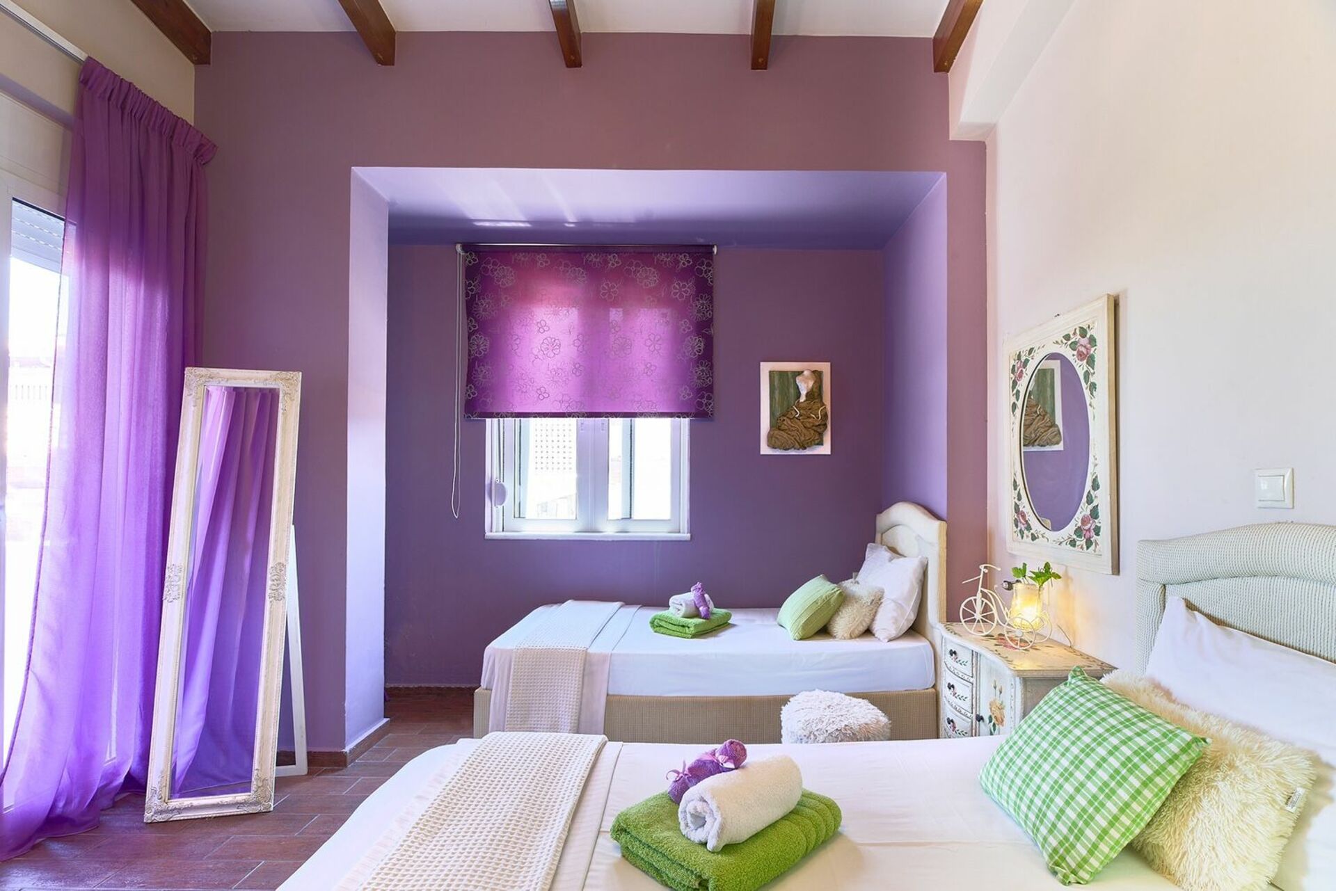 Beaucoup de bonnes choses mais tout n’était pas parfait. Agencement extérieur très agréable, nombreuses décorations originales mais répartition des pièces intérieures pas optimale : quatre chambres mais trois salles de bains avec douche, aucune intégrée dans une chambre et une dans le séjour. Une voiture est requise. 10 à 15 minutes de Chania. Bordé par une route fréquentée. Bon pour 6 personnes maximum.