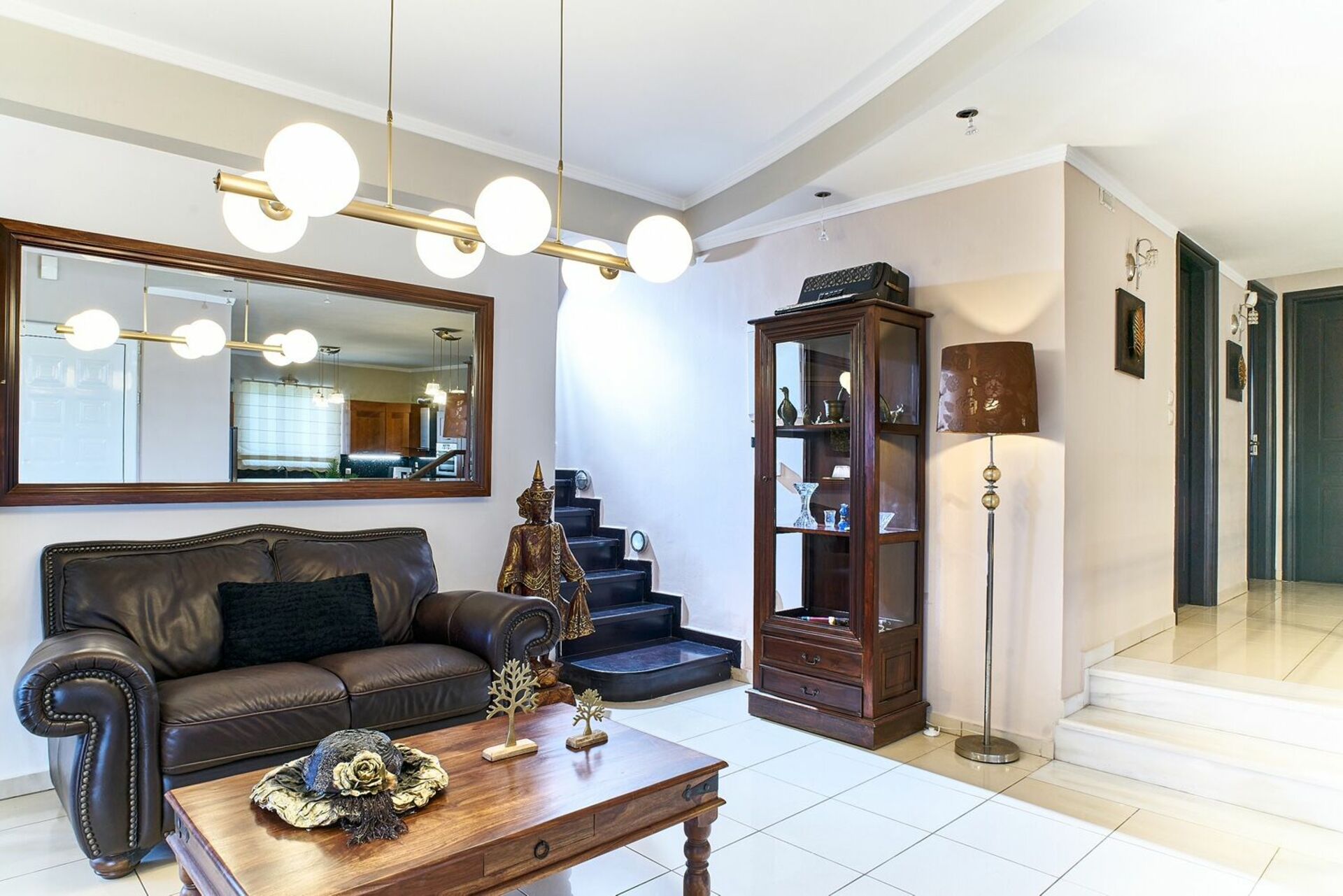 2 gradini sopra: ampio soggiorno con camino in marmo e accesso a grande terrazza coperta attrezzata con arredamento da esterno, bagno di servizio, camera matrimoniale con letto king size e accesso a balcone privato, camera matrimoniale, camera con 2 letti singoli, bagno con vasca idromassaggio, bagno con doccia e lavatrice.
