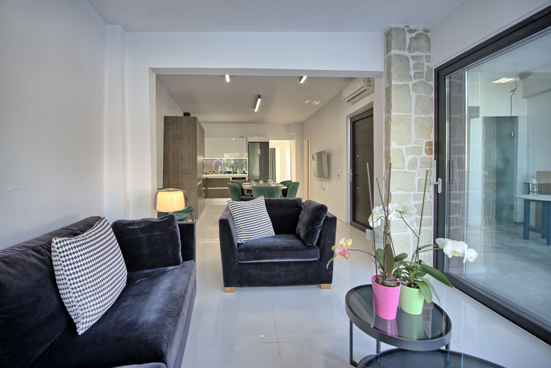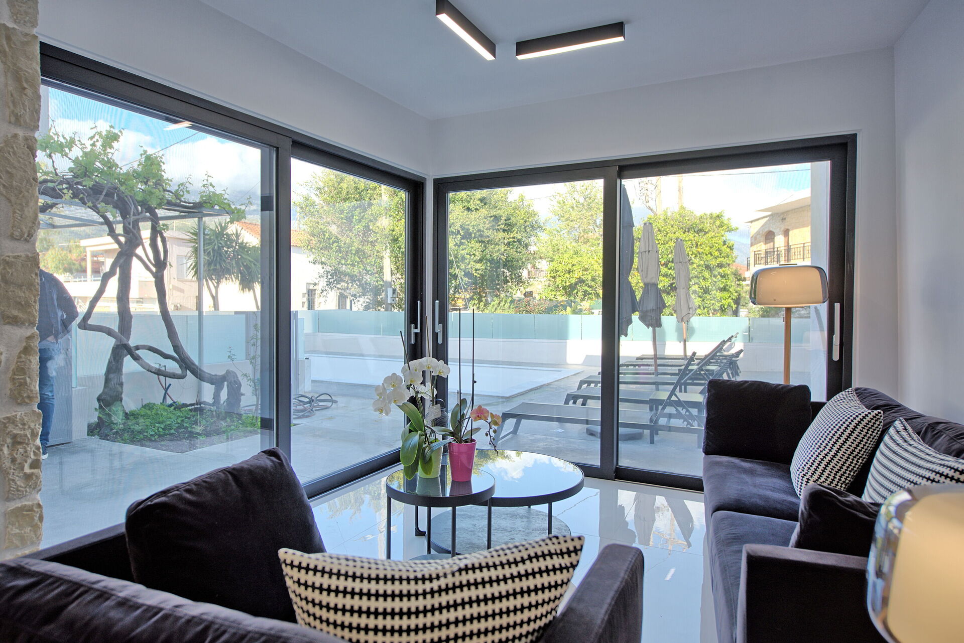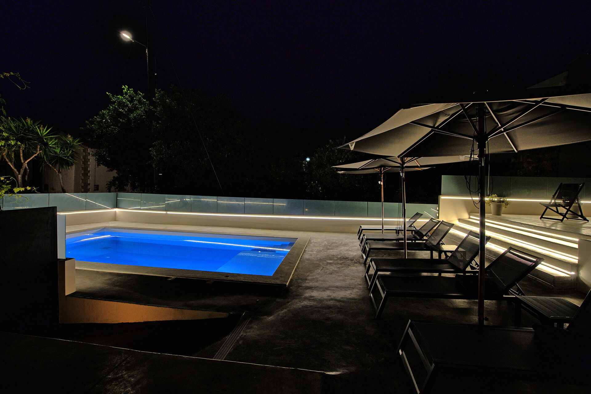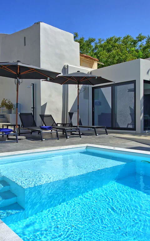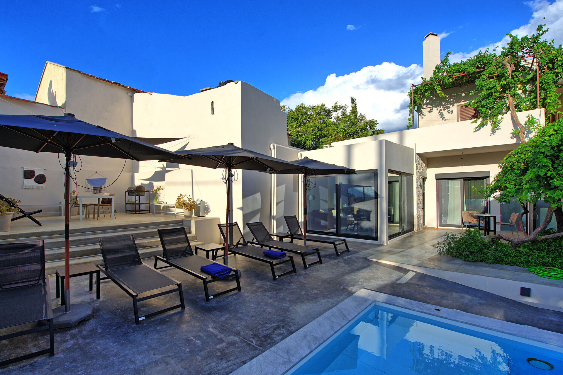 Il patio rialzato, protetto da un'ampia tenda a vela ombreggiante, ospita una zona pranzo con barbecue, ideale per mangiare all'aria aperta. Il solarium circonda la piscina privata riservata all'uso esclusivo degli ospiti: un asset raro in un centro storico, perfetto per godersi le soleggiate giornate cretesi.
