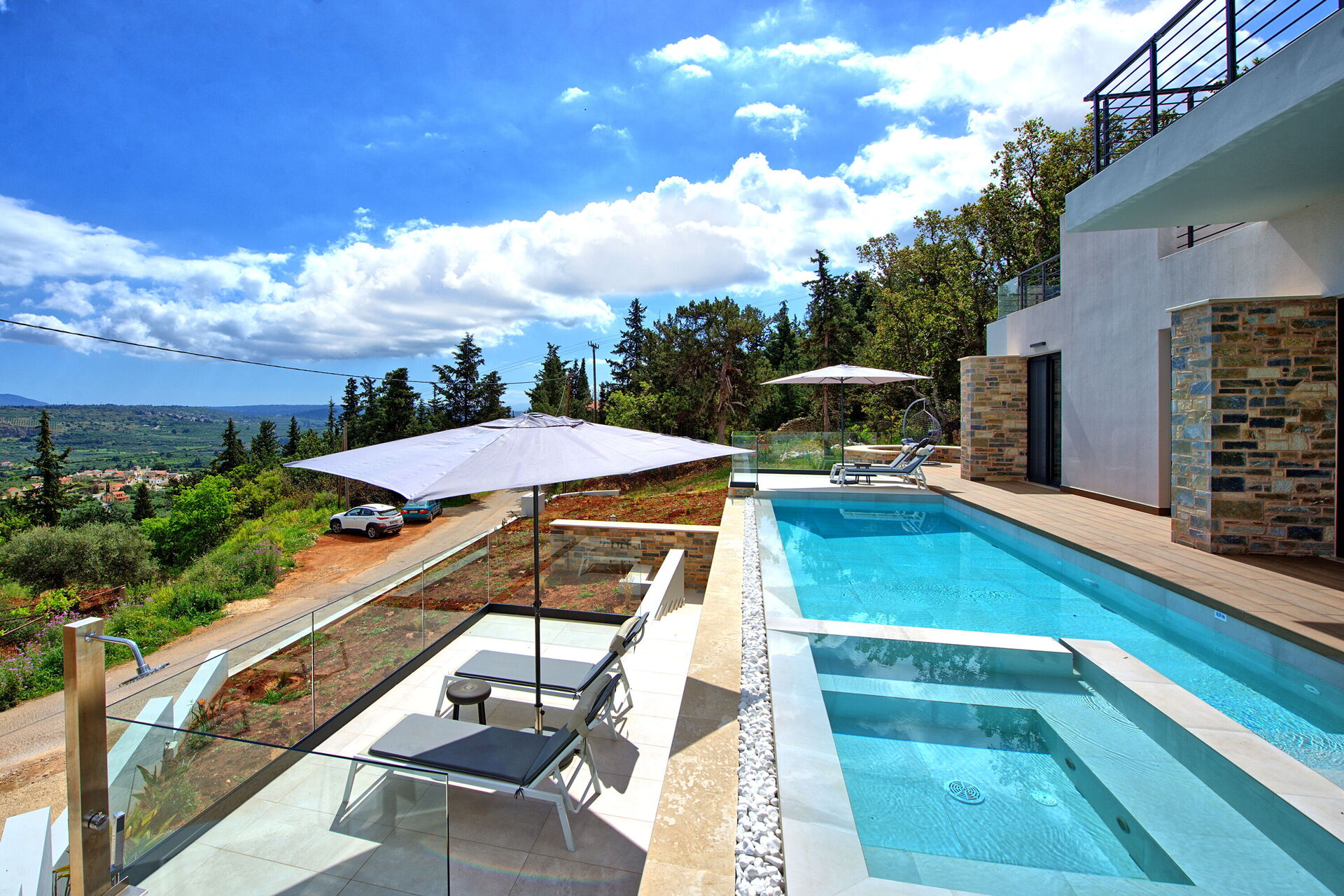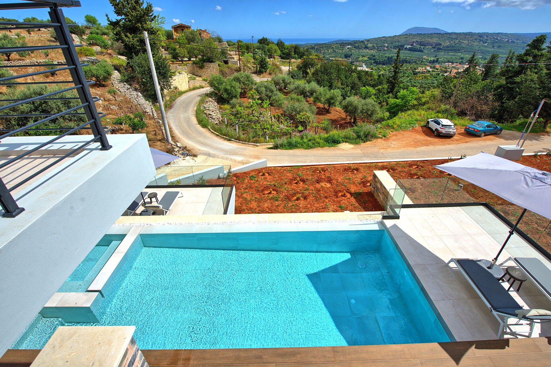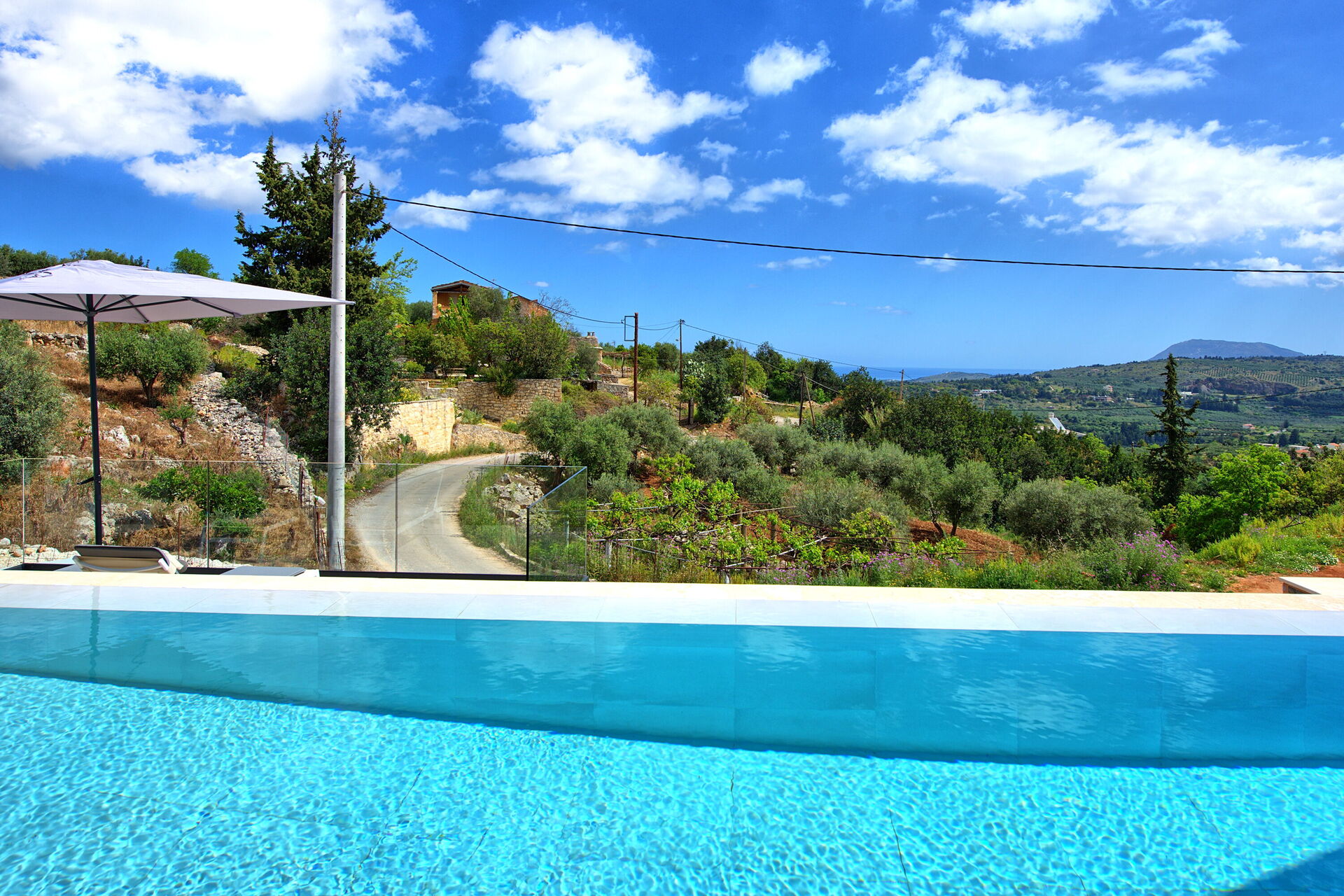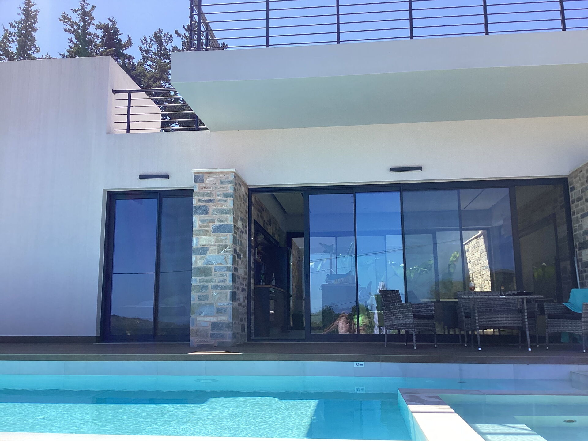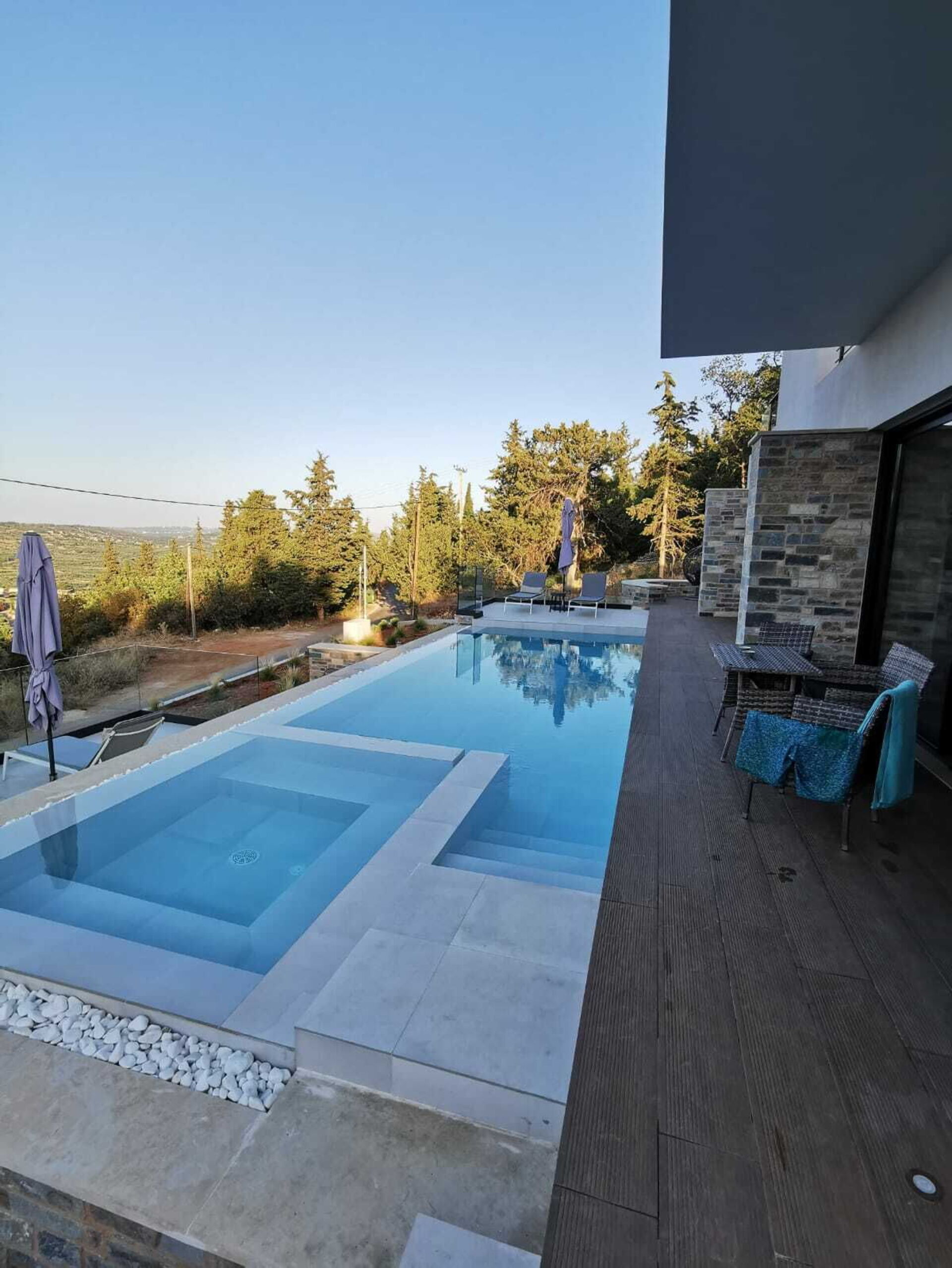 Beautiful new and modern, state of the art 1-story villa in a quiet and picturesque area of Crete. Amazing view. All amenities present, very hospitable and friendly owner, personal touches make you feel very welcome. Owner delivered the villa super-clean and stopped by 1-2 times per week to change bed linens and towels. The main east/west highway on the island is within a 5 minute drive. There is no hustle and bustle, no noise, just crickets. Beautiful infinity type pool with steps leading into it. 0.9m deep on the shallow end, about 1.5m on the deep end. 10 meters swimming length and additionally, a whirlpool type section with seats for enjoying drinks and conversation. No actual whirlpool function. Pool is well kept, pool boy visits regularly to clean it out and check water quality.