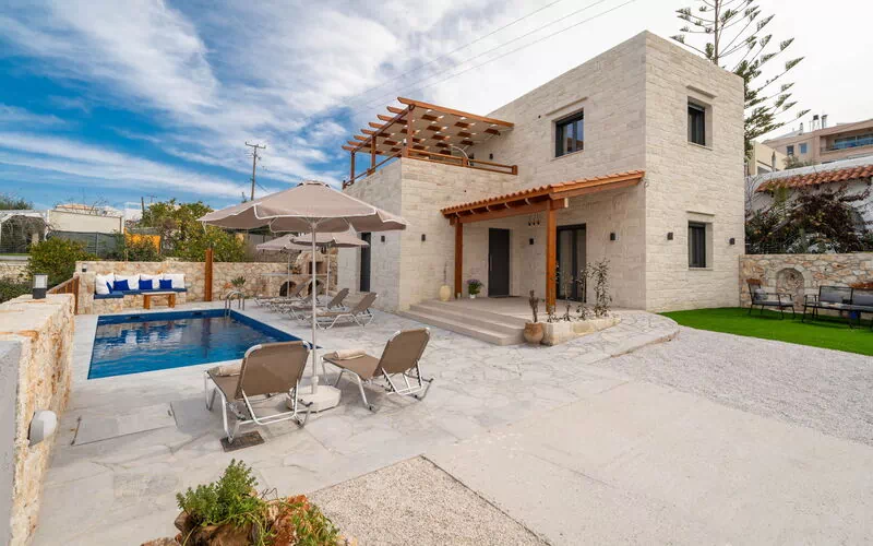 Il vero punto di forza di Villa Blini è la sua eccezionale logistica. A soli 350 metri dal cancello d’ingresso si trova il cuore di Plaka: potrete dimenticare l’auto e raggiungere a piedi taverne tipiche, bar e piccoli negozi di artigianato. Per gli amanti del mare, la rinomata spiaggia di Almyrida dista solo 2 km, rendendo questa villa la base ideale per chi cerca comodità senza rinunciare alla privacy. Lo spazio esterno è una vera oasi di benessere: la piscina privata è circondata da un solarium attrezzato, ideale per rinfrescarsi nelle calde giornate cretesi o per godersi un aperitivo al tramonto.Interni luminosi e comfort di ultima generazione