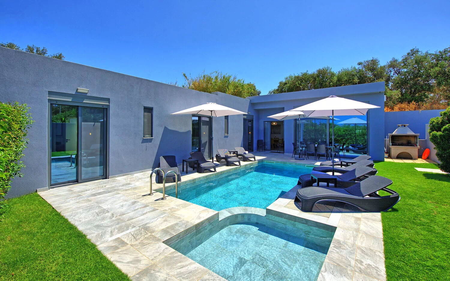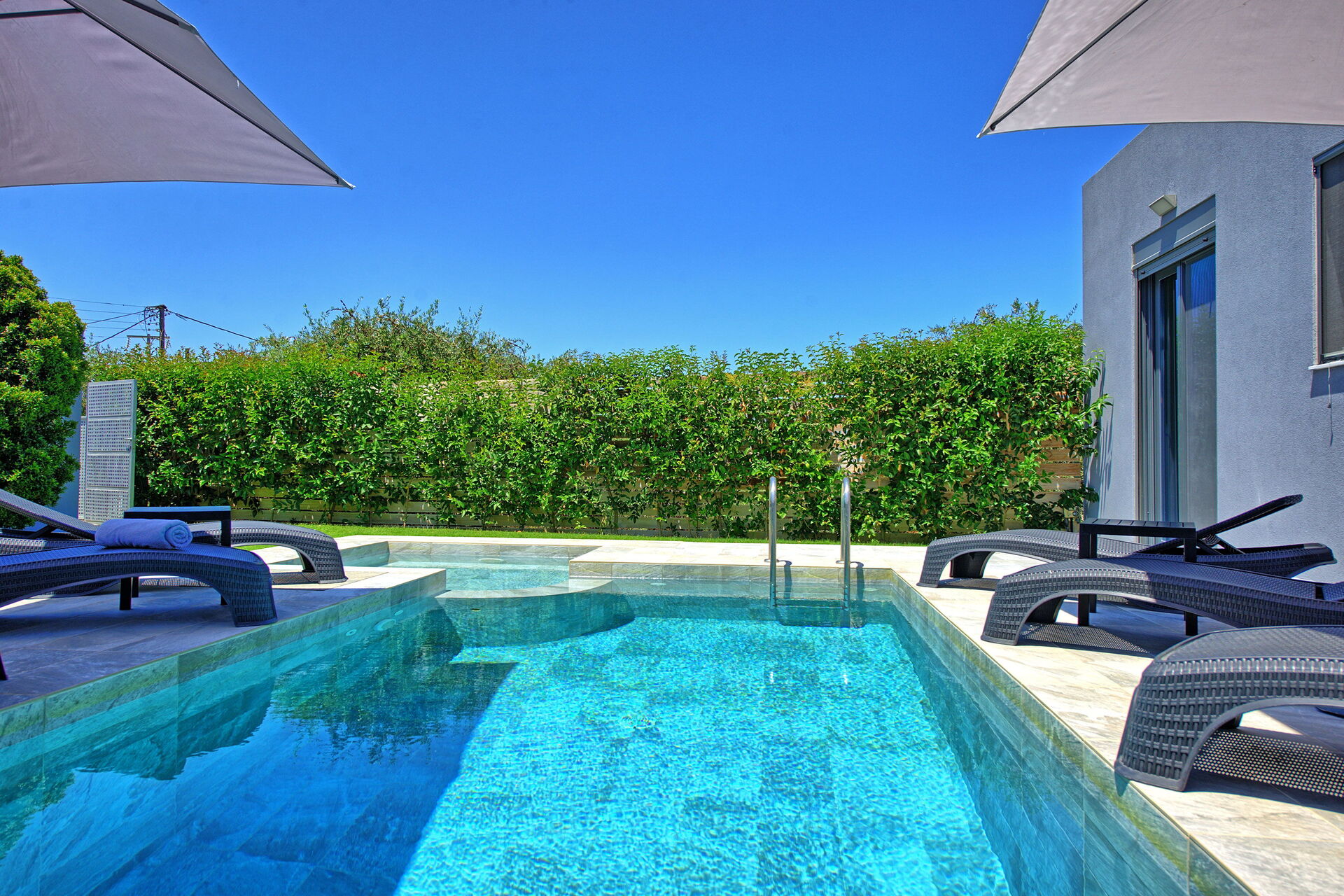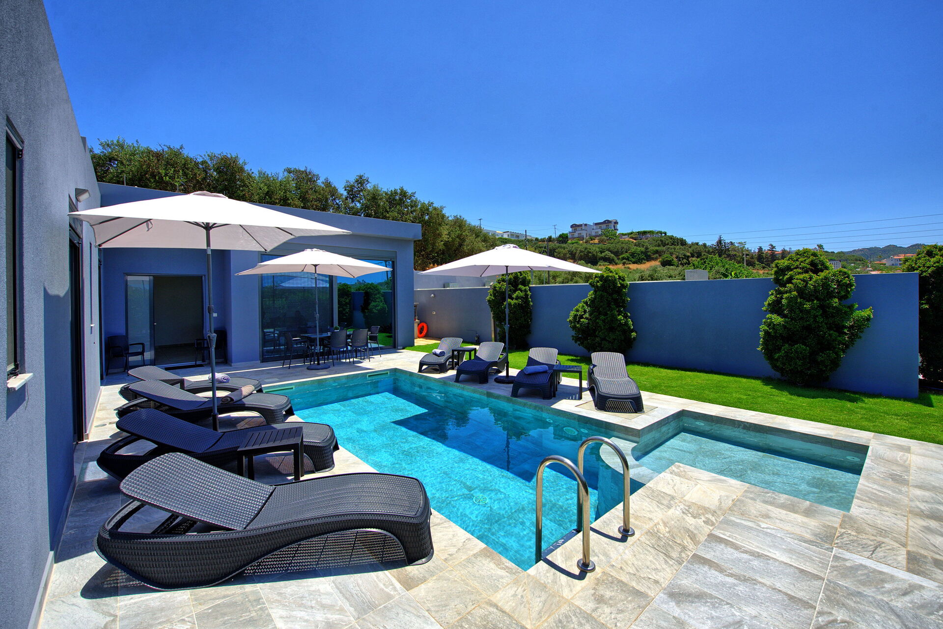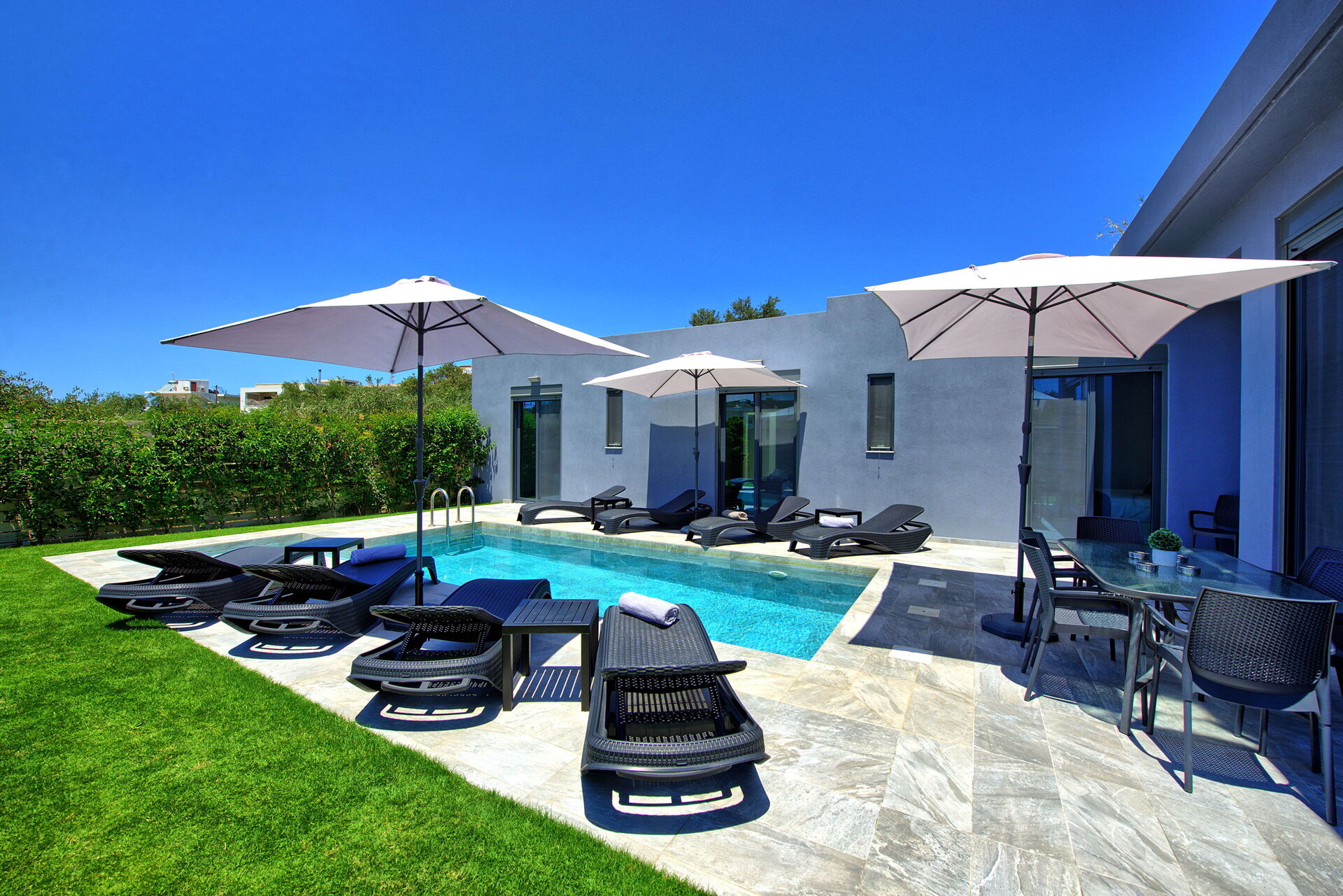 Villa Zaneti è una nuovissima e moderna villa indipendente con giardino e piscina privata in affitto a Creta a soli 600 metri dal mare.