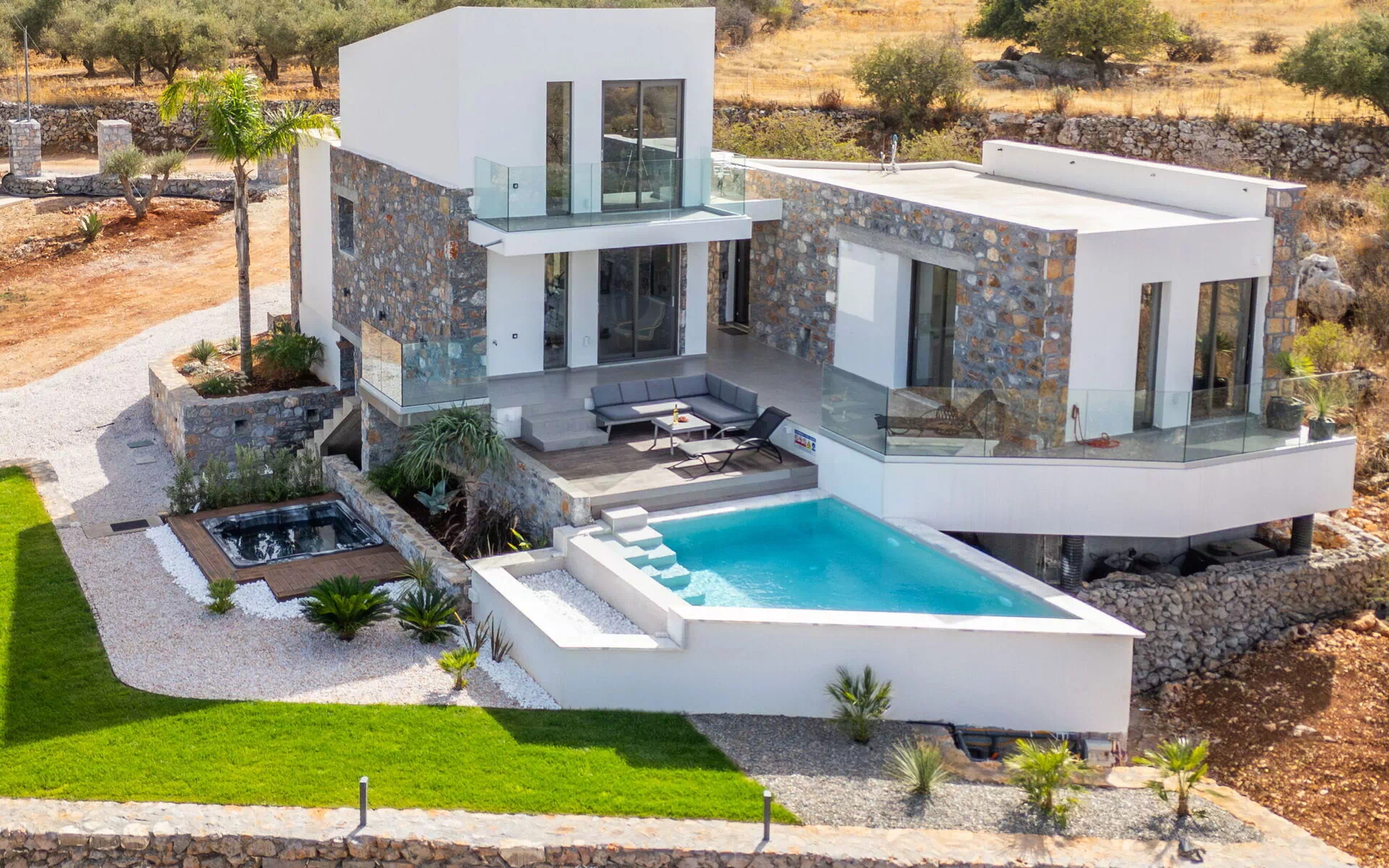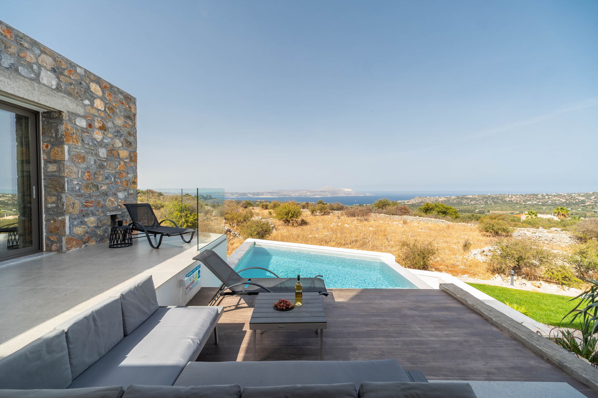 Bella villa con piscina privata e vasca idromassaggio esterna ideale per vacanze a Creta, in Grecia.