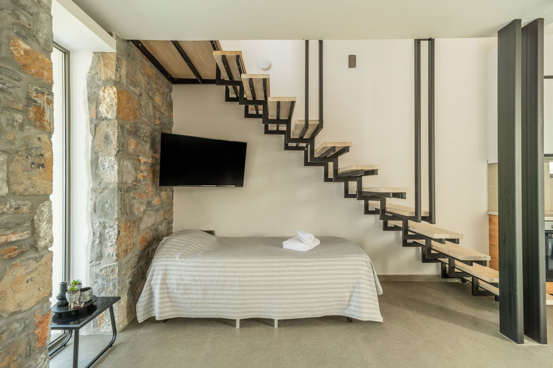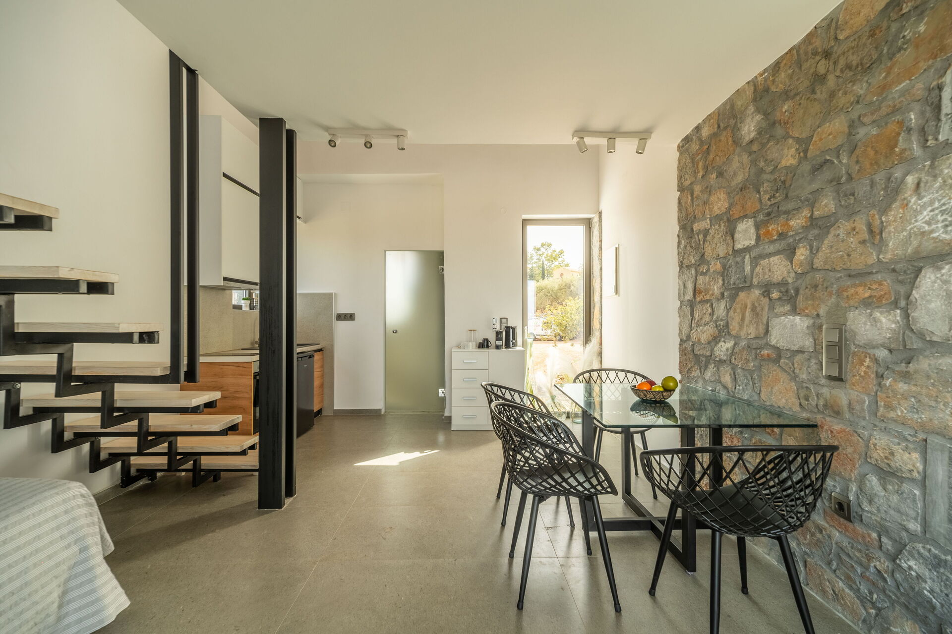 Piano terreno: soggiorno con divano letto singolo e zona pranzo con angolo cottura.