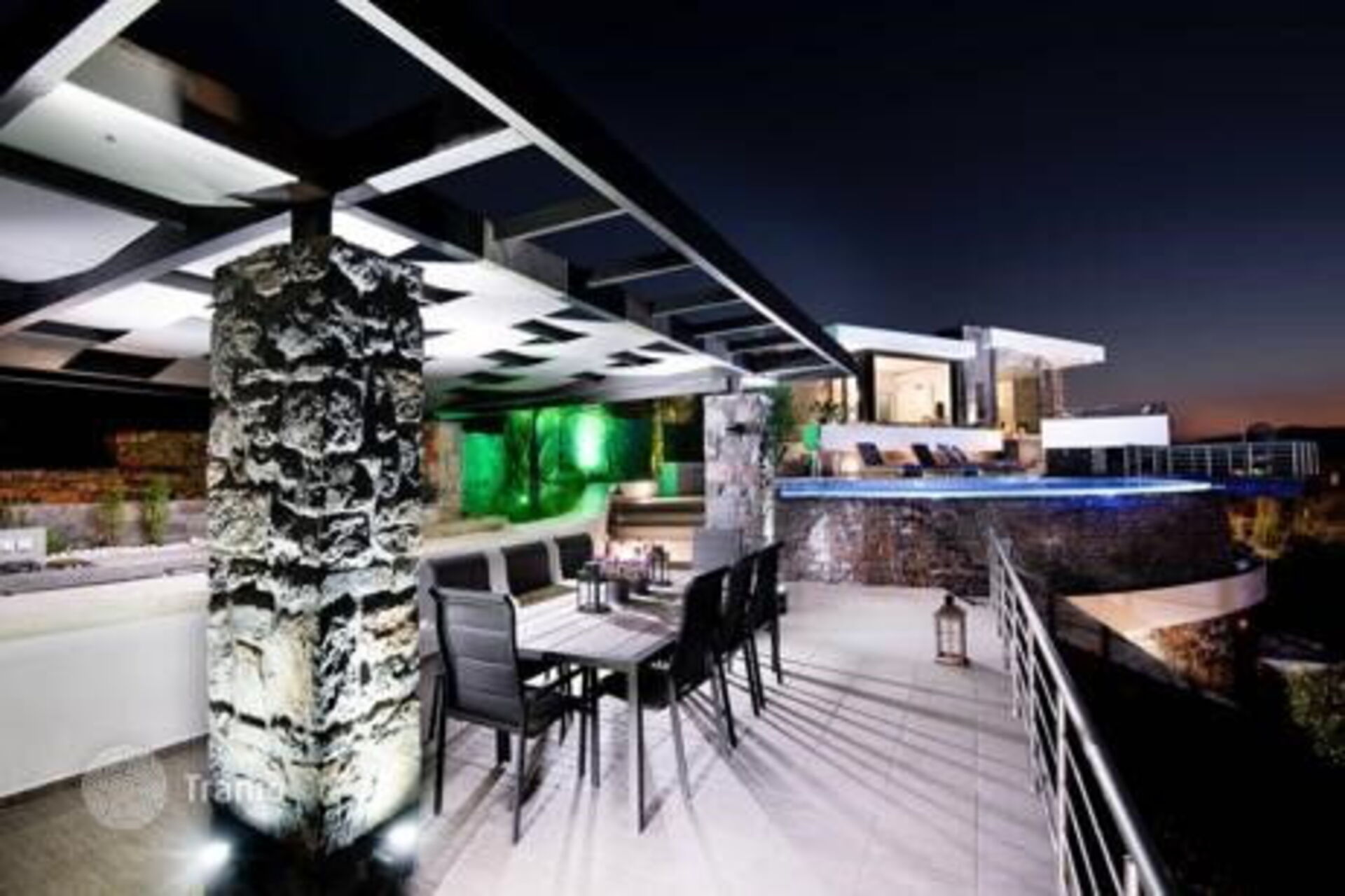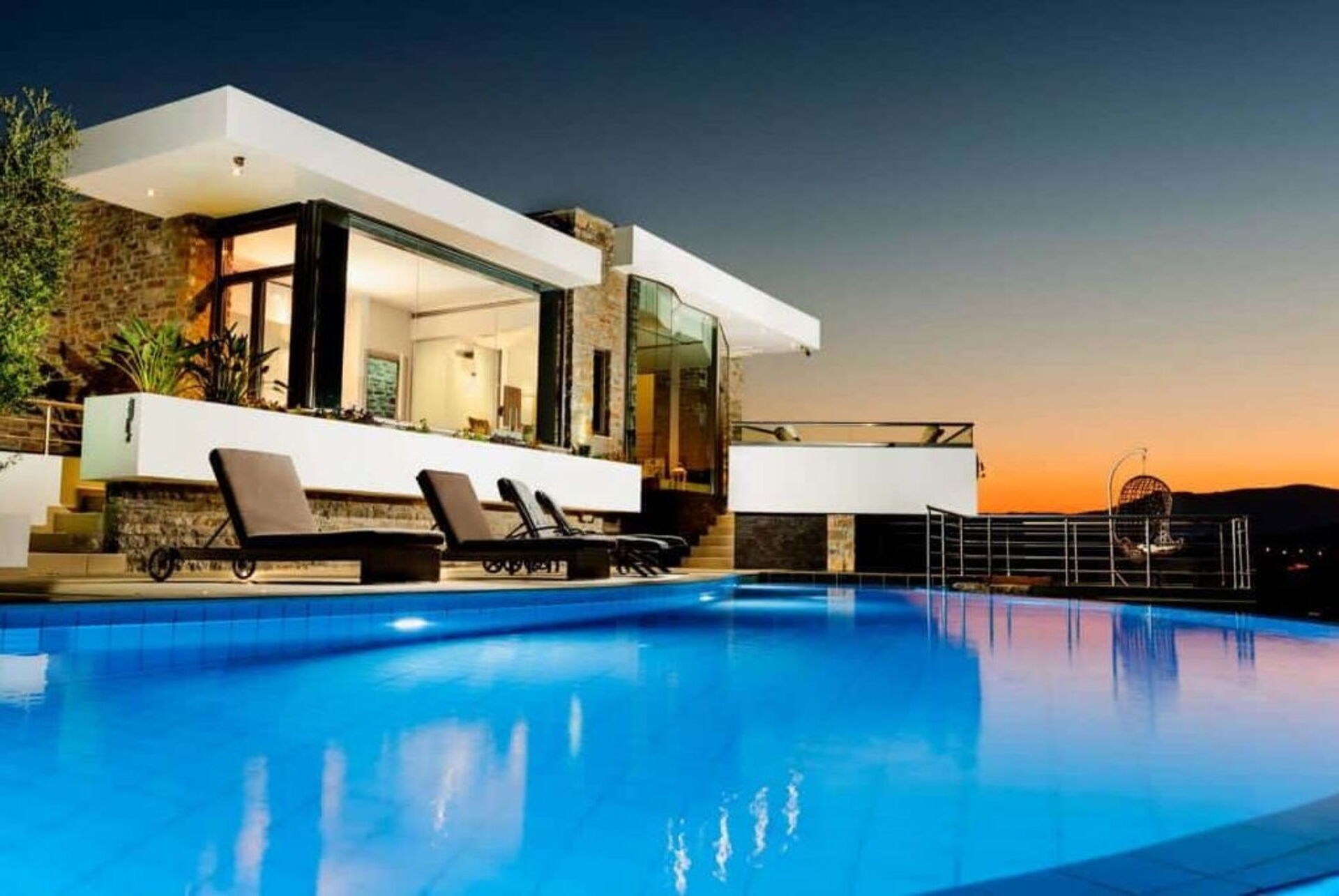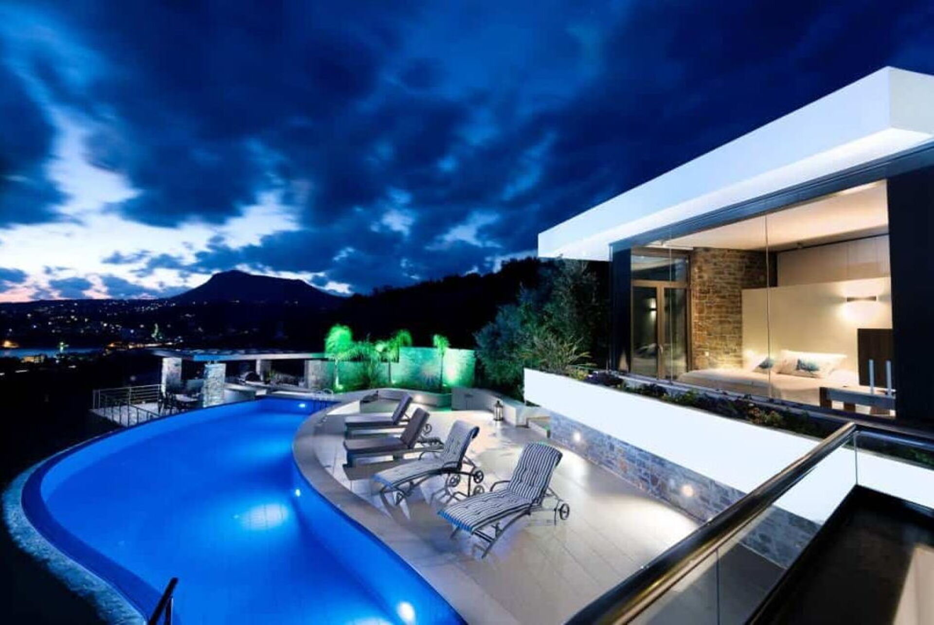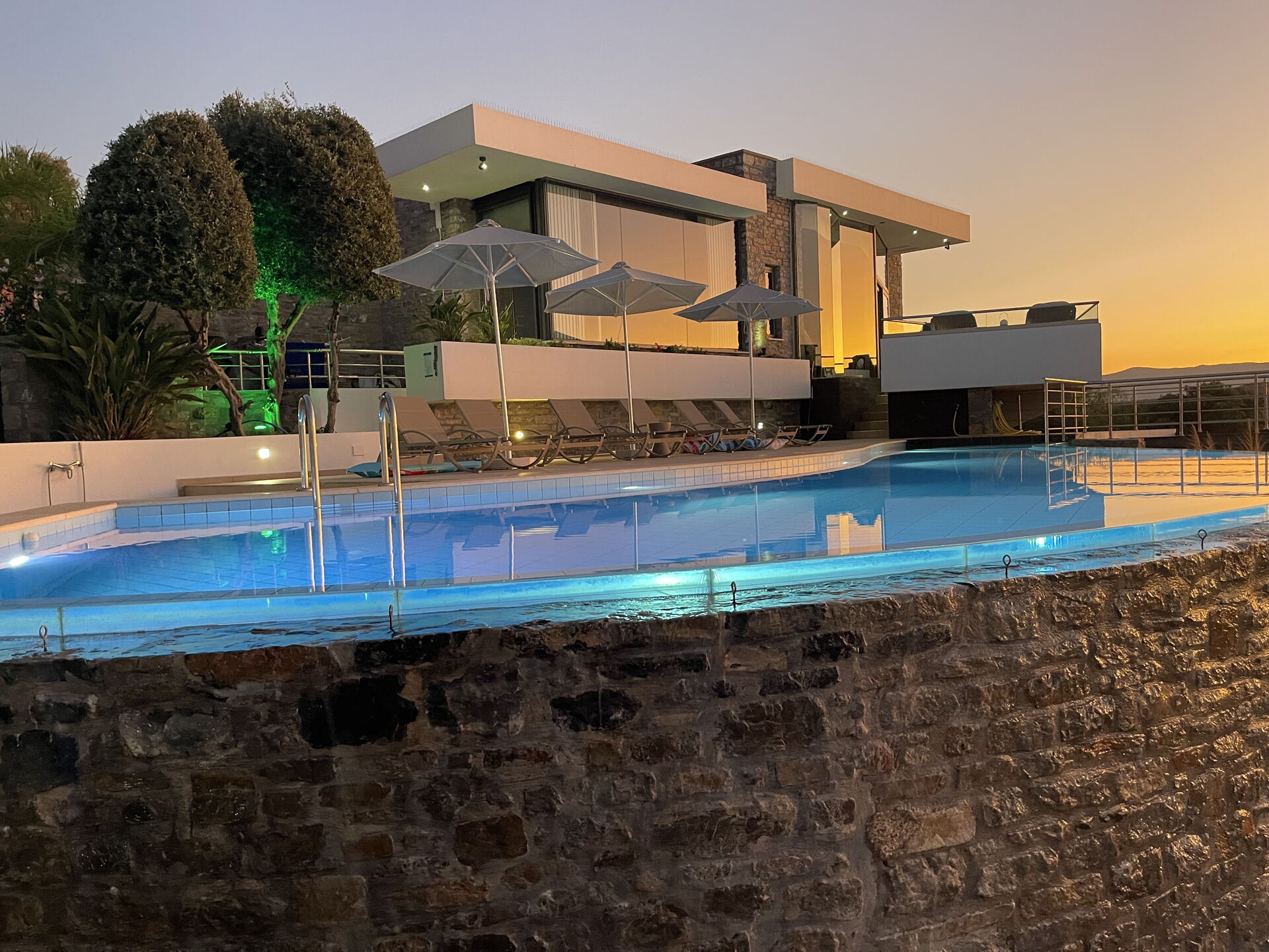 La grande piscina privata riscaldabile su richiesta è splendidamente illuminata di notte, grazie al suo design irregolare offre una privacy assoluta ed è il luogo perfetto per godersi un tuffo rinfrescante o un drink ammirando il tramonto sul mare.