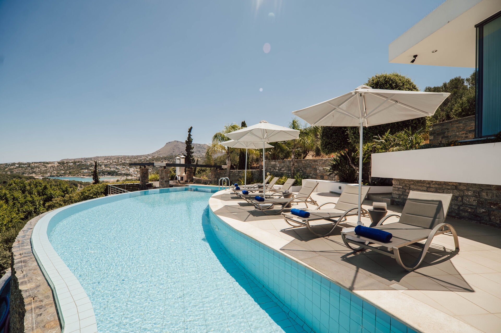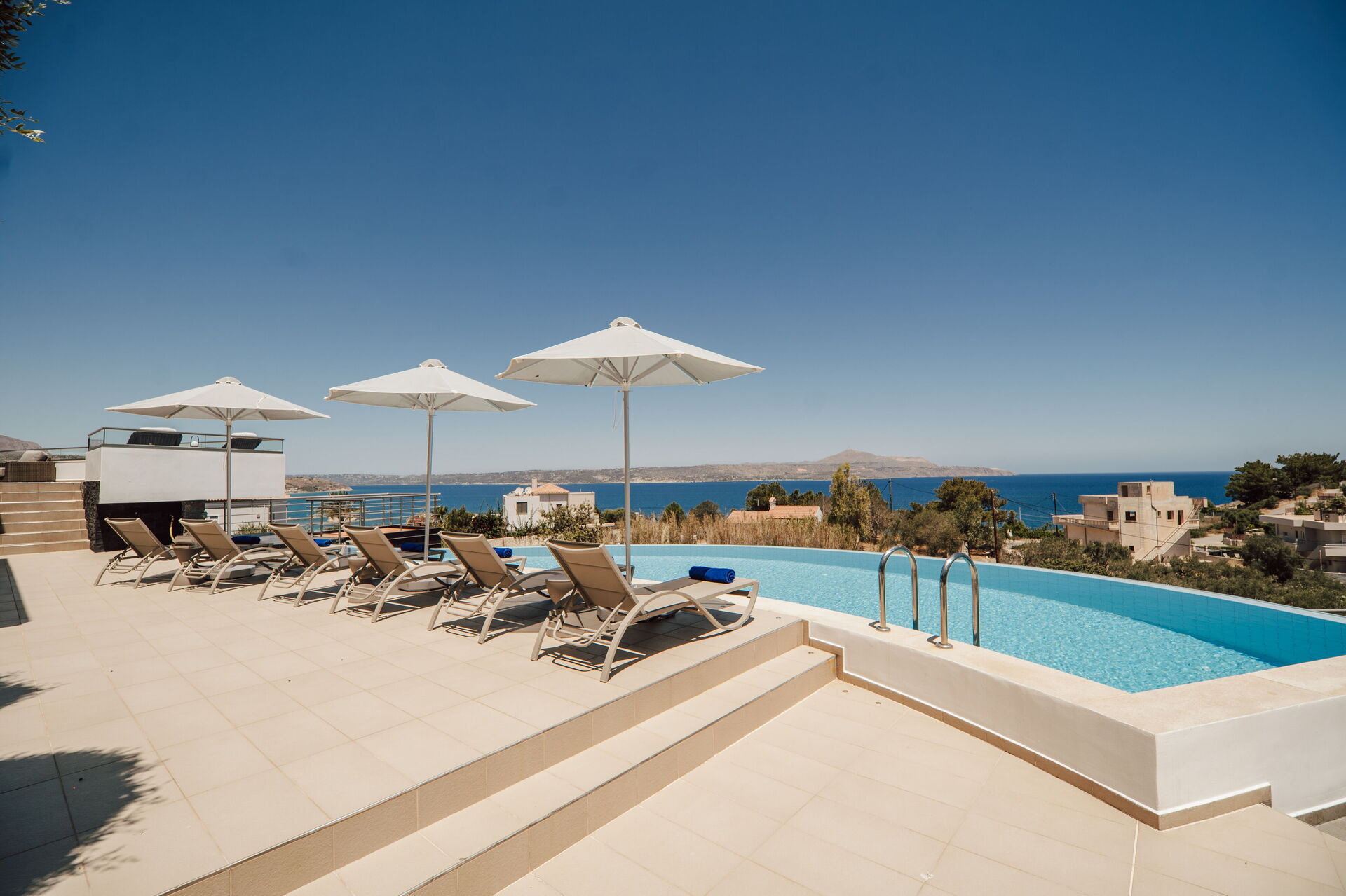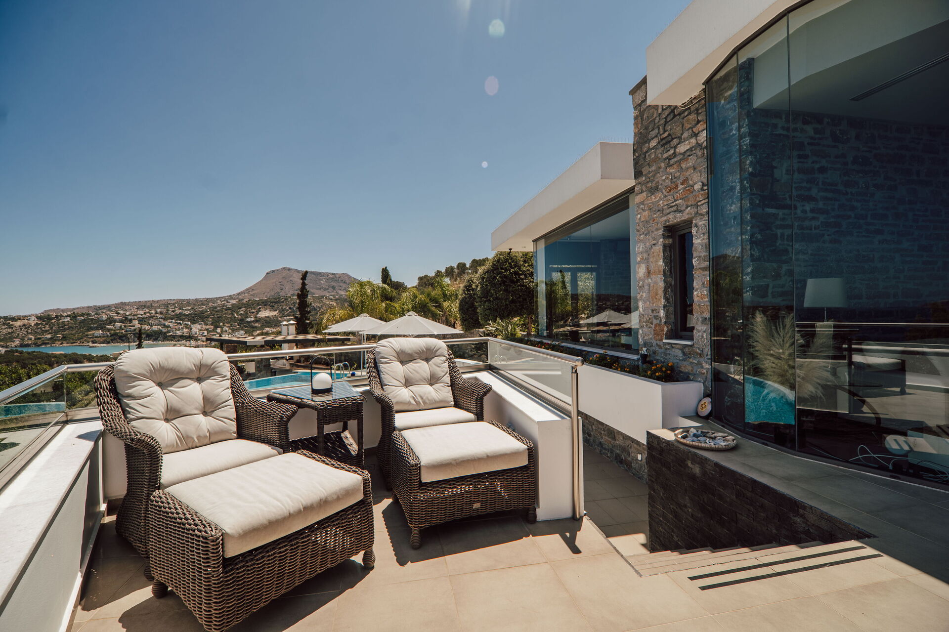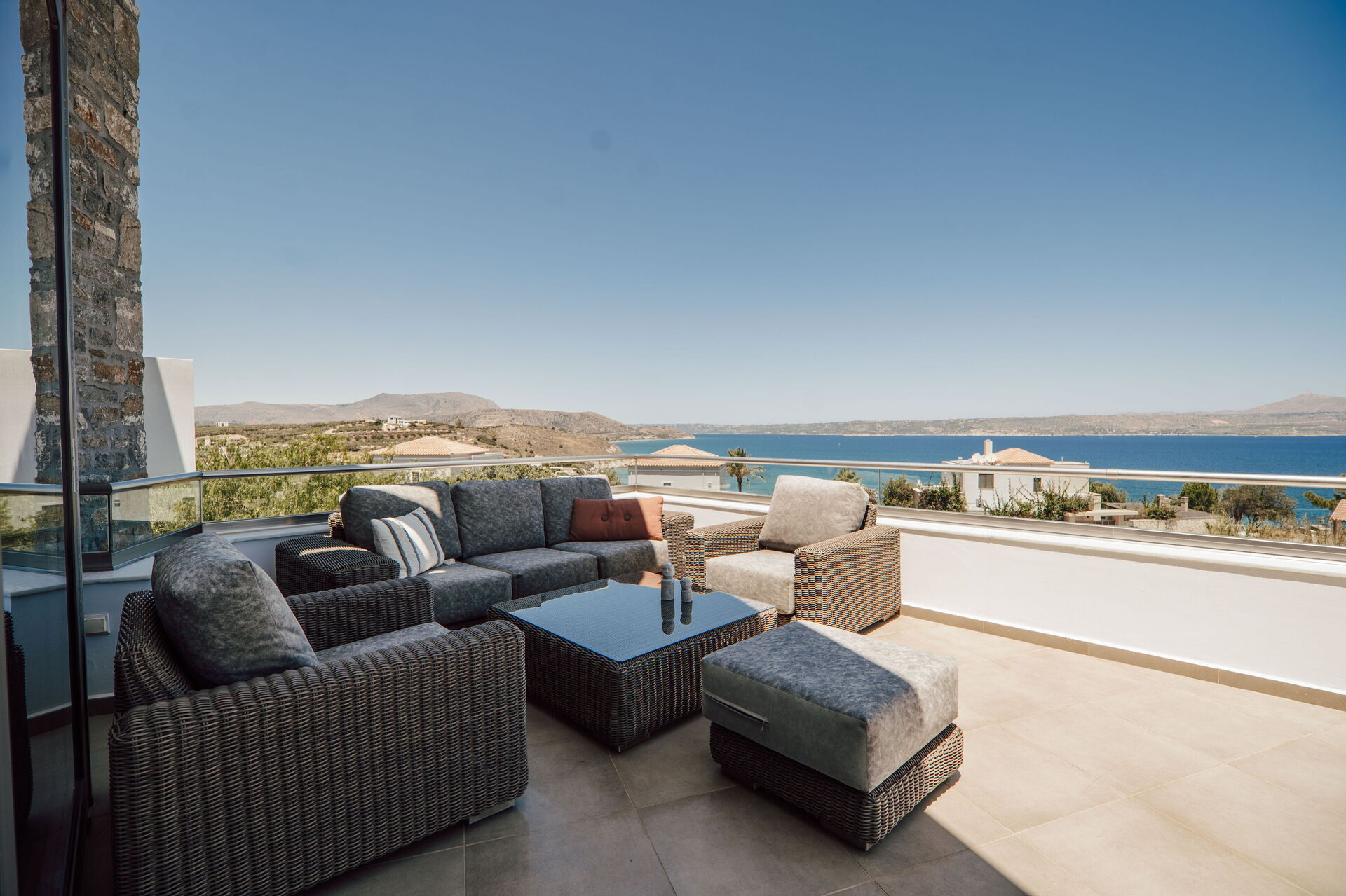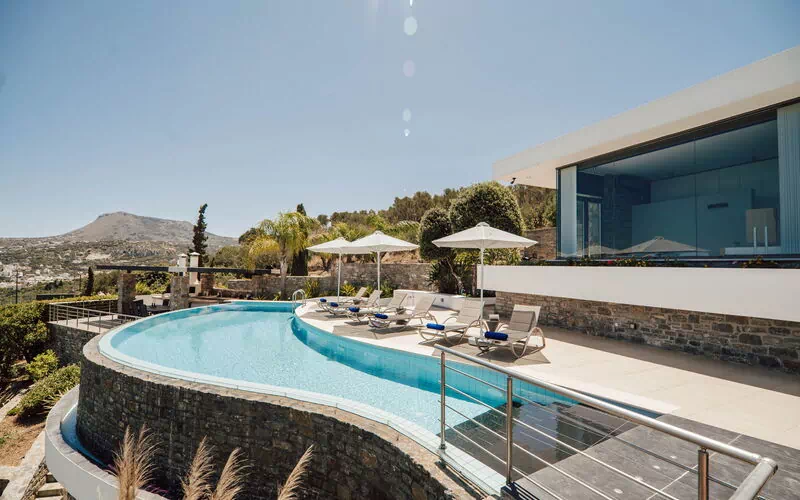 All'esterno sono presenti delle splendide terrazze panoramiche e attrezzate con i lettini dove potersi rilassare accarezzati dalla brezza costiera e dove potersi godere la vista mozzafiato sulla baia di Souda e sul mare cristallino di Creta.