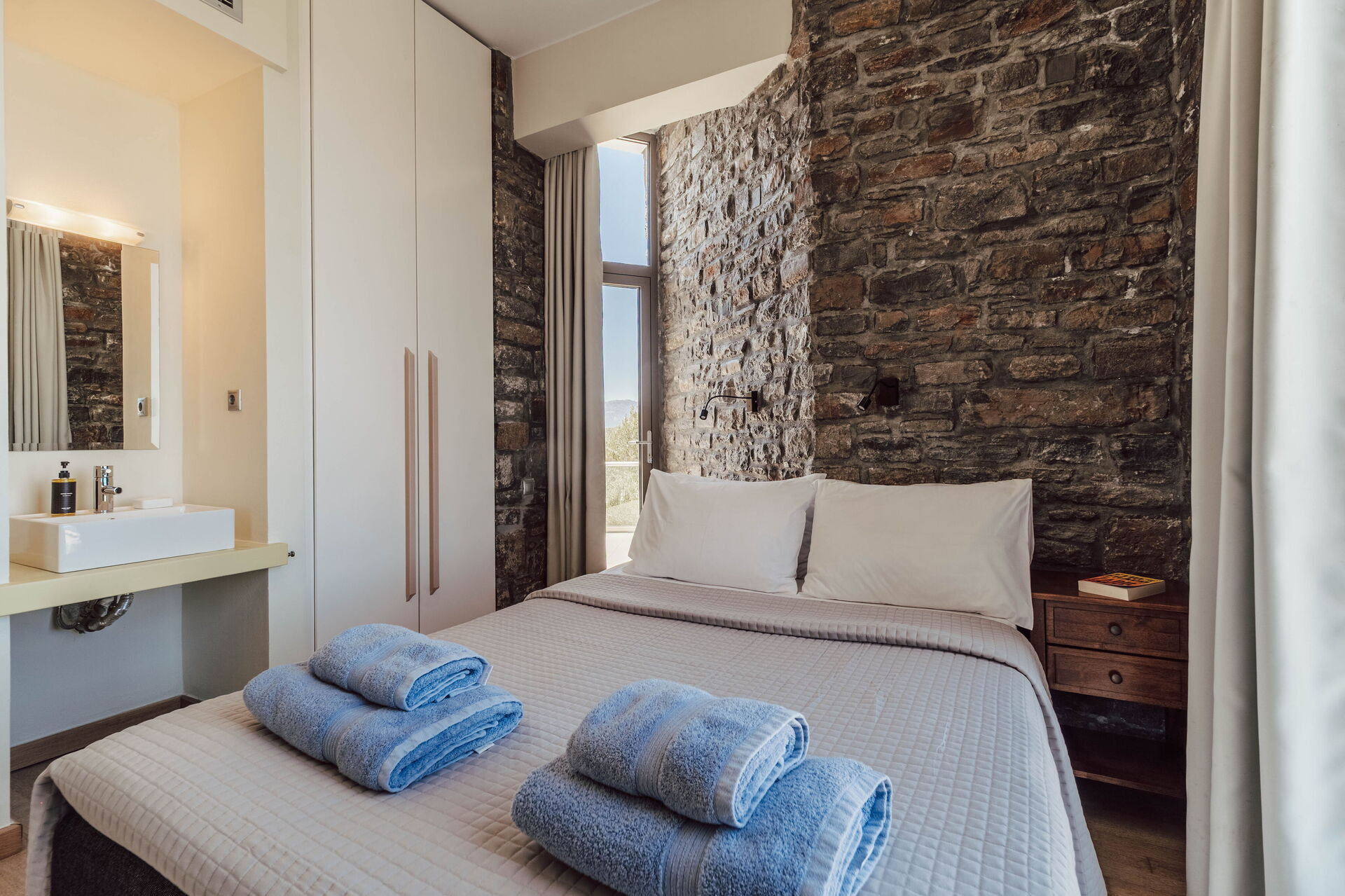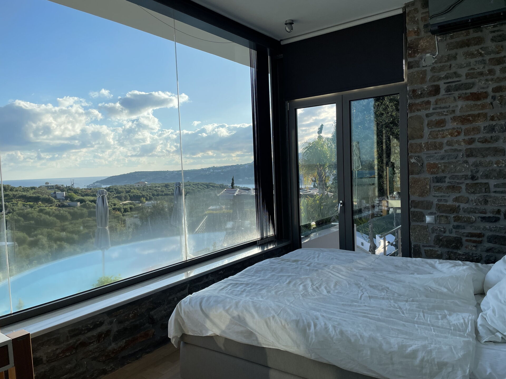A stunning villa. Every bedroom was fantastic with comfortable beds. Master bedroom had the most beautiful views, as did the balcony and pool. The outdoor kitchen is very special and there was the lovely touch of herbs growing behind the worktop so you could use these if you wanted. At night this whole outdoor area was beautiful. There is a small cove a 10 minute walk away - steep hill back but I liked the walk. Almyrida was a ten minute walk away and all the restaurants were fabulous. Beach there is also fabulous. I’d advise taxi back at night as it’s pitch black on road, but it was only 6/7 euros for four of us or 10 euros if five of us. The coffee shop and mini market, a couple of minute walk away, was fabulous for coffee and ice creams. Very friendly. Stroll into Almyrida for a bigger shop that sells fruit, salad, veg and a greater selection of food. Our host, Vivian, was very helpful and even organised a perfectly placed table on the beachfront at Elia & Thyme for my mum’s birthday, along with the most dazzling and delectable dessert. The villa really is gorgeous and well placed.