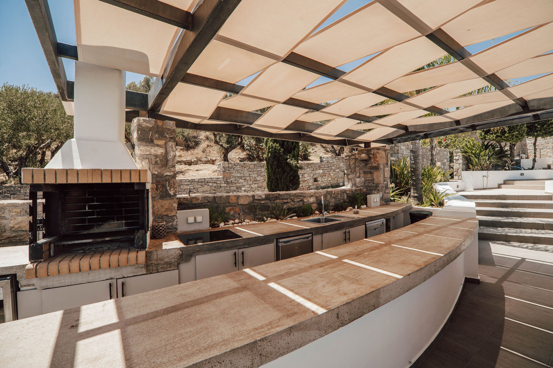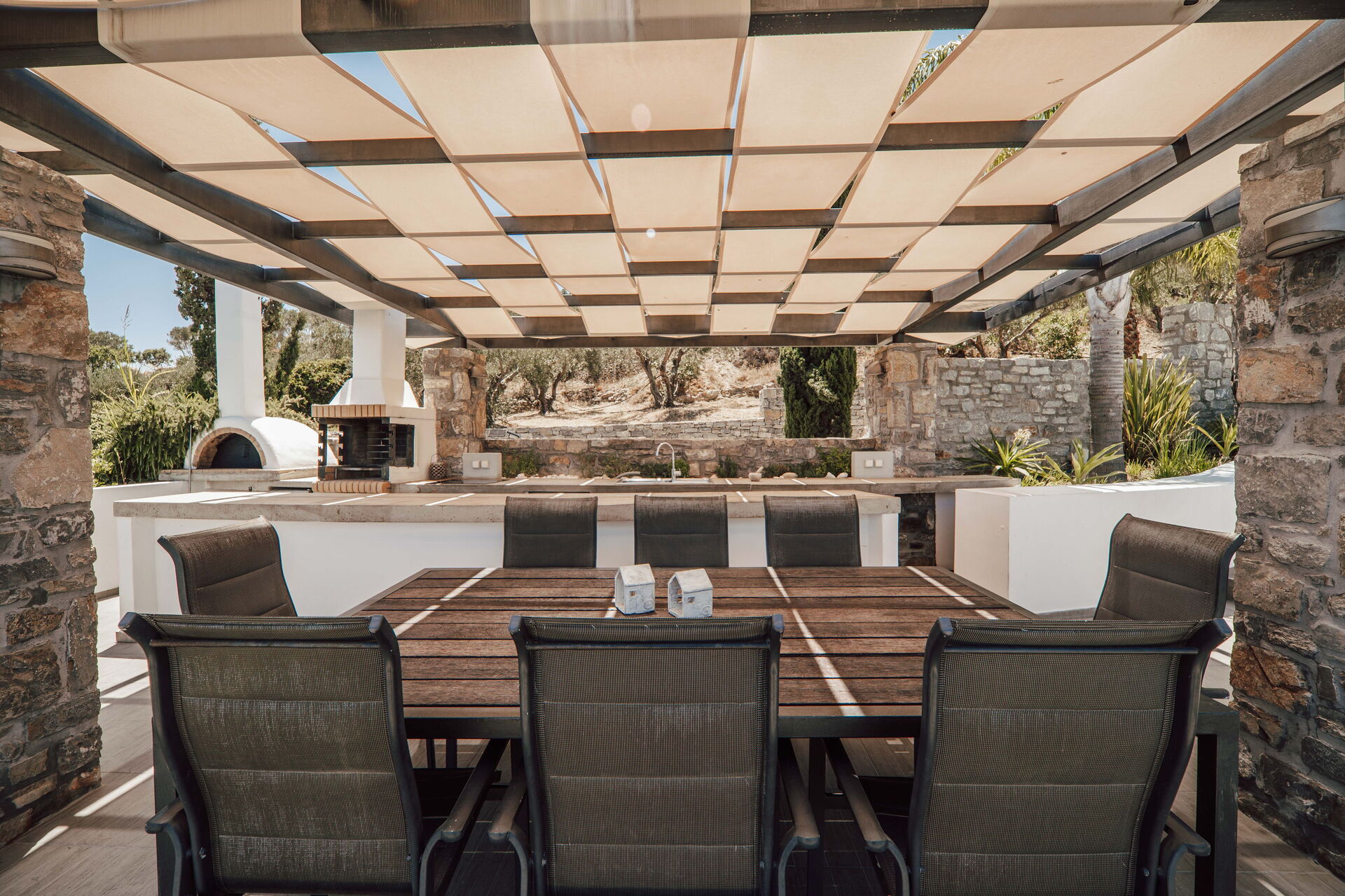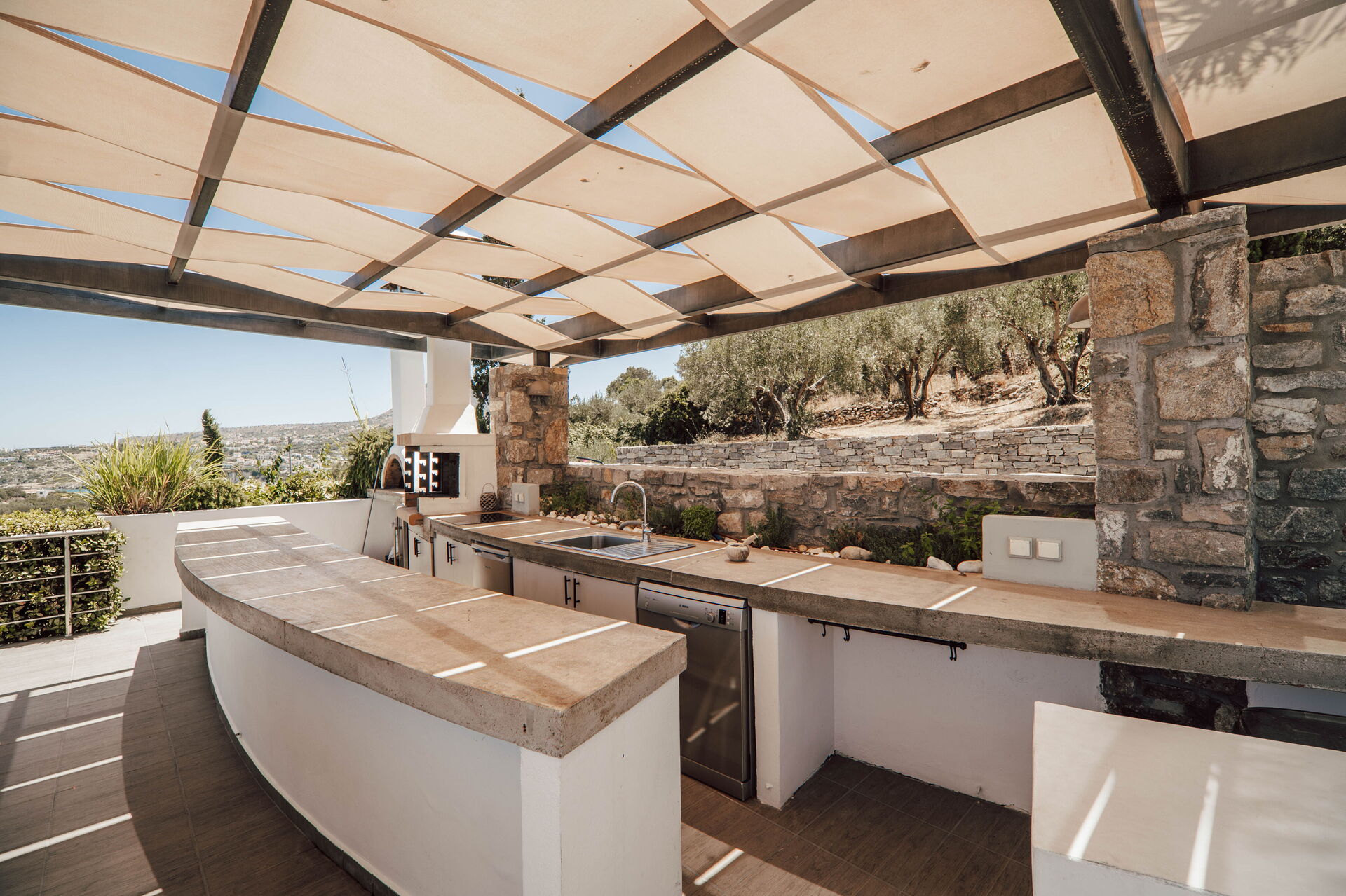 The outdoor dining area/kitchen has both a BBQ, a wood fired pizza oven, and also a fridge, electric hob and wine fridge. Also a dishwasher with sufficient cutlery, plates and glasses so that you don't need to bring anything down from the villa except the food. It has a large shaded dining table.