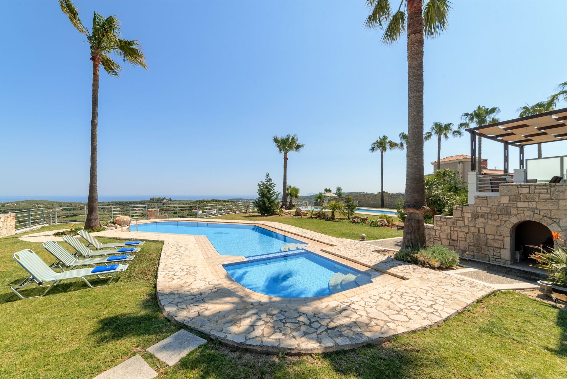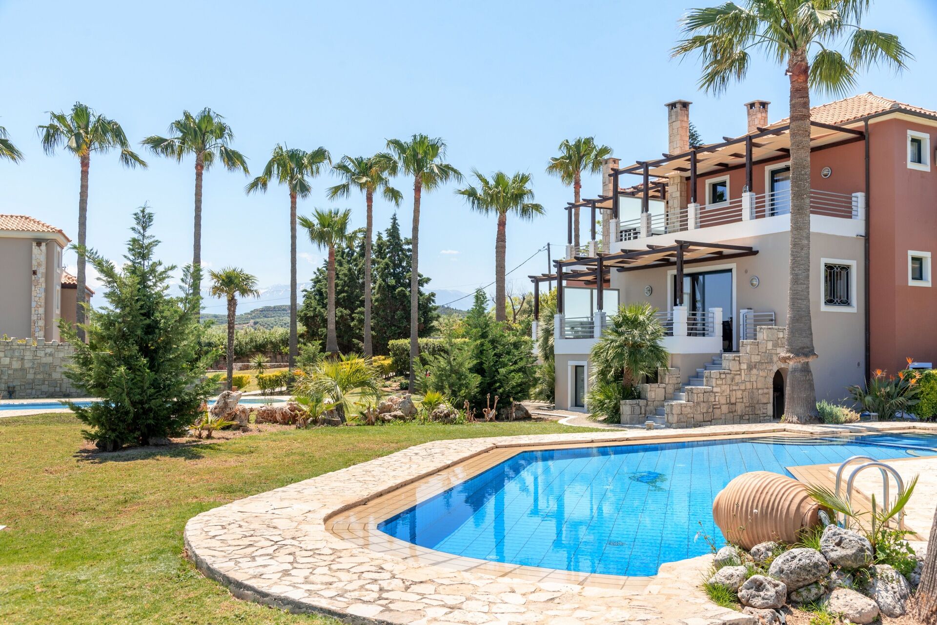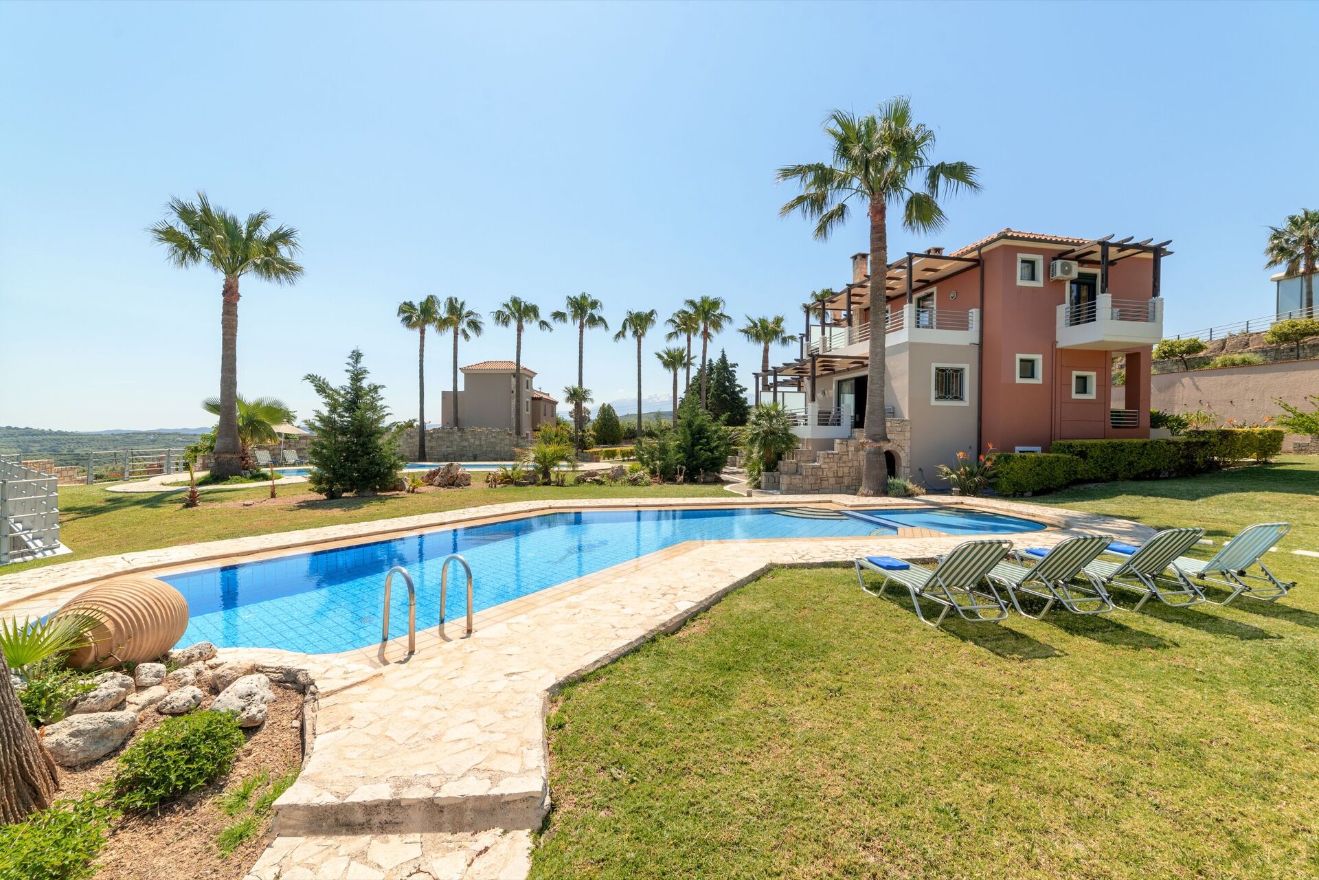 The stay at this villas was very good, the pool was very nice, we did notice the beds were quite hard. i would suggest its time to replace those matrasses ;) a car is needed for this stay. its generally a 10 to 5 minute drive to the supermarket or small town and 25 minute drive to Chania. we went with 7 persons and we had a great time.
