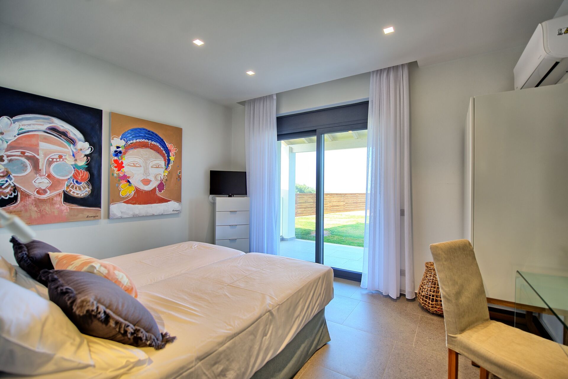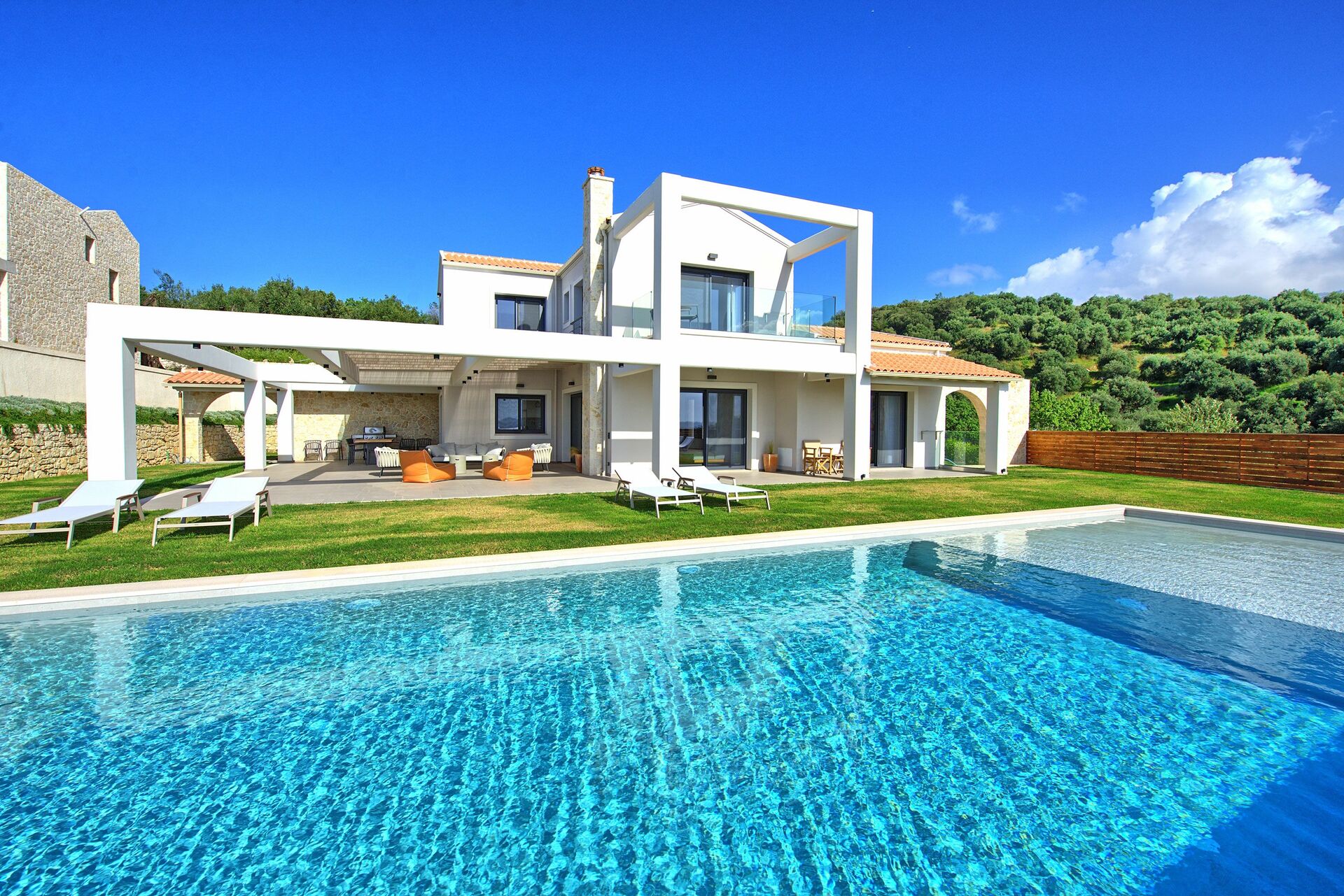 The house, unlike other villas we experienced in Corfu, was a modern masterpiece, with every detail being thought out. Electrical black out blinds keep the sun's brightness at bay in all 3 bedrooms, allowing you to wake at your own pace. AC so up-to-date and effective, it could be in a million dollar mansion in Miami. The house includes three en-suite double showers with great pressure, a full and modern kitchen, a large flat screen TV with HDMI plugin, open, light, indoor outdoor flow with screens on every window and door and a washer and dryer. We grilled on the BBQ, hung out on the bean bag chairs and outdoor dining table, and took constant dips in the pool as the sun beat down amidst the beautiful backdrop.