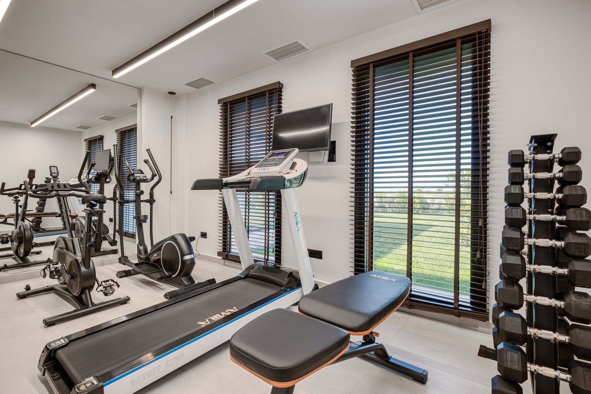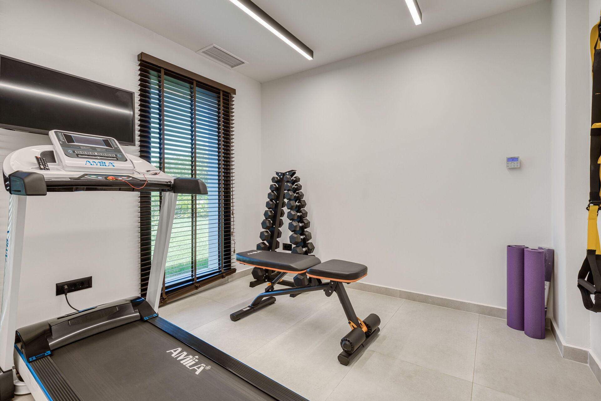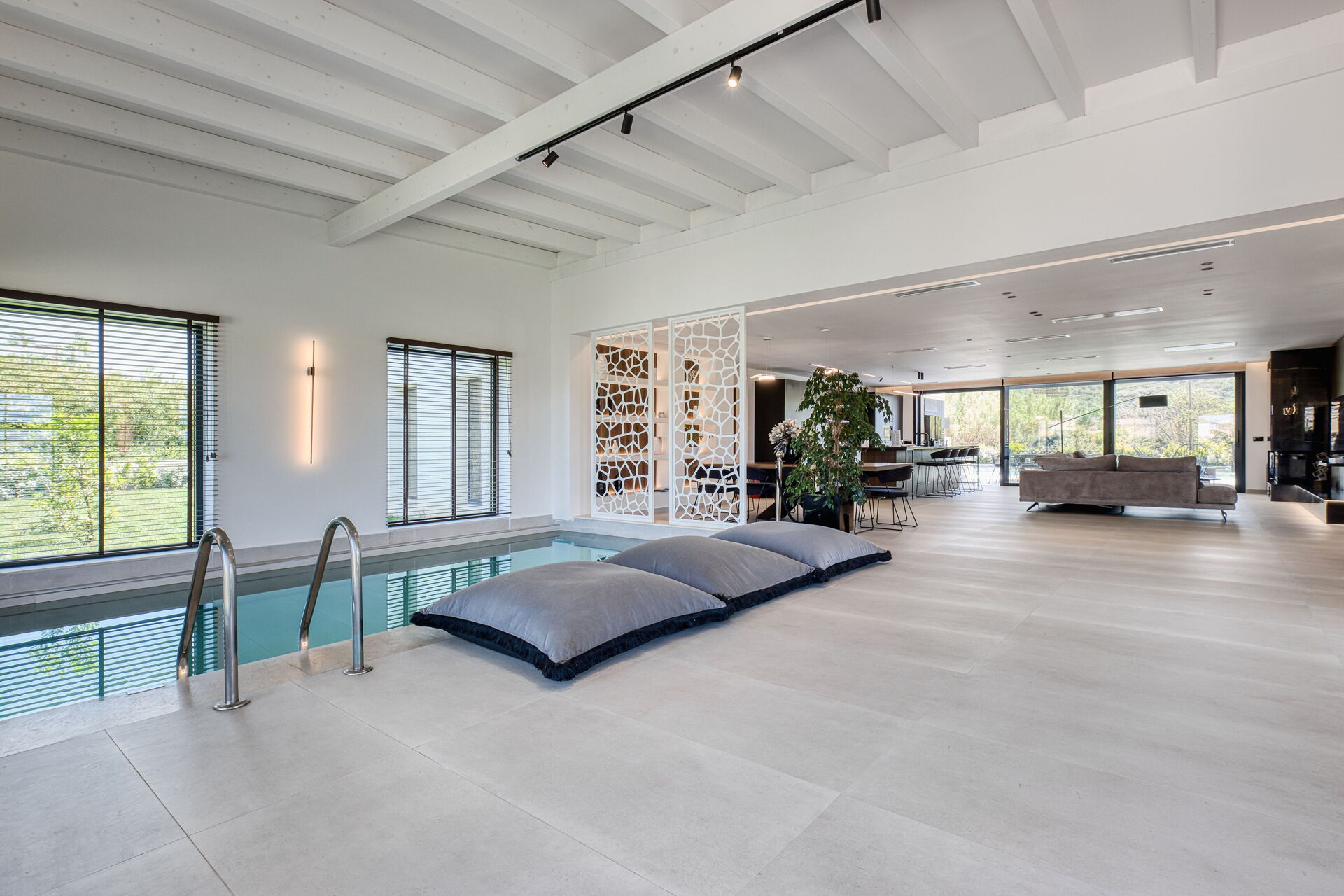 Piano terreno: ampia e luminosa zona giorno composta da soggiorno con camino e smart TV, zona pranzo e cucina ben attrezzata (forno, freezer, frigorifero, lavastoviglie, cantinetta frigo per vini, macchina da caffè espresso, bollitore, tostapane), zona con piscina interna (5 x 3 metri, profondità: 1,1 metri), 4 suite matrimoniali ognuna con bagno privato con doccia, camera con 2 letti singoli e bagno privato con doccia, palestra (tapis roulant, cyclette, stepper, TRX bands, tappetini e manubri).