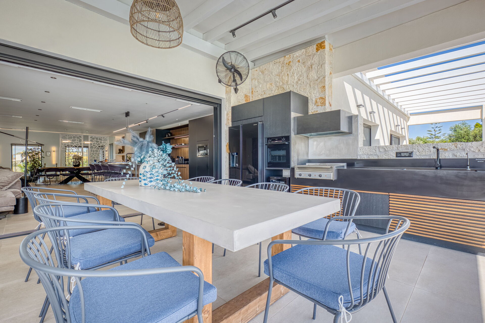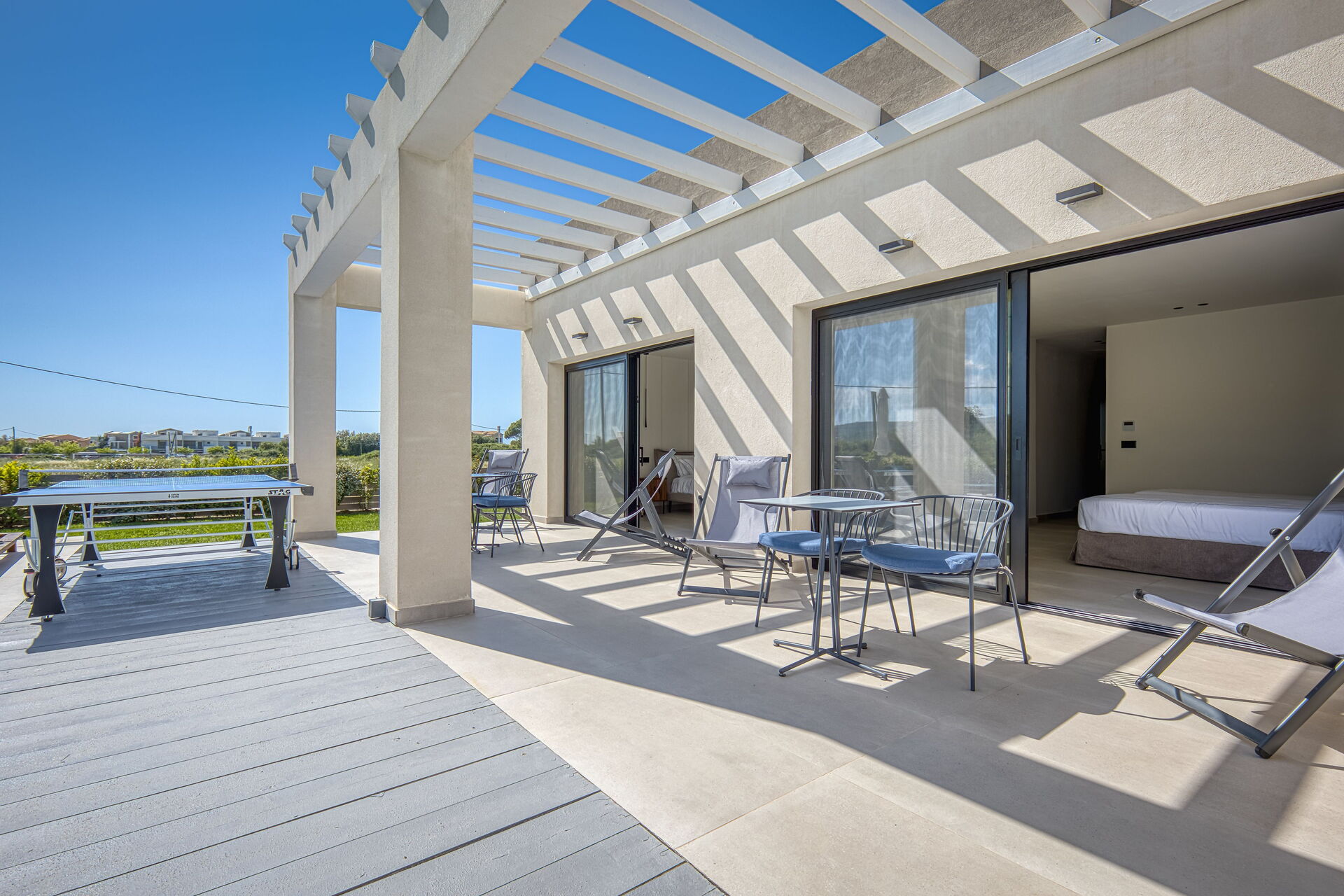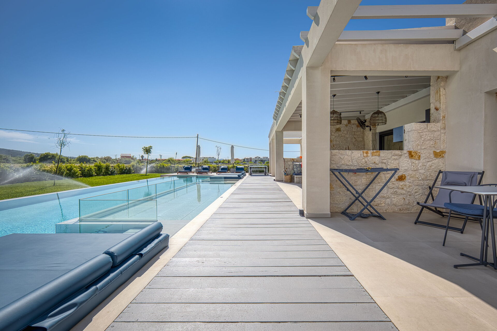 Esternamente presenta un giardino ben curato e recintato, una fantastica piscina, un angolo giochi per bambini, un comodo solarium e una zona attrezzata (doppio frigorifero, macchina di produzione del ghiaccio, barbecue elettrico, forno e cantinetta frigo per vini) per cucinare e mangiare all'aria aperta godendosi il clima mediterraneo tipico della Grecia.