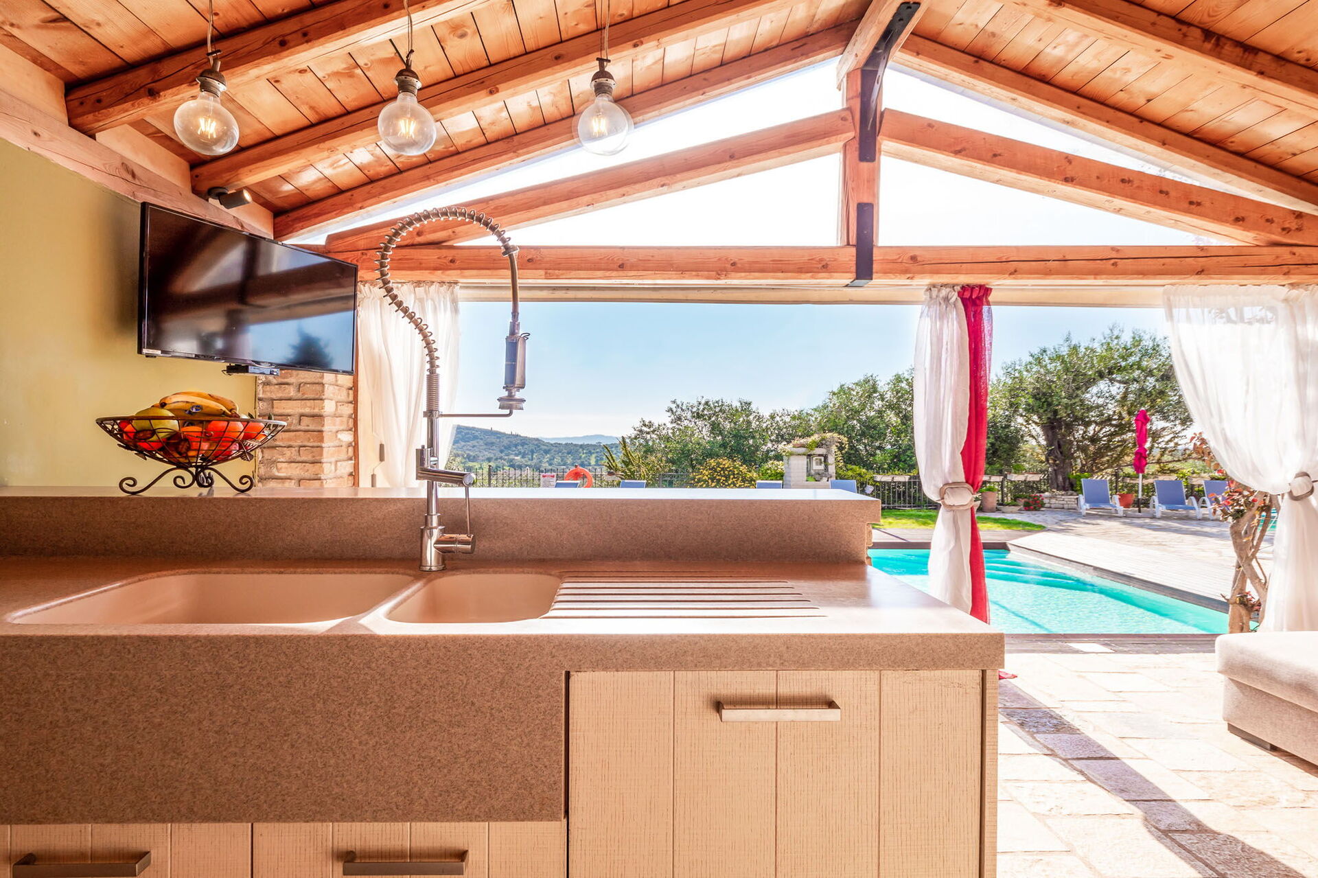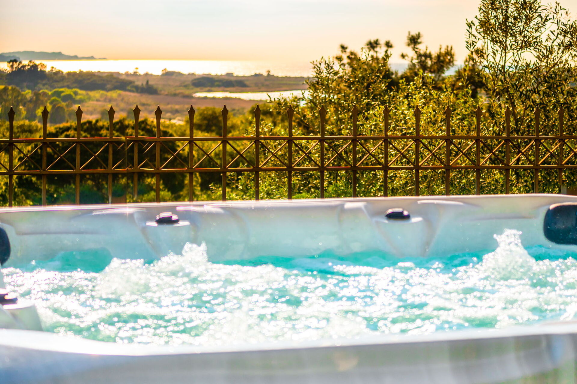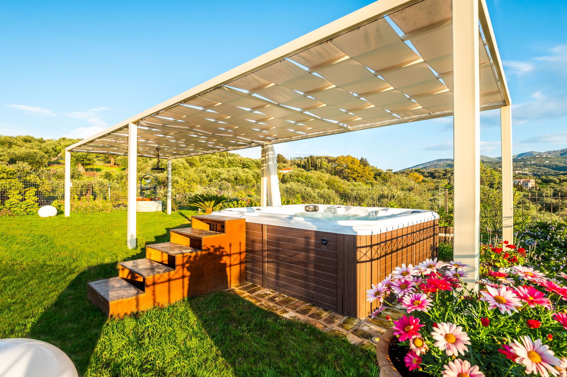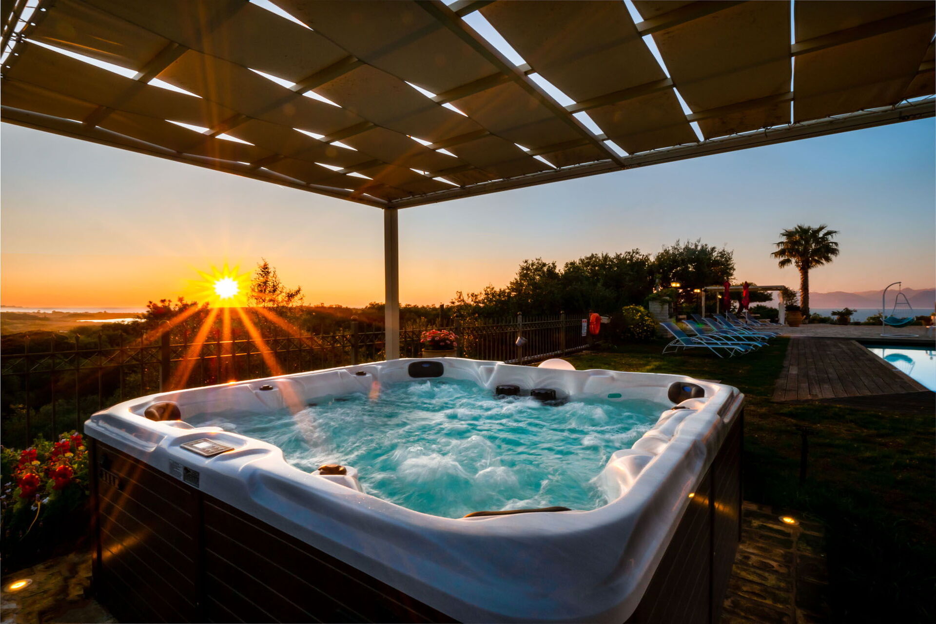 Una bella piscina (riscaldabile su richiesta e con un prezzo extra) e una spettacolare vasca idromassaggio con 7 sedute sono ad esclusiva disposizione degli ospiti di Villa Irida, così come gli spazi esterni e la spettacolare sala esterna con cucina e grande zona pranzo con affaccio sulla piscina e sul giardino; questa sala ha un sistema di vetrate che possono essere completamente aperte nelle giornate più soleggiate oppure chiuse per garantire protezione da vento o dalle temperature più fresche.