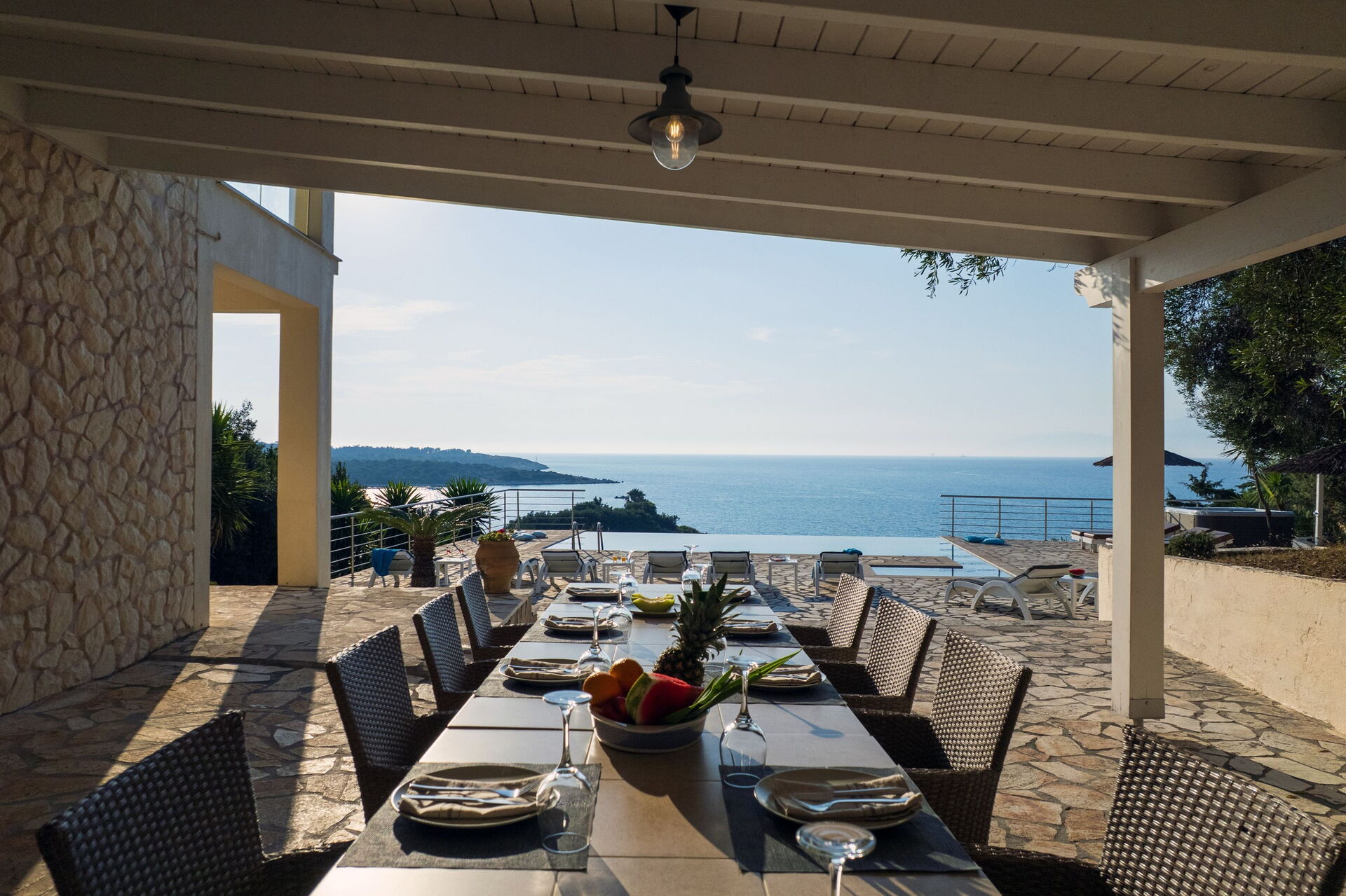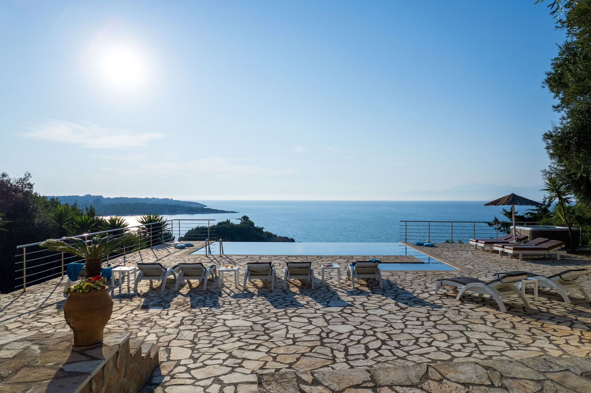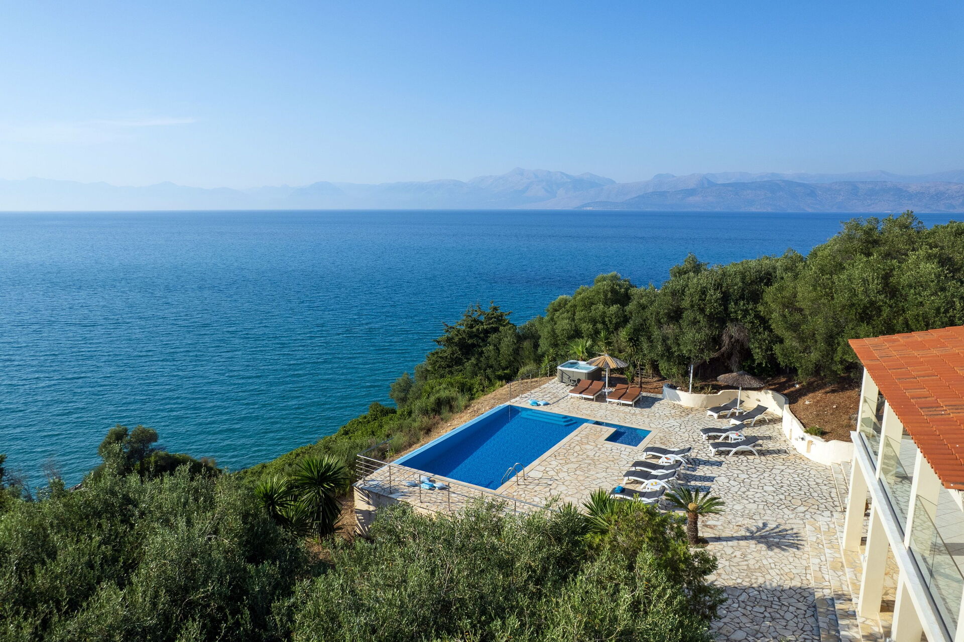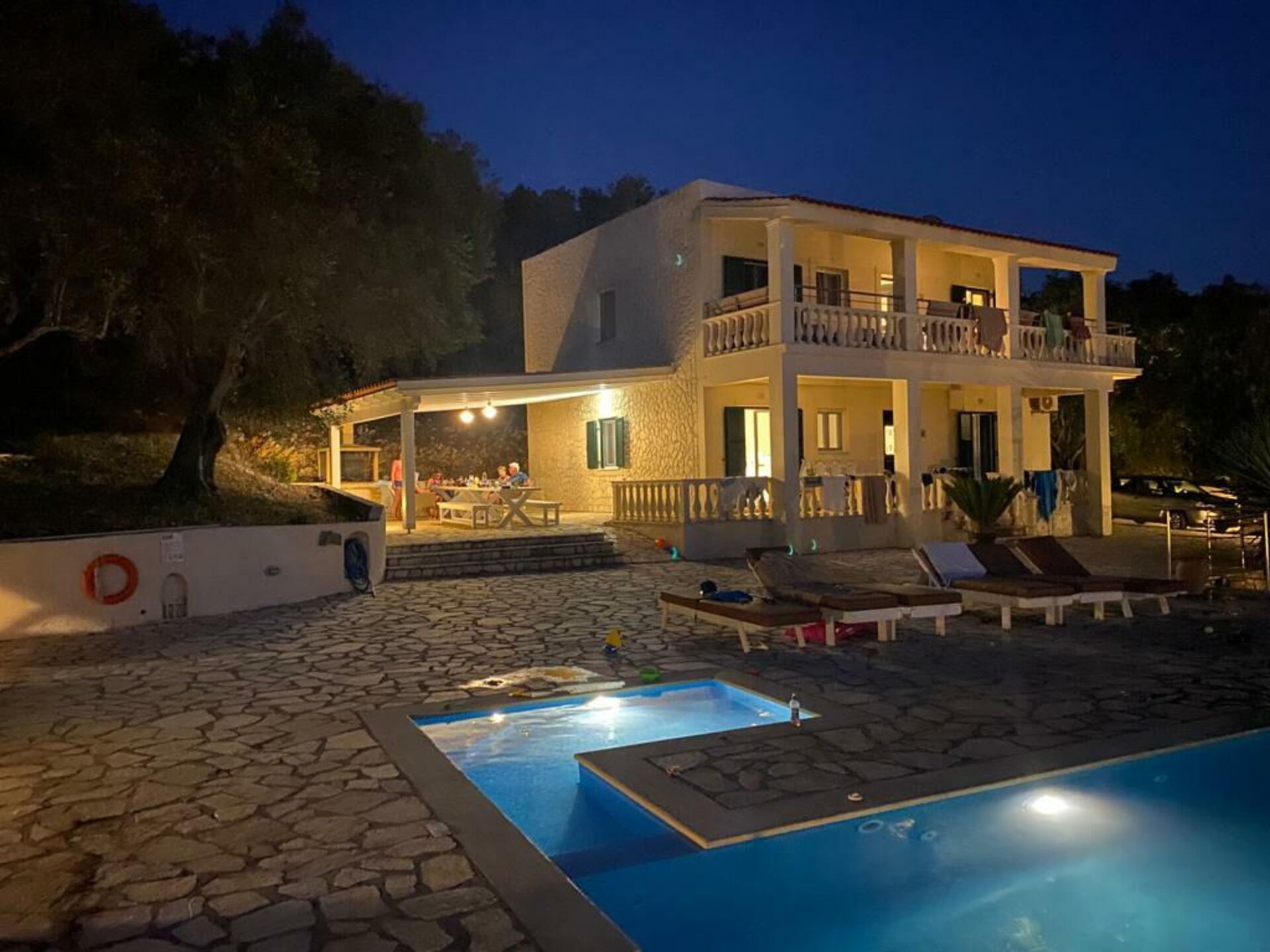 Our party of1 10 7 adults and 3 children 8 to14 spent 10 days at this beautiful Villa.With incredible Views across the sea and to Albania.The outdoor was perfect for our BBQ’s with plenty of seating undercover.The infinity pool and Jacuzi were just a magnet for everyone.We could have done with some more sun shades though 3 was just not enough for 10 people..Situated just minutes walk away from a mini market and supermarket as well as a couple of Tavernas.The lovely beach was also just a short walk away.We had a great stay.A couple of suggestions.Another bin for recycling and some bin liners would be helpful.Also an information book with emergency telephone numbers and local information ie Taxi phone numbers would b also have been helpful