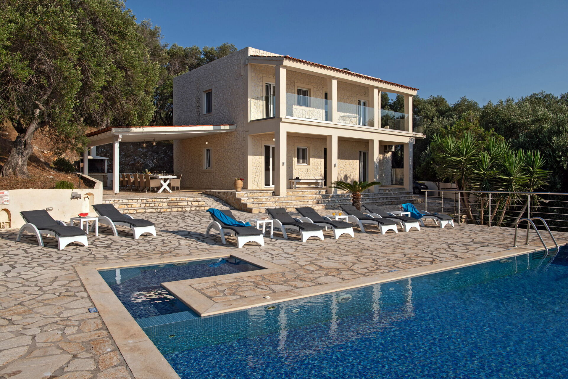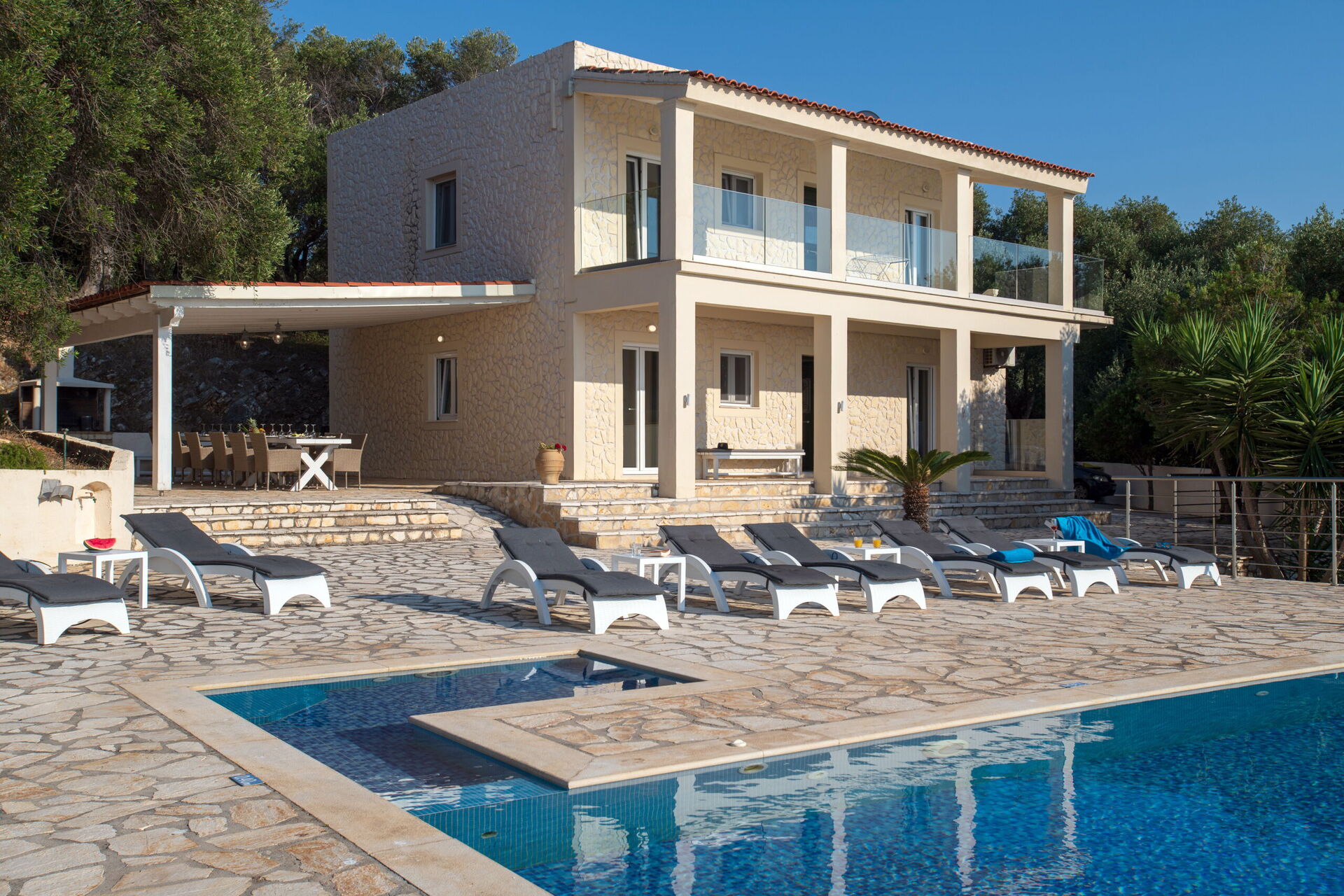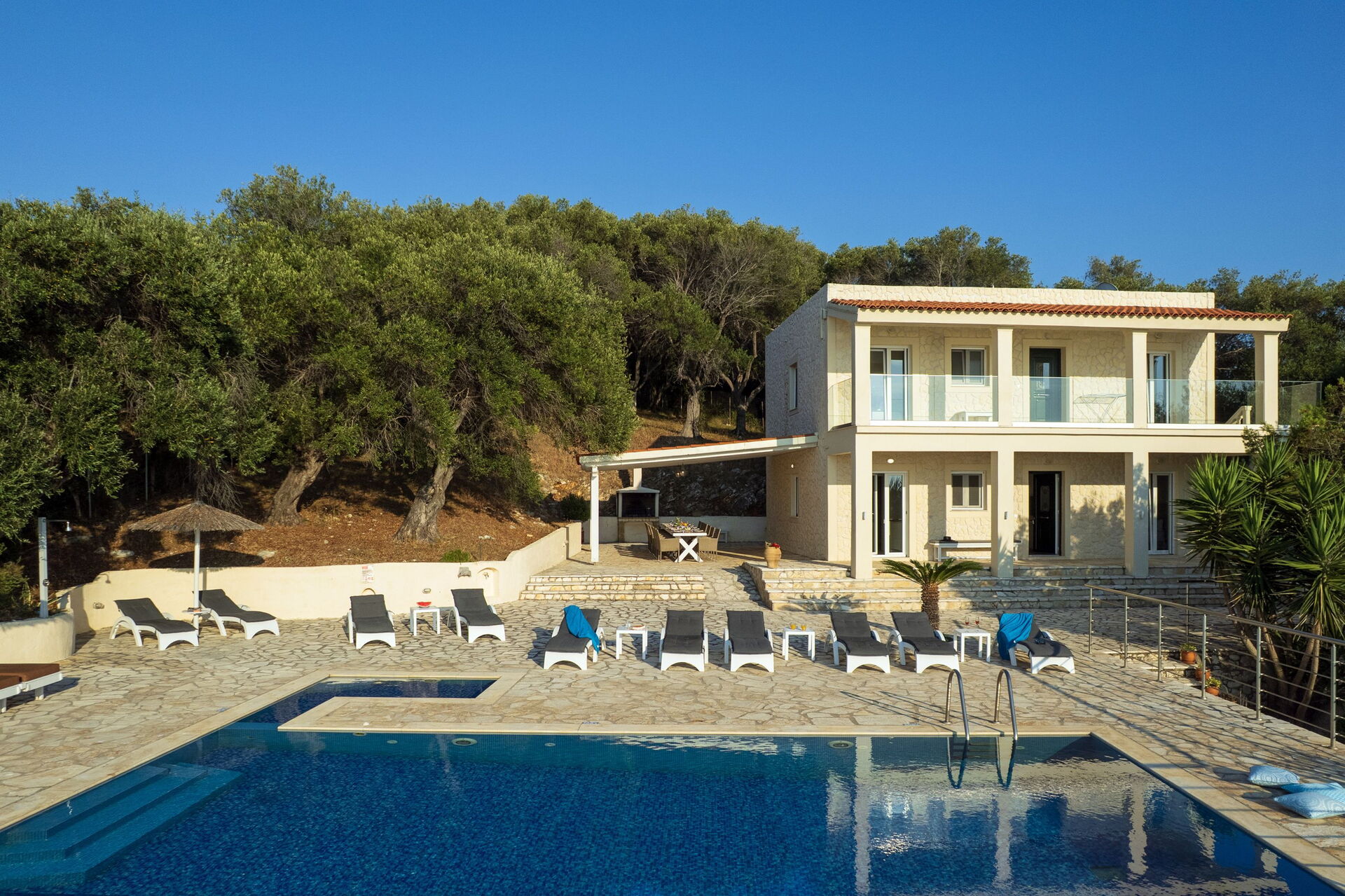 Our party of1 10 7 adults and 3 children 8 to14 spent 10 days at this beautiful Villa.With incredible Views across the sea and to Albania.The outdoor was perfect for our BBQ’s with plenty of seating undercover.The infinity pool and Jacuzi were just a magnet for everyone.We could have done with some more sun shades though 3 was just not enough for 10 people..Situated just minutes walk away from a mini market and supermarket as well as a couple of Tavernas.The lovely beach was also just a short walk away.We had a great stay.A couple of suggestions.Another bin for recycling and some bin liners would be helpful.Also an information book with emergency telephone numbers and local information ie Taxi phone numbers would b also have been helpful