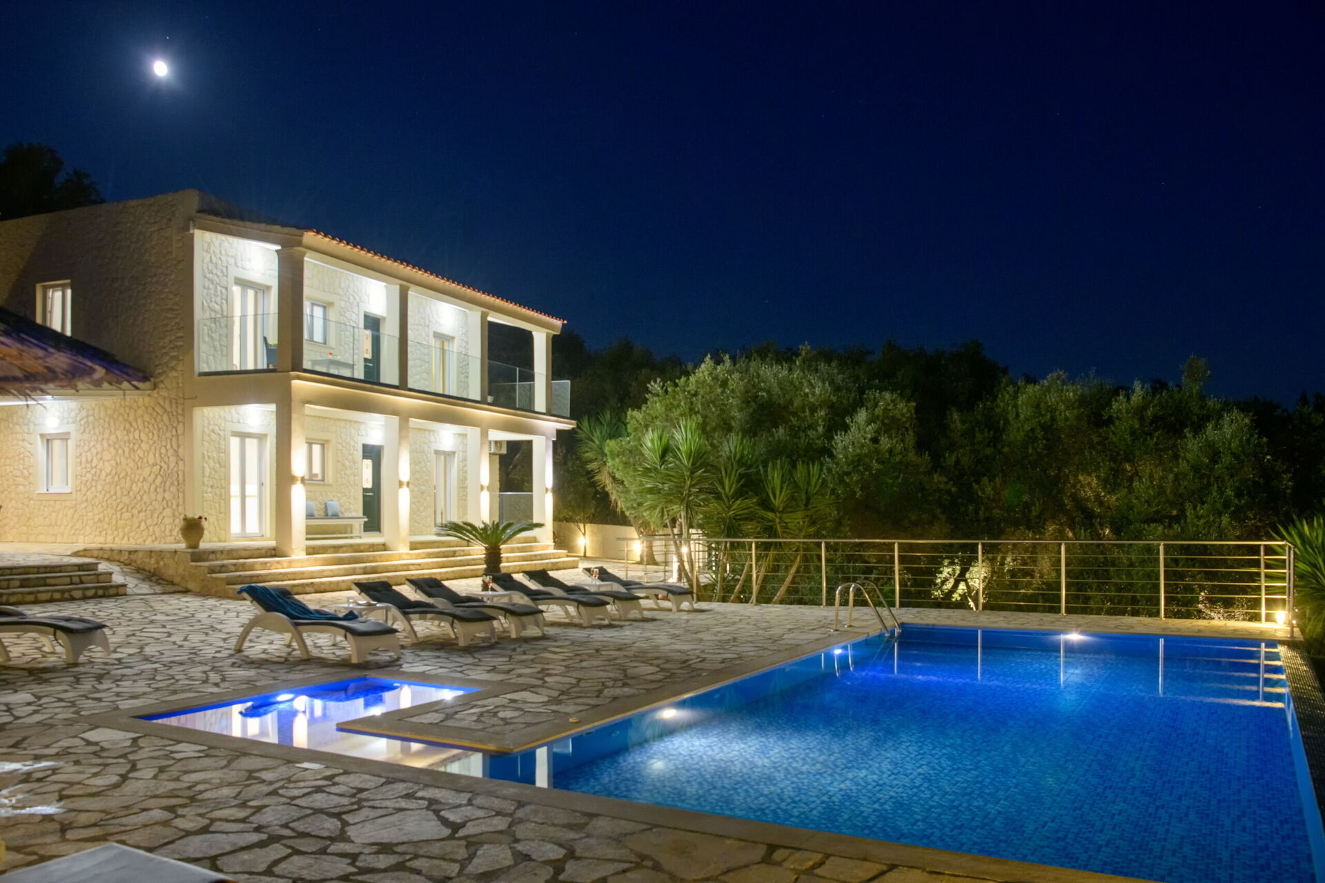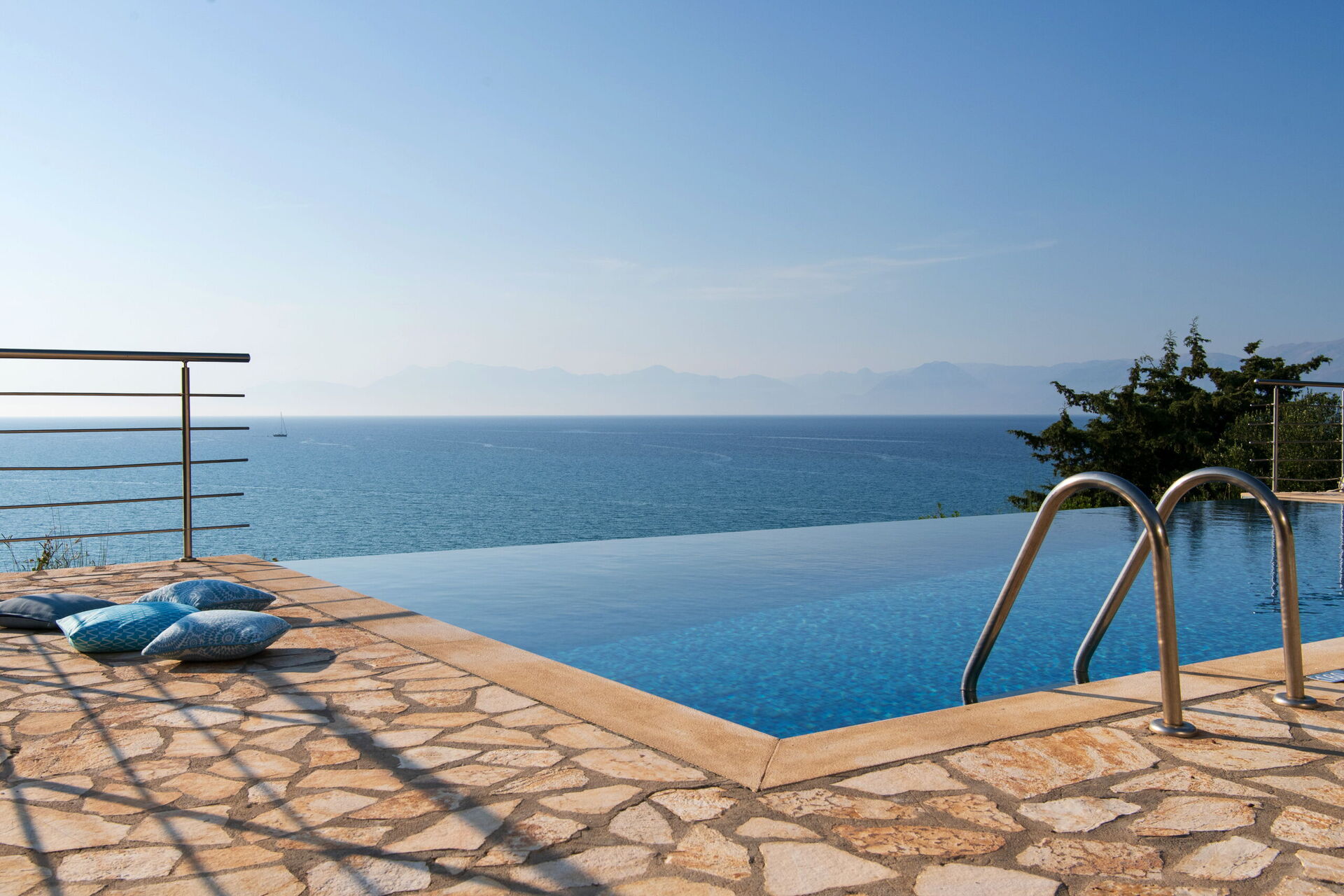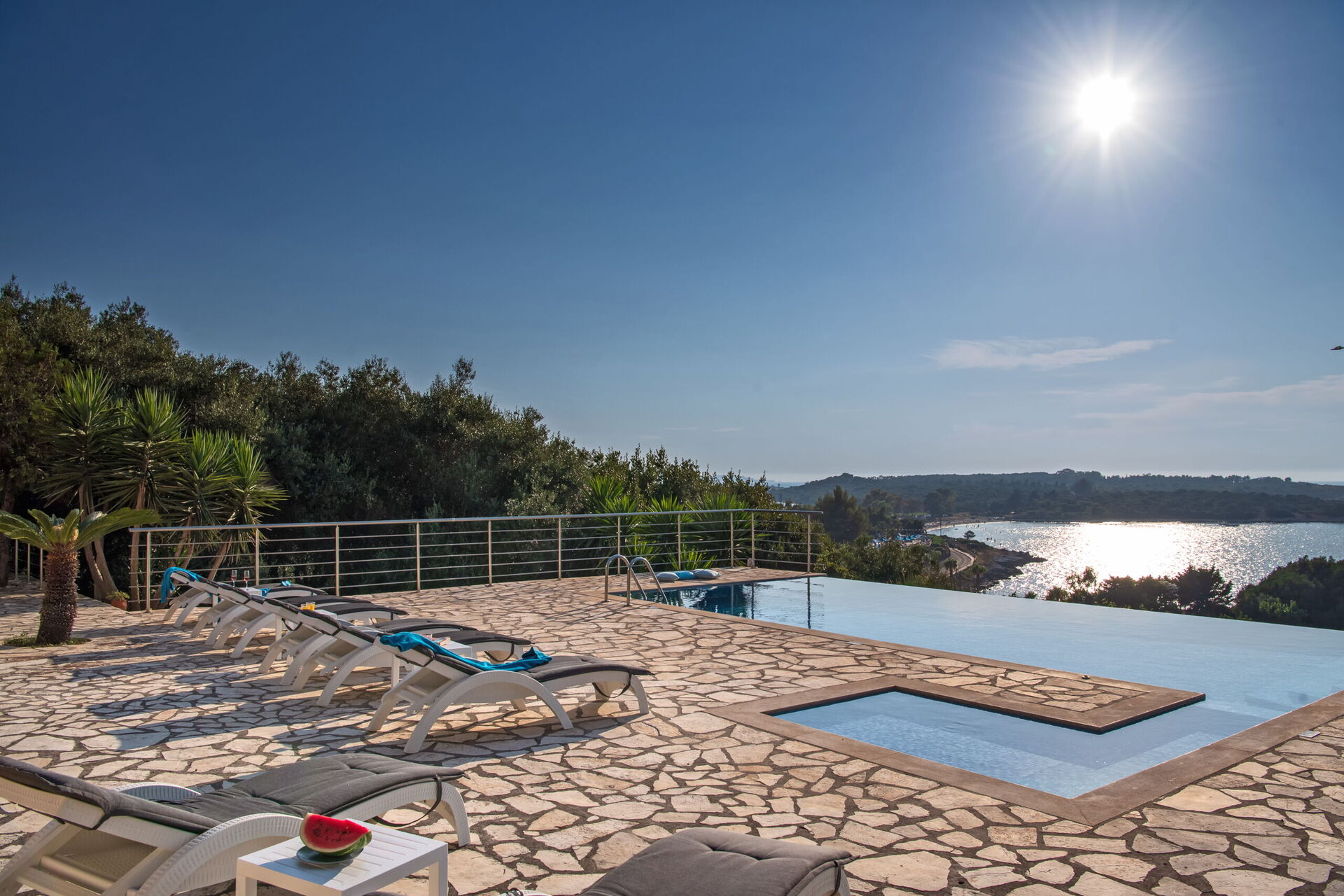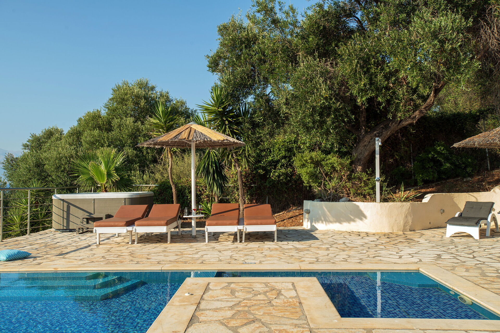 Our party of1 10 7 adults and 3 children 8 to14 spent 10 days at this beautiful Villa.With incredible Views across the sea and to Albania.The outdoor was perfect for our BBQ’s with plenty of seating undercover.The infinity pool and Jacuzi were just a magnet for everyone.We could have done with some more sun shades though 3 was just not enough for 10 people..Situated just minutes walk away from a mini market and supermarket as well as a couple of Tavernas.The lovely beach was also just a short walk away.We had a great stay.A couple of suggestions.Another bin for recycling and some bin liners would be helpful.Also an information book with emergency telephone numbers and local information ie Taxi phone numbers would b also have been helpful