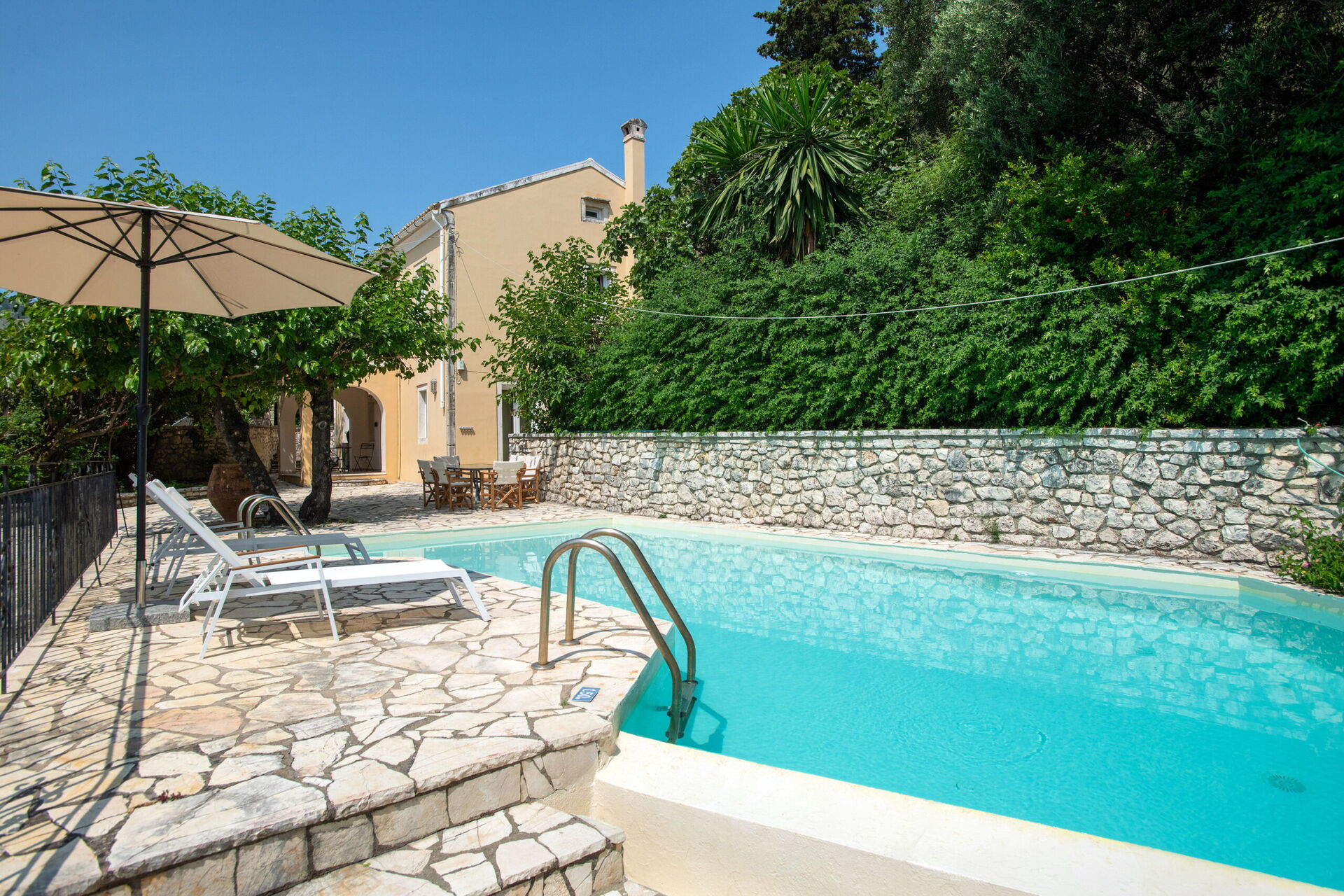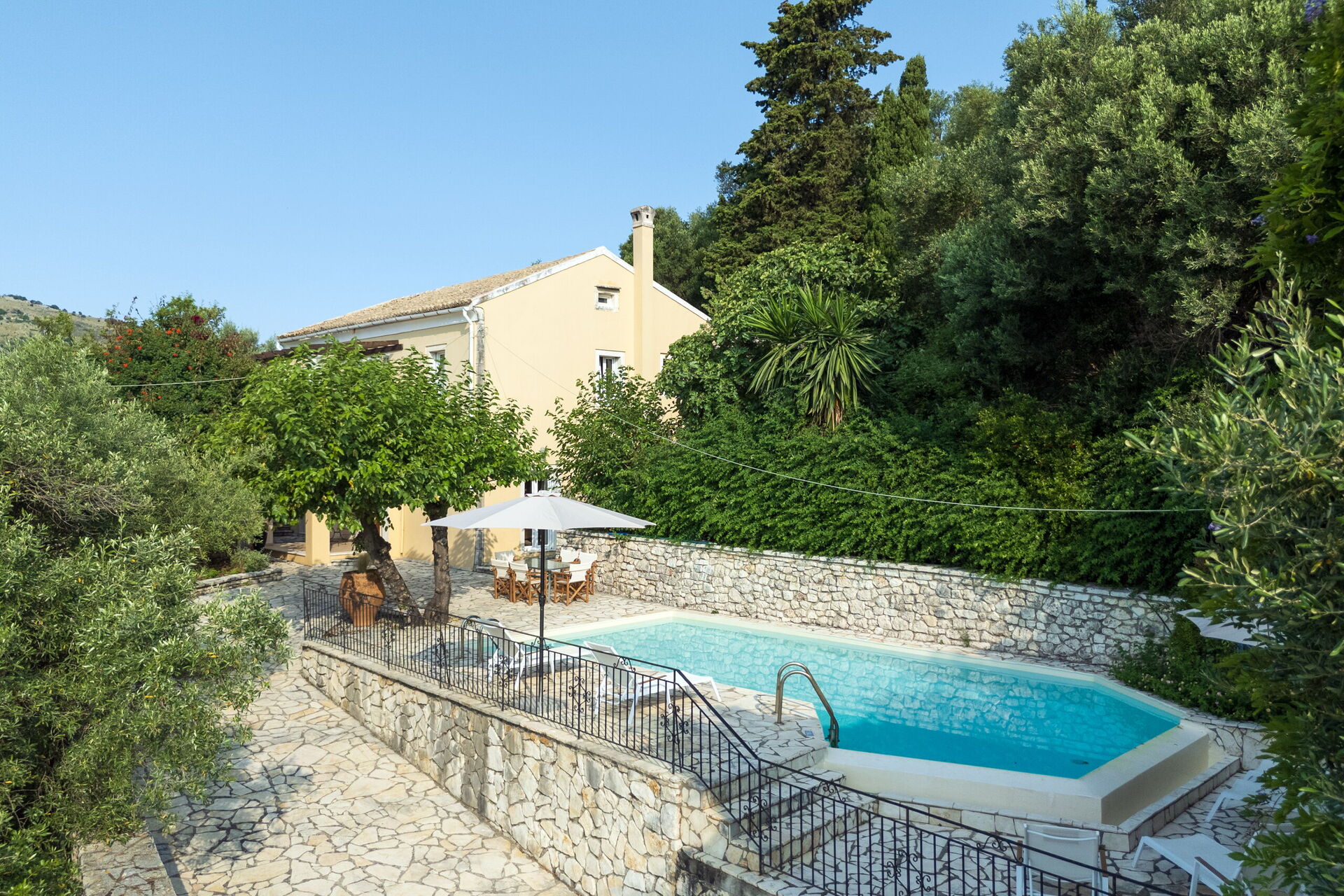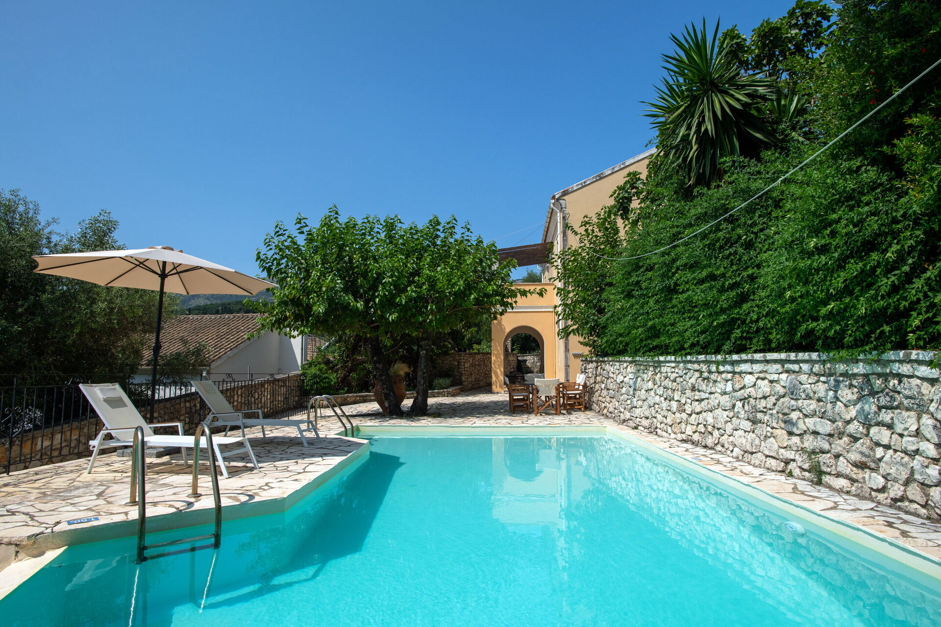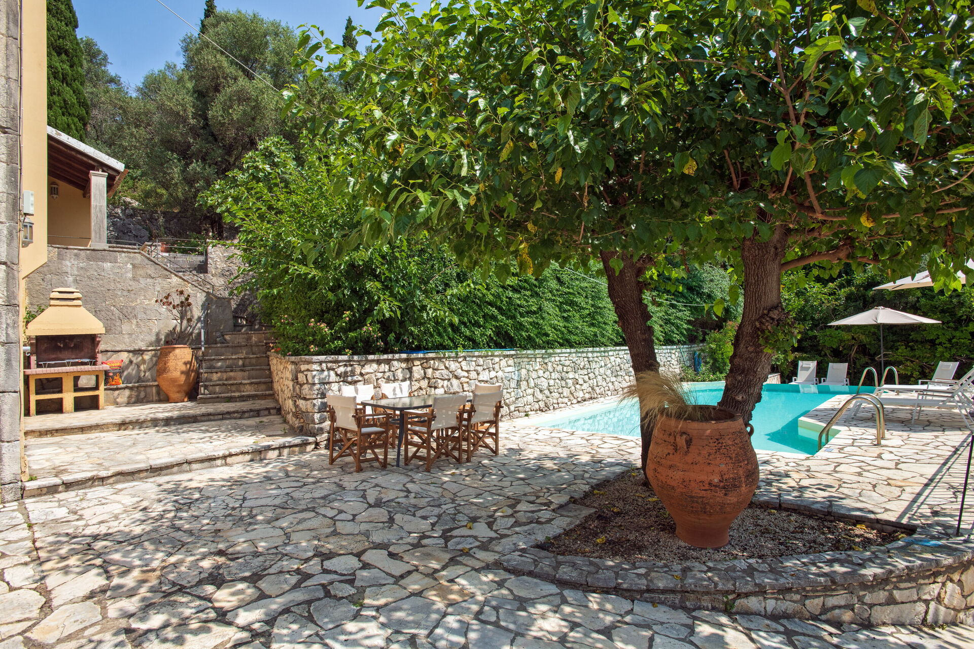 All'esterno, la casa mette a disposizione degli ospiti una fantastica piscina riscaldabile, in modo da rendere gradevoli i bagni anche nelle stagioni più fresche. Vi è, inoltre, un'area barbecue attrezzata con tavoli e sedie per poter comodamente mangiare all'aperto insieme ad amici e familiari. Pur essendo situata nel paese di Kassiopi, Villa Moyria garantisce una buona privacy grazie a cipressi e olivi che circondano la casa.