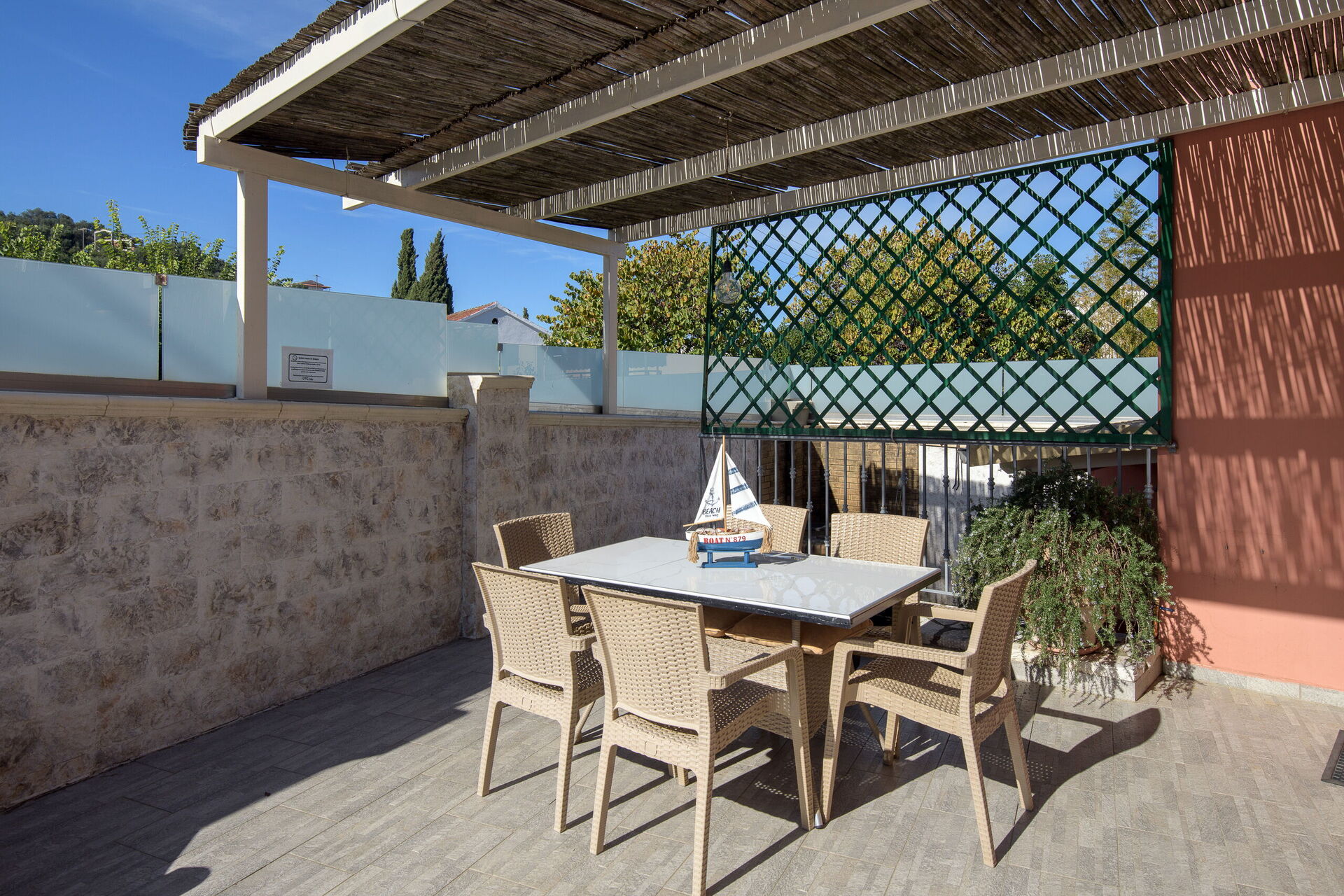 Spazio esterno attrezzato con tavolo e sedie per 6 persone.